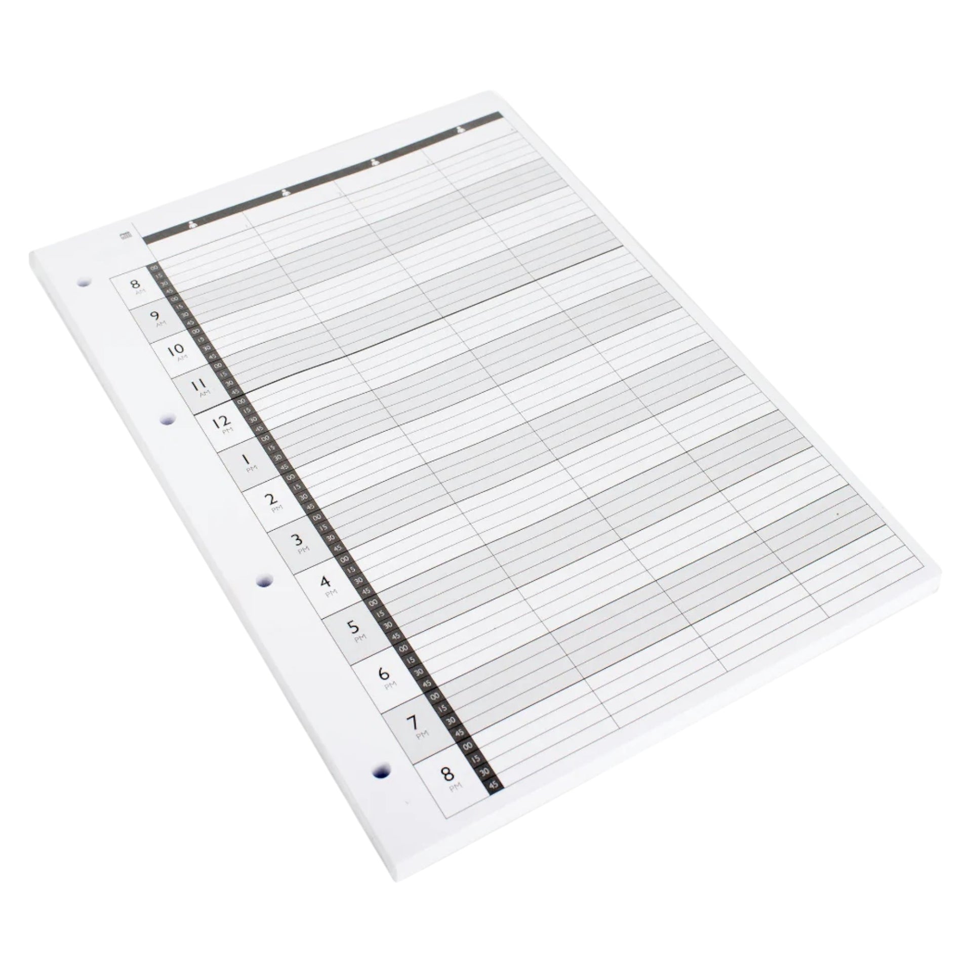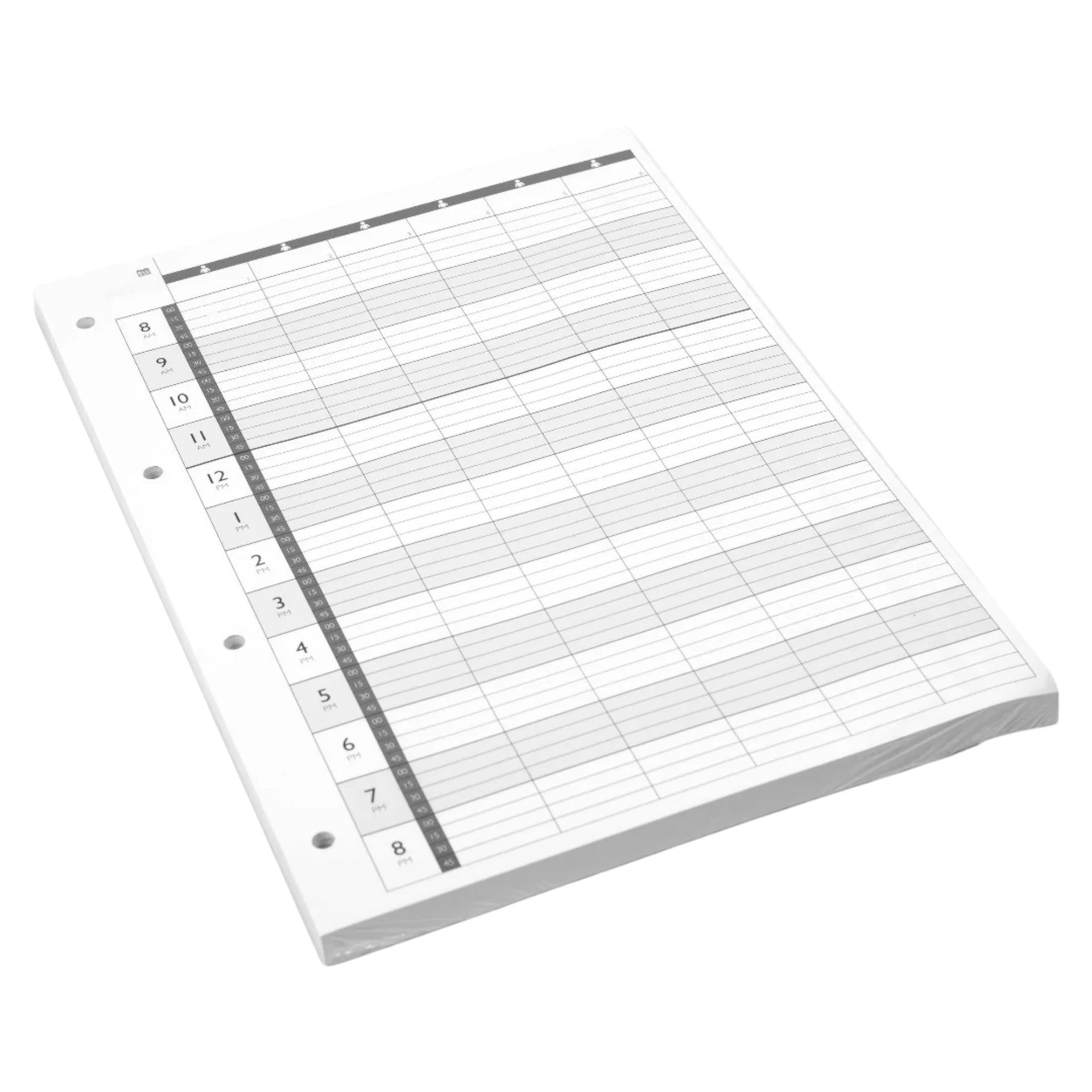 Available in four different column configurations to suit businesses of varying sizes, the 4 Column Assistant and 6 Column Assistant are perfect for smaller to medium-sized establishments, whilst the 9 Column and 12 Column options accommodate larger operations with multiple staff members or treatment rooms. Each page features precisely drilled holes that align perfectly with their corresponding Agenda ring binders (LLB1, LLB2 or LLB3), ensuring smooth page turning and a professional appearance. The premium paper stock provides an excellent writing surface that resists ink bleed-through, maintaining legibility and preventing appointments from becoming smudged or illegible over time. This versatile appointment system grows with your business, allowing you to add additional pages during busy periods or remove unnecessary sheets during quieter times, creating a truly bespoke scheduling solution that perfectly meets your specific business requirements.