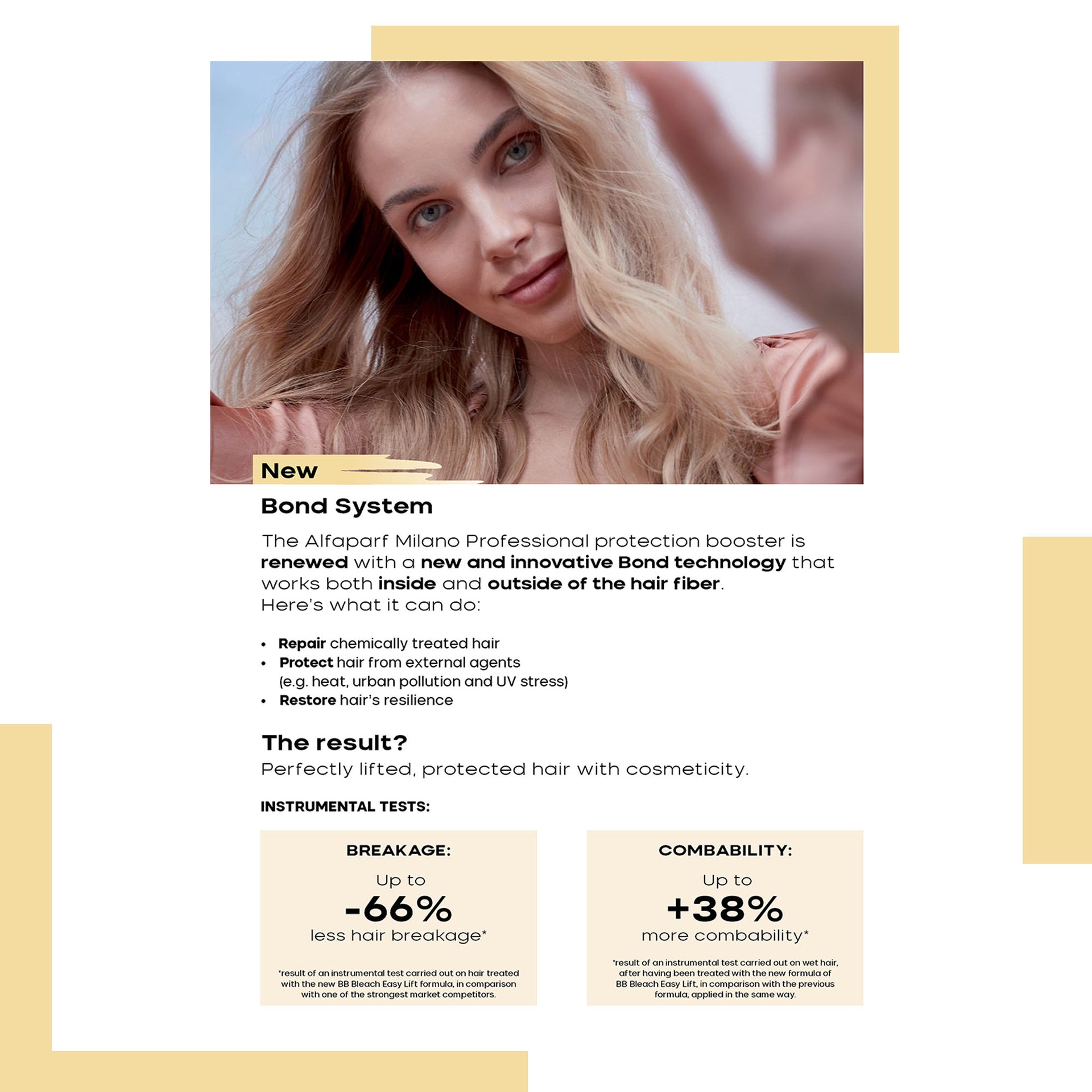 Mix with ALFAPARF MILANO PROFESSIONAL Oxid’o in a 1:1 ratio. Apply to dry, unwashed hair and check regularly for desired lift. Maximum processing time: 50 minutes.
