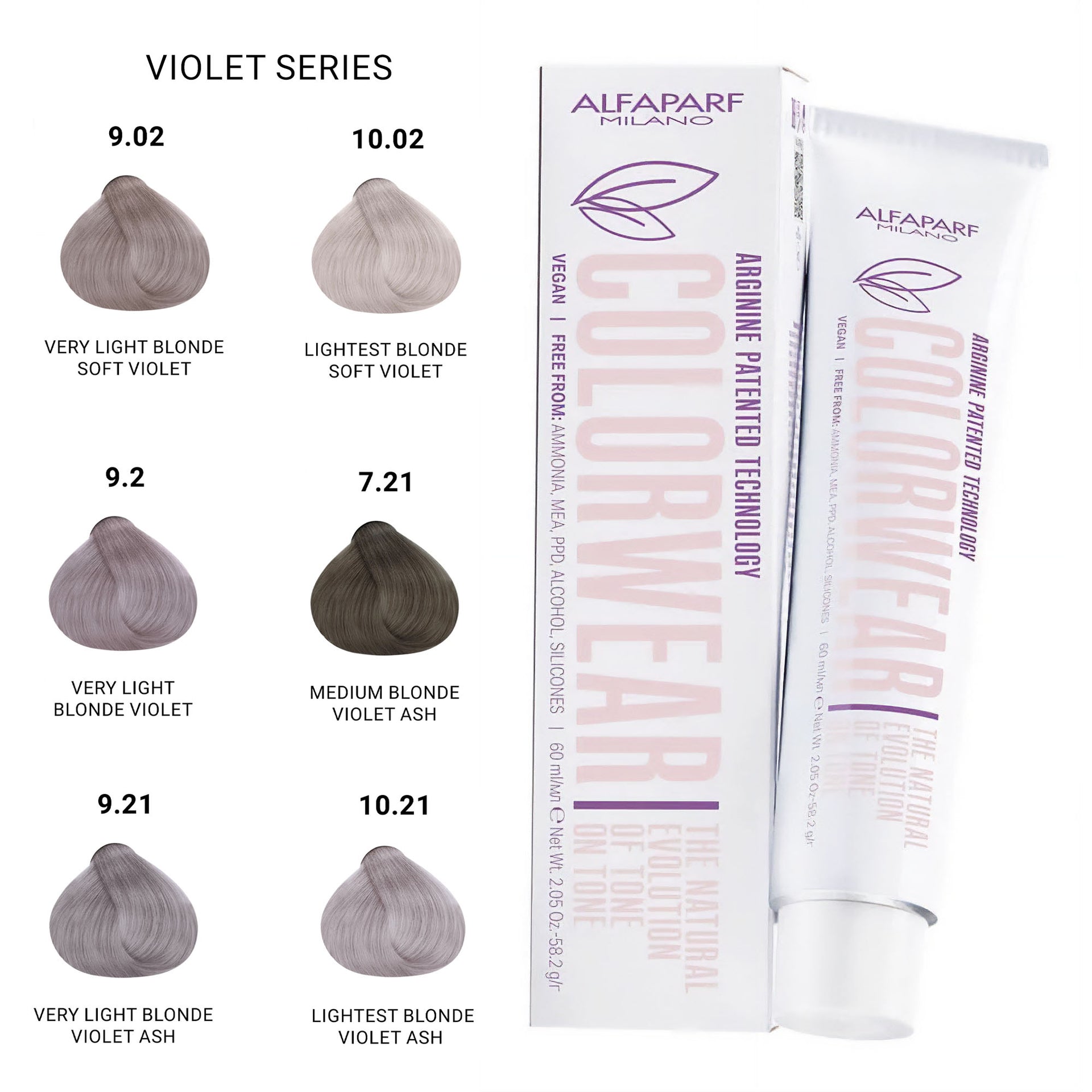 Alfaparf - Color Wear Semi Permanent Hair Colour Violet Series 60ml is a cutting-edge hair colour solution that uses patented arginine technology to replace harsh chemical alkalising agents. This vegan formula contains no ammonia, PPD, alcohol, or silicones, making it a gentle yet effective choice for semi-permanent colouring. The arginine, a 100% natural amino acid, mimics the protein structure of hair, ensuring a more natural and kinder colouring experience. Not only does this dye provide vibrant, long-lasting shades, but it also helps maintain up to 92% of the colour after 12 washes. Enriched with a blend of semi-fermented oils of natural origin, it nourishes and protects the hair, leaving it shinier, softer, and up to 11 times more manageable after just six applications. Achieve up to 149% more shine and 38% greater integrity with the Alfaparf Color Wear Violet Series, which is ideal for those seeking a professional finish at home. With its gel-cream texture, the product is easy to apply and evenly distributes rich, ultra-brilliant violet tones.