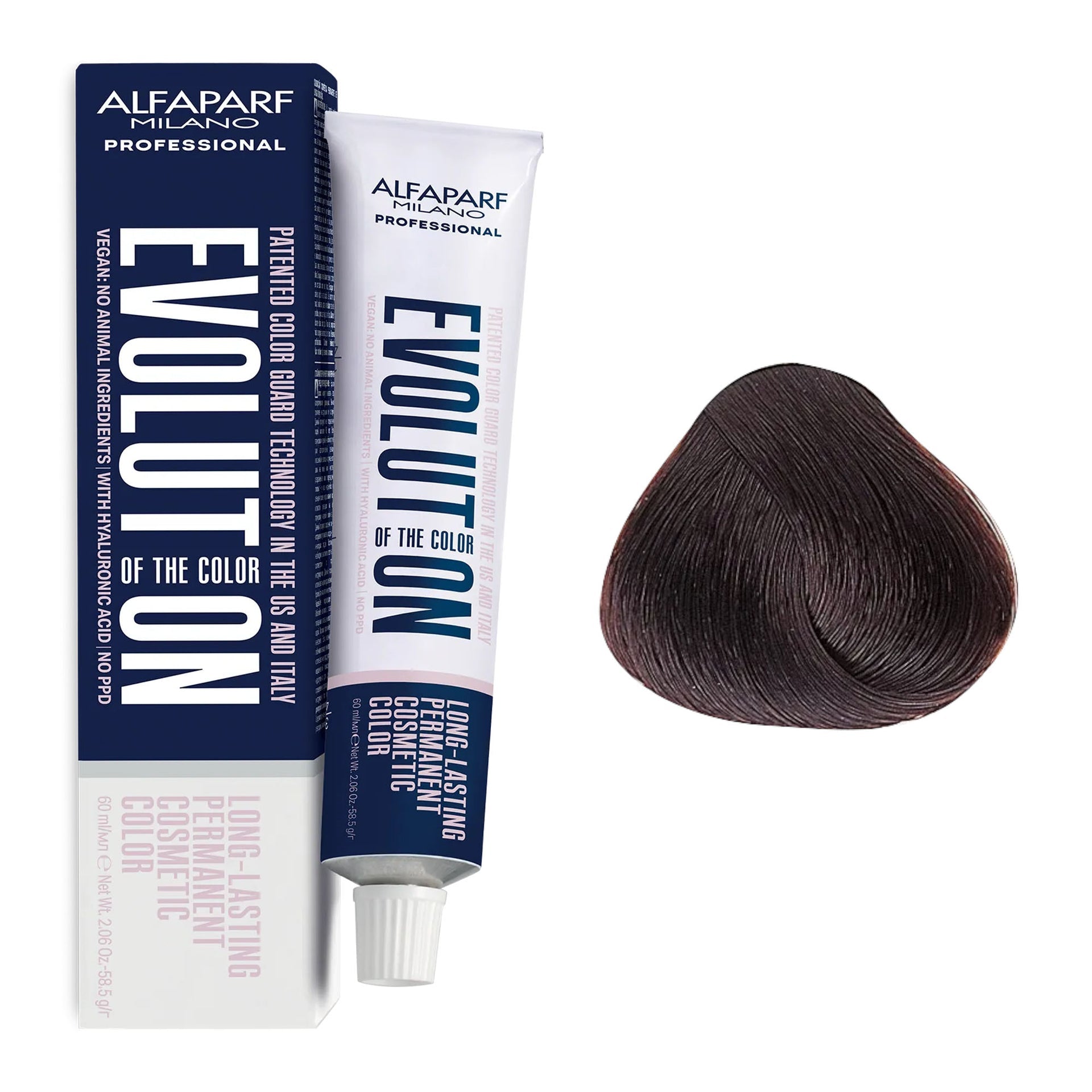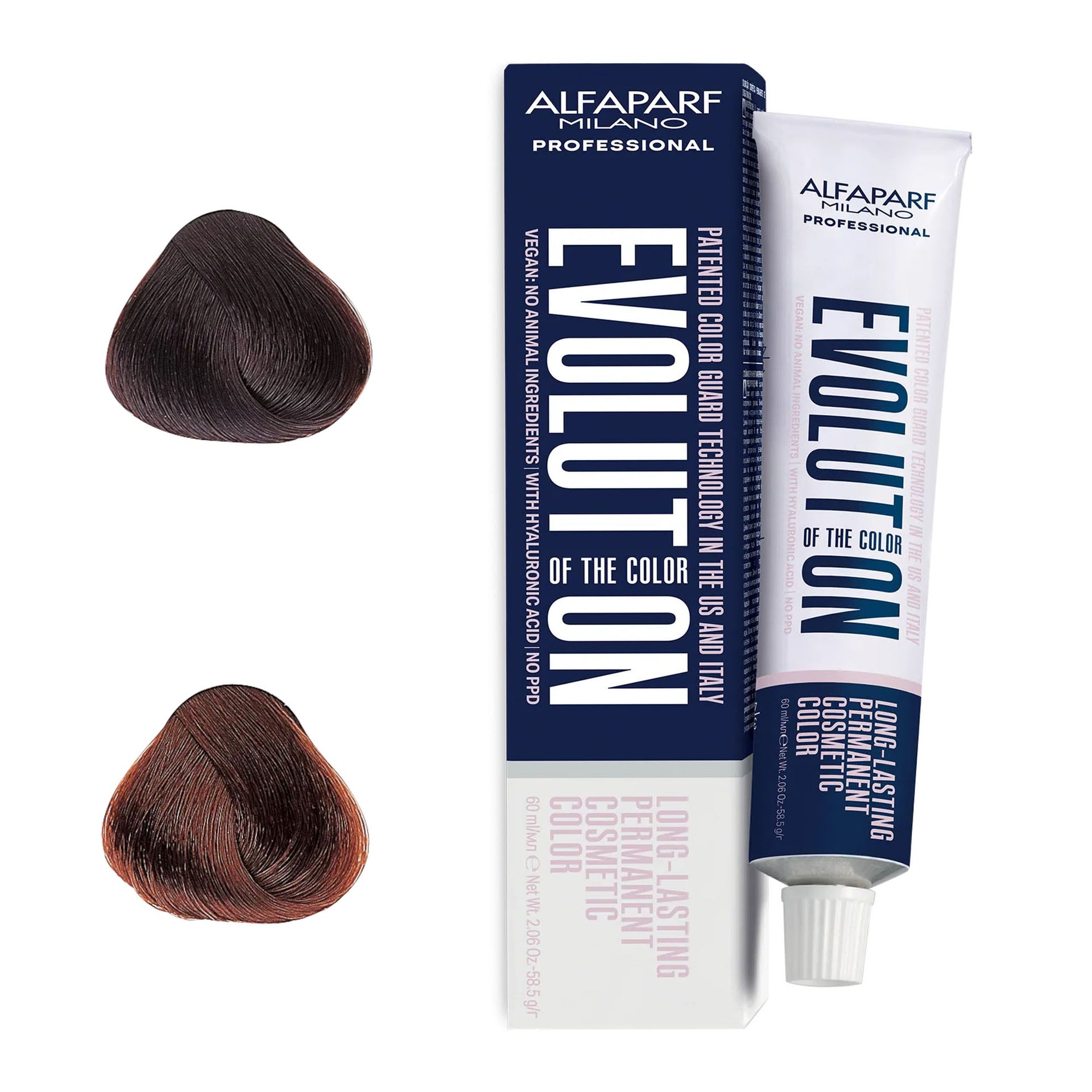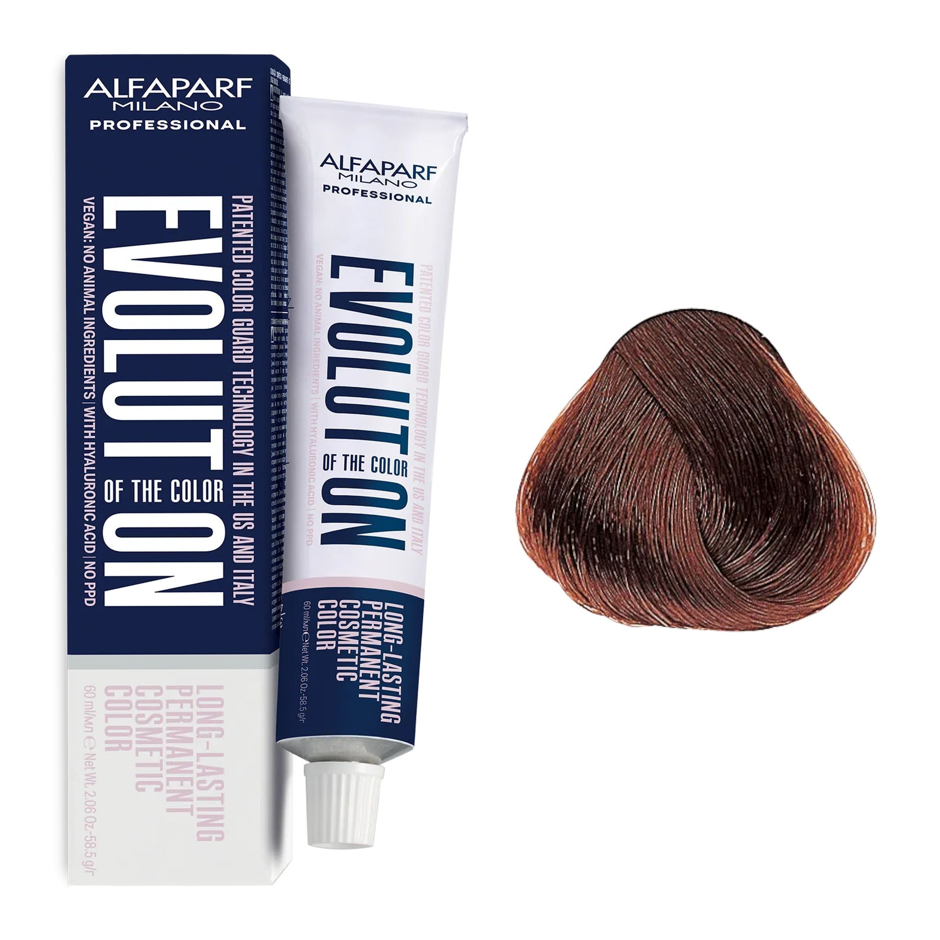 Alfaparf - Evolution of the Colour Permanent Hair Colour Bronze Series 60ml is designed for those seeking vibrant, long-lasting bronze tones with superior scalp care. This PPD-free formula is ideal for sensitive scalps, offering up to 100% grey coverage and the ability to lighten by up to 3 levels. Infused with hyaluronic acid, it ensures even colour distribution, leaving your hair soft, shiny, and deeply nourished. The low ammonia content guarantees a more comfortable colouring experience without compromising the intensity or longevity of the colour. Featuring advanced Colour Guard Technology, it protects your hair from UV rays, pollution, and blue light, ensuring your rich bronze shade remains vibrant for longer. Additionally, this vegan formula is free from animal-derived ingredients, making it an ethical and sustainable choice. Made in Italy, this professional-grade hair dye promises salon-quality results in the comfort of your own home.