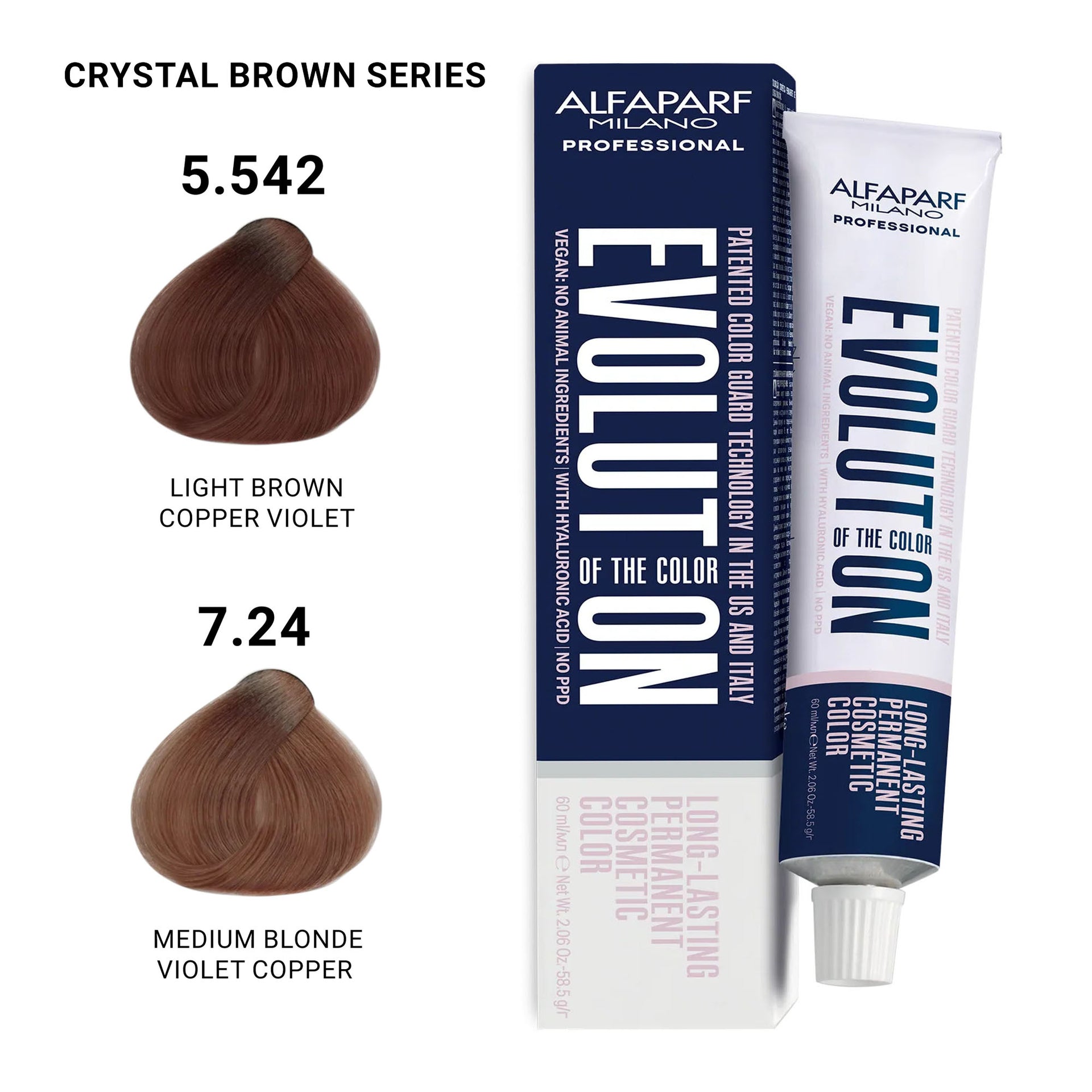 Alfaparf - Evolution of the Colour Permanent Hair Colour Crystal Brown Series 60ml provides professional-quality results while being gentle on the scalp and hair. This PPD-free formula is ideal for sensitive skin and offers up to 100% grey coverage, with the ability to lighten hair by up to 3 levels. Enriched with hyaluronic acid, it ensures even colour distribution and leaves your hair soft, shiny, and deeply nourished. The low ammonia content allows for a more comfortable colouring process without compromising on the richness or longevity of the colour. Its advanced Colour Guard Technology protects your hair from external aggressors such as UV rays, blue light, and pollution, ensuring your crystal brown tones remain vibrant for longer. This vegan-friendly product is free from animal-derived ingredients, making it a responsible choice for those who prioritise sustainability. Made in Italy, this permanent hair dye combines luxury with cutting-edge technology to deliver flawless colour results.