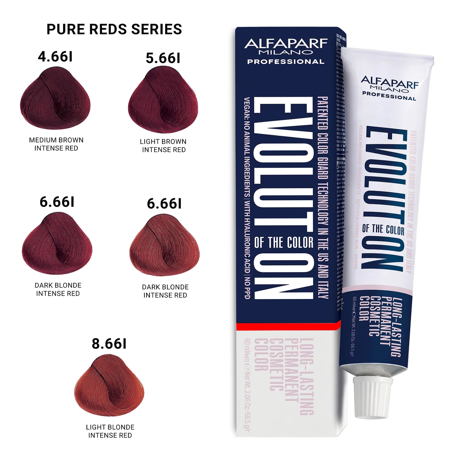 Alfaparf - Evolution of the Colour Permanent Hair Colour Pure Reds Series 60ml delivers intense, long-lasting red tones while ensuring total scalp care. This PPD-free formula is designed to be gentle on sensitive scalps and offers up to 100% grey coverage, with the ability to lighten hair by up to 3 levels. The addition of hyaluronic acid ensures an even distribution of colour, leaving hair feeling soft, shiny, and well-nourished. Formulated with a low ammonia content, it provides a more comfortable colouring experience without compromising vibrancy or longevity. Featuring patented Colour Guard Technology, this dye protects your hair from UV rays, blue light, and pollution, helping to maintain the intensity of your red tones for longer. The vegan formulation, free from animal-derived ingredients, makes it a sustainable and ethical choice. Made in Italy, this professional-grade dye brings salon-quality results to your home.