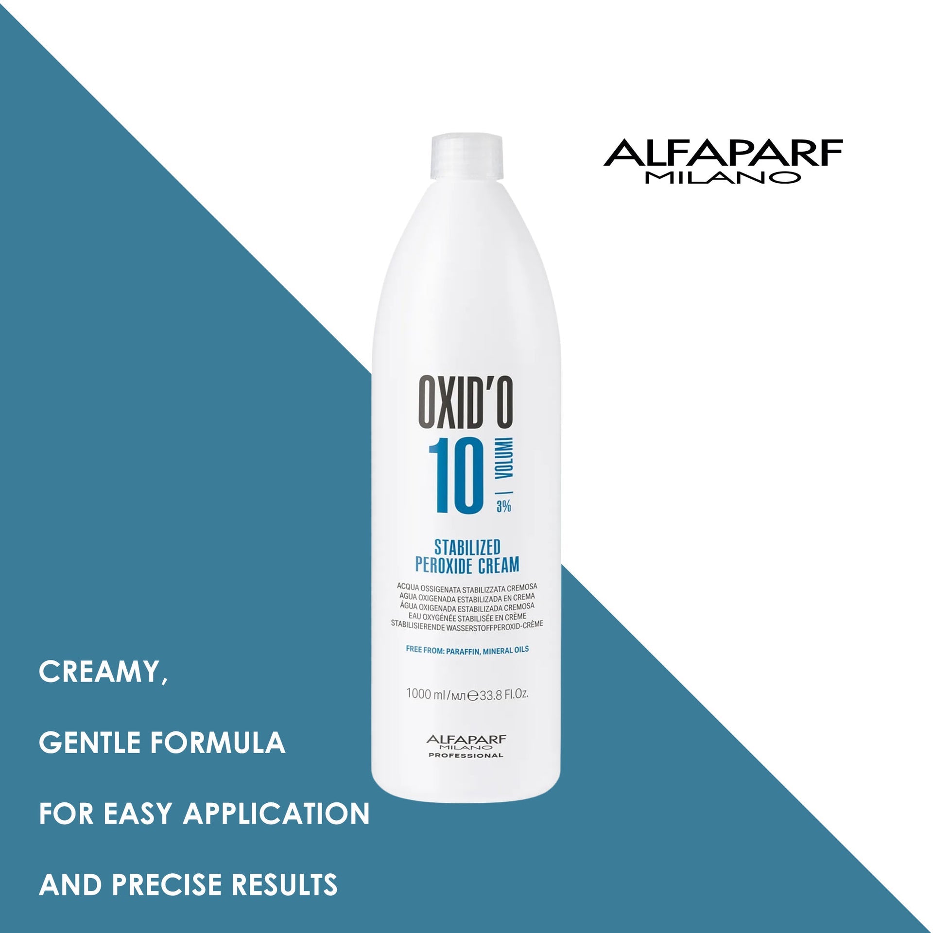 Elevate your colour services with this professional-grade cream developer range designed to deliver consistent, reliable results across all hair colouring and lightening treatments. The Alfaparf Oxid'o Peroxide Cream collection offers four precisely formulated strengths—3% (10 Vol), 6% (20 Vol), 9% (30 Vol), and 12% (40 Vol)—each in generous 1000ml bottles perfect for salon use or high-volume home colouring needs. Unlike typical watery developers, this innovative cream formula provides exceptional stability and control during application, eliminating dripping concerns whilst ensuring even distribution and optimal colour development. Each variant delivers a specific level of lift and development: the gentle 10 Vol provides minimal lift ideal for tone-on-tone colouring and grey blending, the versatile 20 Vol offers standard lift for permanent colour services, the more powerful 30 Vol delivers enhanced lifting capabilities for darker hair, while the intensive 40 Vol provides maximum lift for high-lift blondes and intensive lightening treatments.