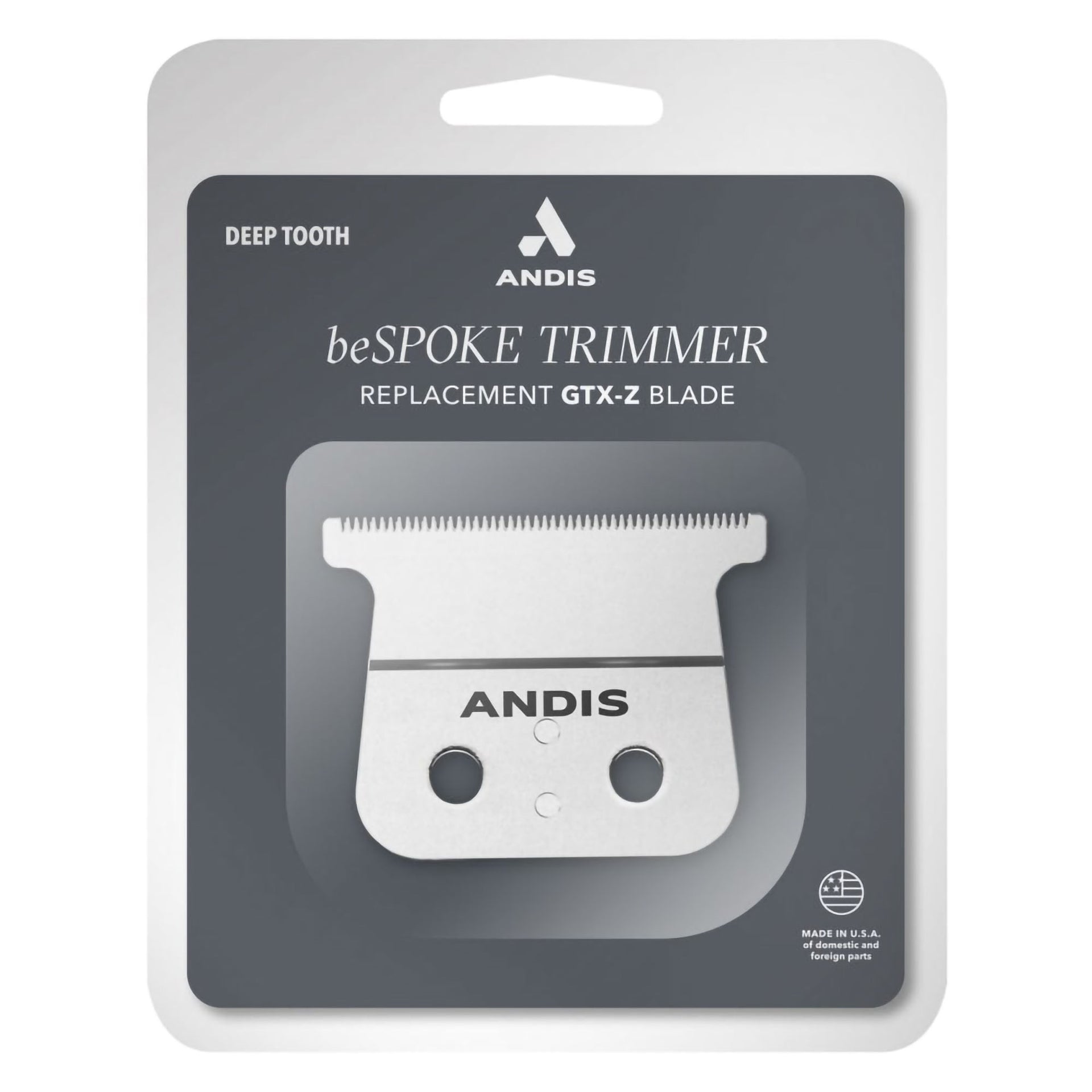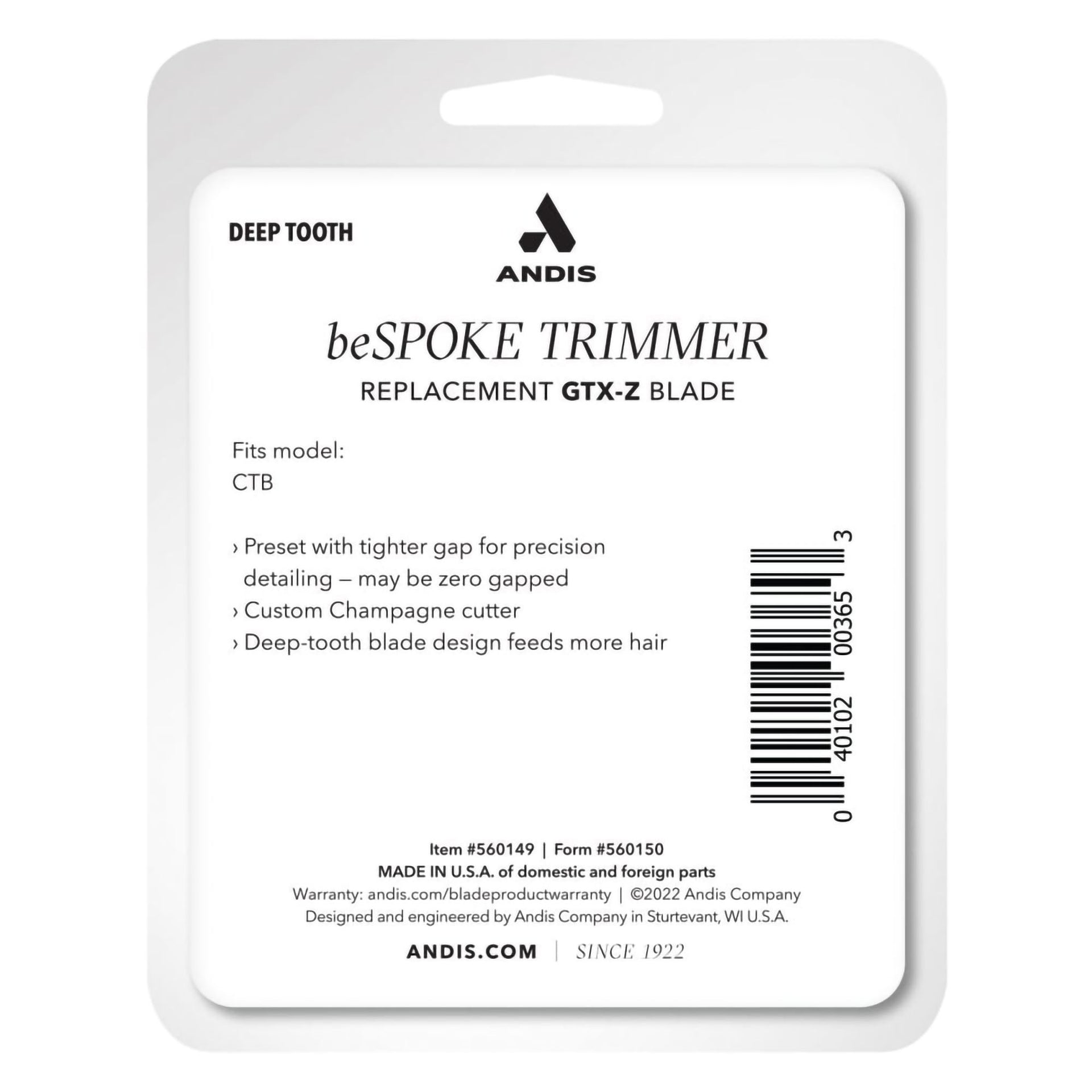 The Andis - beSPOKE Trimmer Replacement GTX-Z Blade 560150 is designed to elevate your grooming experience with superior cutting performance. This premium blade features a deep tooth design, which feeds more hair into the cutting blade, ensuring a smooth and precise finish. Ideal for professional use, the blade is preset with a tighter gap, allowing for the finest level of detailing and outlining. Whether you're working on tight fades or intricate designs, this blade can be zero-gapped for even more precision. The custom Champagne cutter adds a touch of elegance, while also enhancing the blade's durability and performance. Specifically crafted to fit the beSPOKE Trimmer model CTB, this replacement blade guarantees the same high-quality grooming experience as the original blade. With its effortless handling, the beSPOKE Trimmer Replacement GTX-Z Blade is an essential tool for barbers and stylists alike.