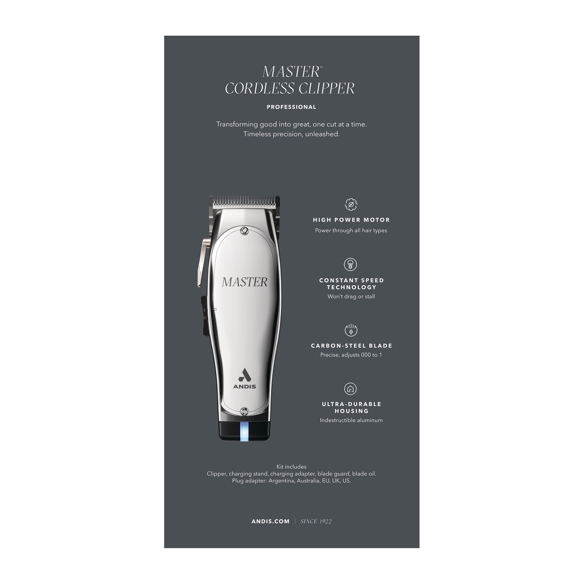 The Andis - Professional Master Cordless Clipper MLC 12665 is the ultimate tool for barbers seeking reliable performance and flexibility in their hair cutting arsenal. Powered by a robust lithium-ion battery, this clipper delivers up to 90 minutes of uninterrupted runtime and fully charges in just 60 minutes, making it ideal for busy barbershops. Its high-speed rotary motor operates at 7,200 strokes per minute, effortlessly cutting through both wet and dry hair for smooth, bulk hair removal. The iconic, chrome-plated carbon-steel blade is adjustable from fine to coarse (#000 to #1), offering precision and versatility for every cut. Featuring Constant Speed Technology, the clipper maintains consistent power without stalling or dragging, ensuring a flawless finish every time.