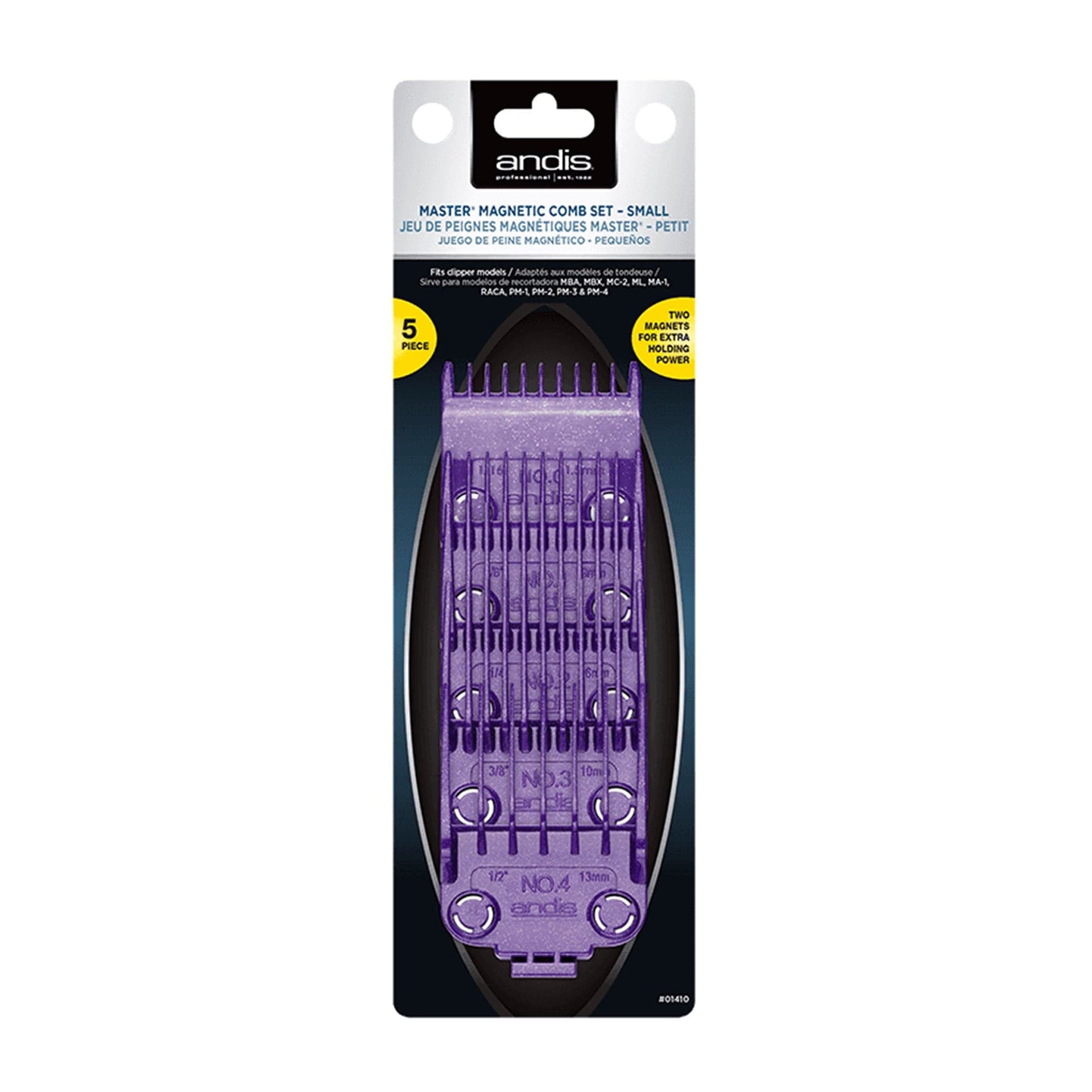 The Andis - Master Dual Magnetic Comb Set 5 Pcs Small AS01410 is a professional-grade accessory designed to offer precision and durability for barbers and stylists. This five-piece set includes comb sizes 0 (1.5mm), 1 (3mm), 2 (6mm), 3 (10mm), and 4 (13mm), providing a wide range of cutting lengths. Enhanced with patented Andis magnetic technology, each comb features rare earth magnets that securely attach to clipper blades, ensuring a stable fit throughout every haircut. The magnetic design significantly outlasts traditional clip-on combs, which can bend or break over time. Each comb is infused with nano-silver technology, offering anti-bacterial properties for improved hygiene between clients. The vibrant purple colour and clear, embossed size markings help you quickly identify the right comb, making your workflow more efficient.