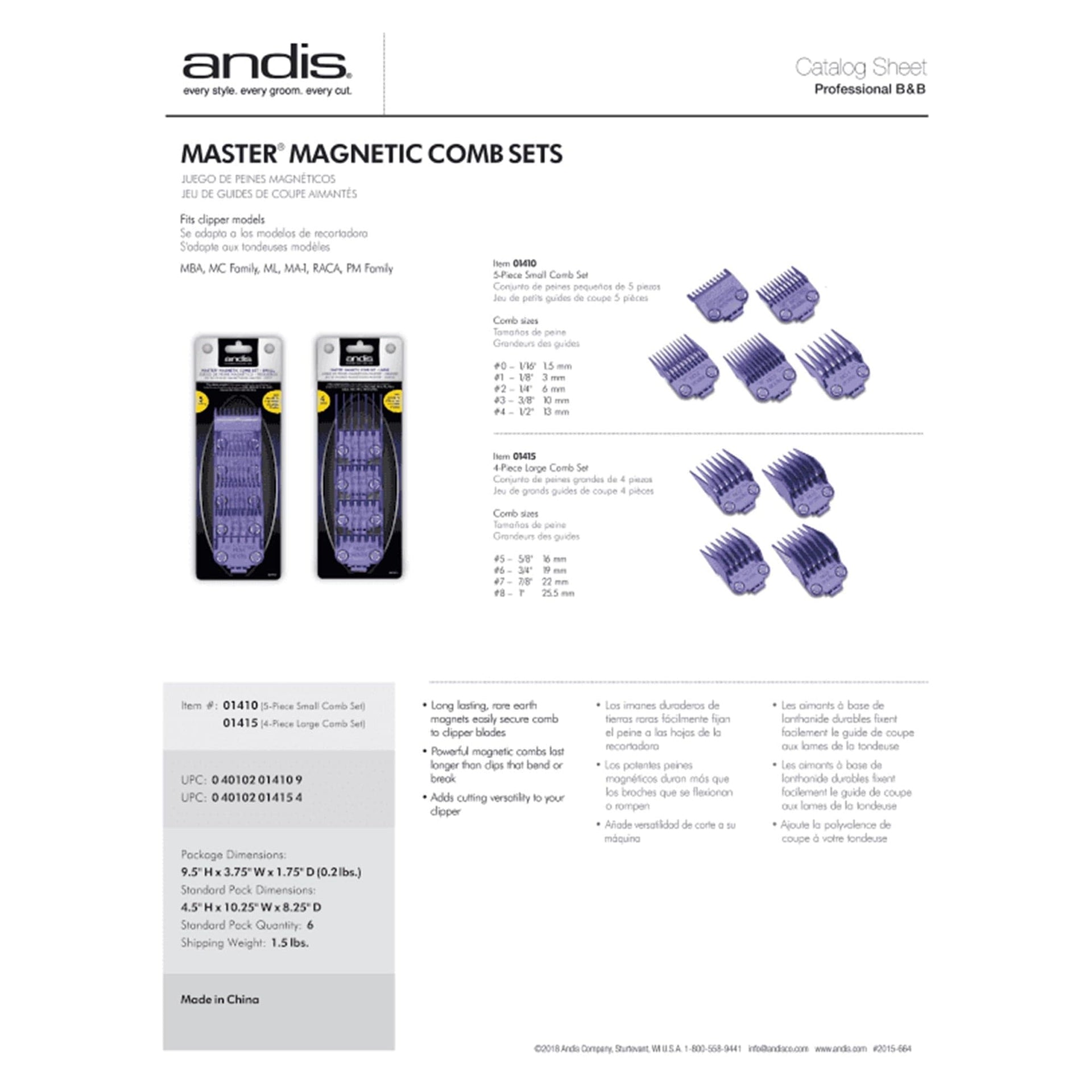 The Master Dual Magnetic Comb Set is compatible with a range of Andis clippers, including the MBA, MBX, MC-2, ML, MA-1, RACA, and PM models, making it a versatile addition to your toolkit. The secure magnetic attachment ensures precise and accurate cuts, whether you're fading, blending, or detailing. Easy to install and remove, these combs allow for seamless transitions between sizes, ensuring your work remains efficient and professional. With their durable design and hygienic features, this comb set is ideal for busy barbershops or salons where quality and cleanliness are top priorities. Whether you're a professional barber or a home grooming enthusiast, this comb set will elevate your cutting experience.
