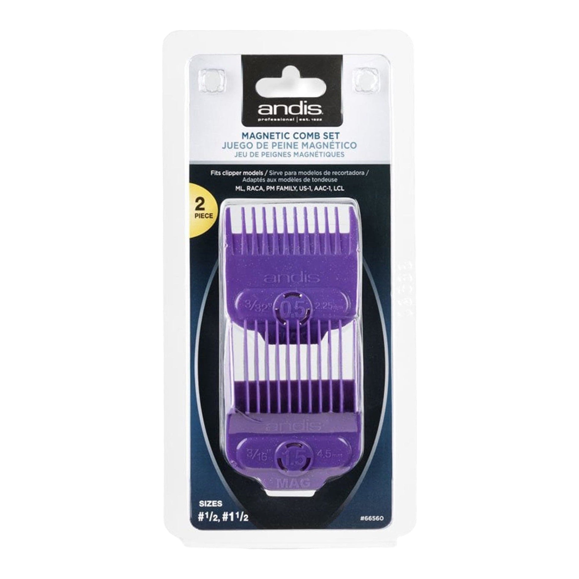 The Andis - Single Magnetic Comb Set - Dual Pack 0.5 & 1.5 AS66560 offers an exceptional blend of durability and precision, designed for professional barbers and stylists. These combs attach securely to clippers using Andis' patented magnetic system, featuring rare earth magnets known for their strength and long-lasting performance. The combs snap into place without the need for traditional clips, which are prone to wear and tear. This set includes two versatile sizes—0.5 (2.25mm) and 1.5 (4.5mm)—making it ideal for a variety of styles, from close cuts to blended fades. Each comb is infused with nano-silver, providing anti-bacterial protection, ensuring hygienic use between clients. The vibrant purple colour adds a touch of style, while the clear size markings make identification quick and easy during busy grooming sessions.