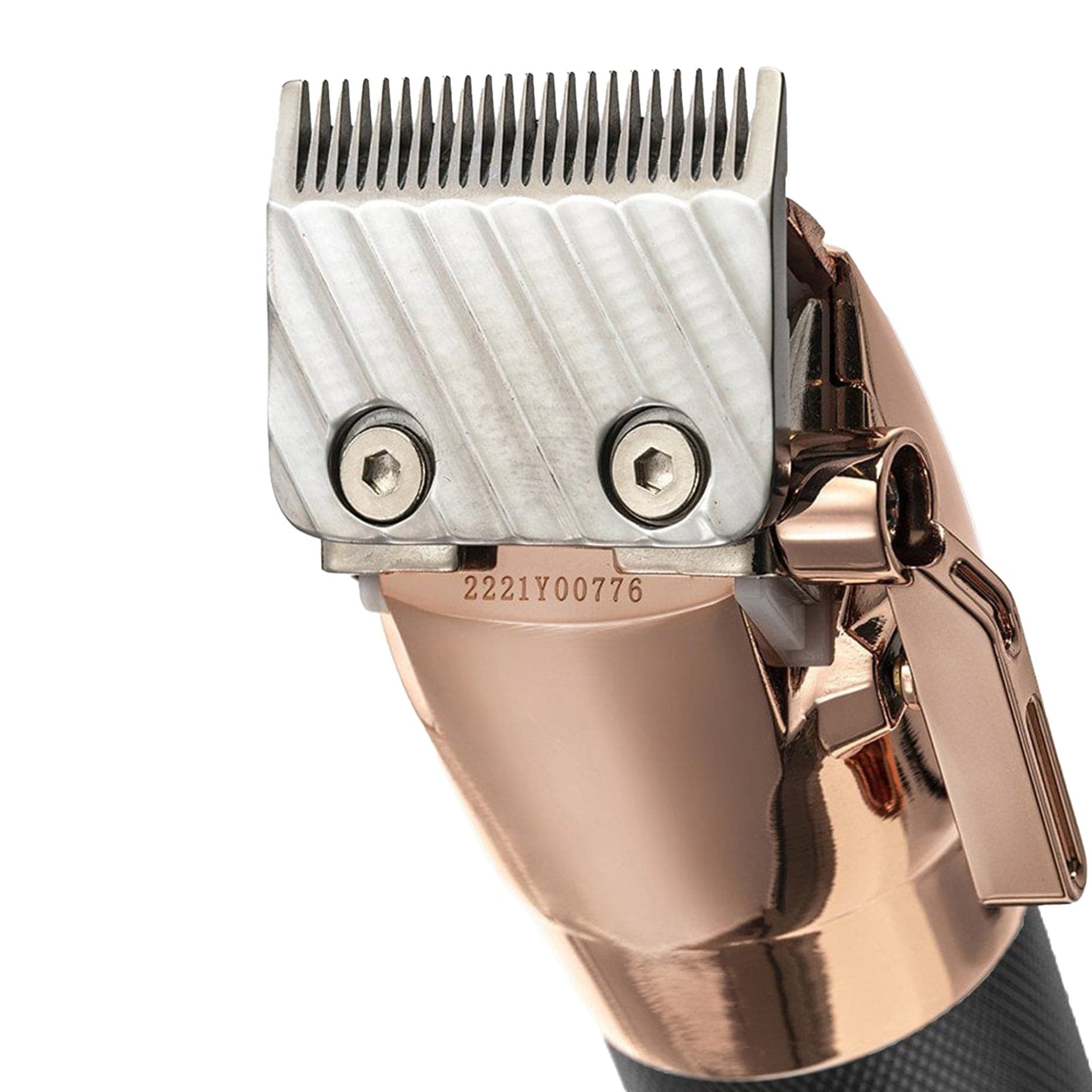 The Babyliss Pro - Cordless Rose Gold Super Motor Clipper is the ultimate professional grooming tool, combining style, durability, and precision. Its robust all-metal casing ensures long-lasting performance, while the high-torque brushless motor delivers consistent cutting power even through thick or long hair. The clipper is equipped with precision-engineered Japanese steel blades, offering smooth, sharp performance for effortless cutting. Its high-performance lithium battery provides up to 120 minutes of cordless runtime from just a 3-hour fast charge, ensuring reliable operation without interruption. Designed for versatility, the clipper can be used corded or cordless, suiting both professional barbers and at-home users. The 5-position adjustable taper lever allows for precision cutting, and the included 6 comb guides cater to various lengths, from grades 1 to 6. With its stunning rose gold finish, this clipper is not only a practical tool but also a stylish addition to your grooming kit.