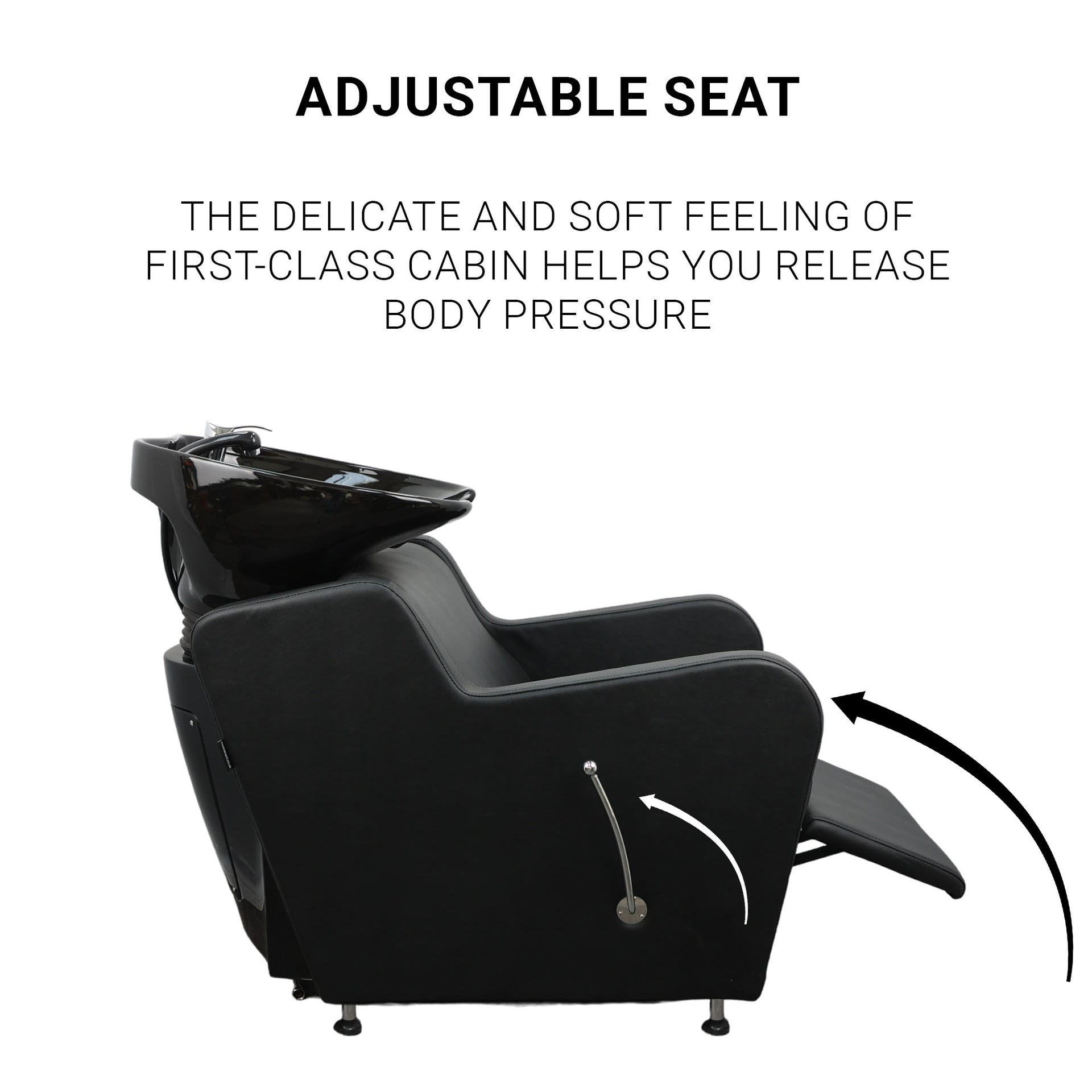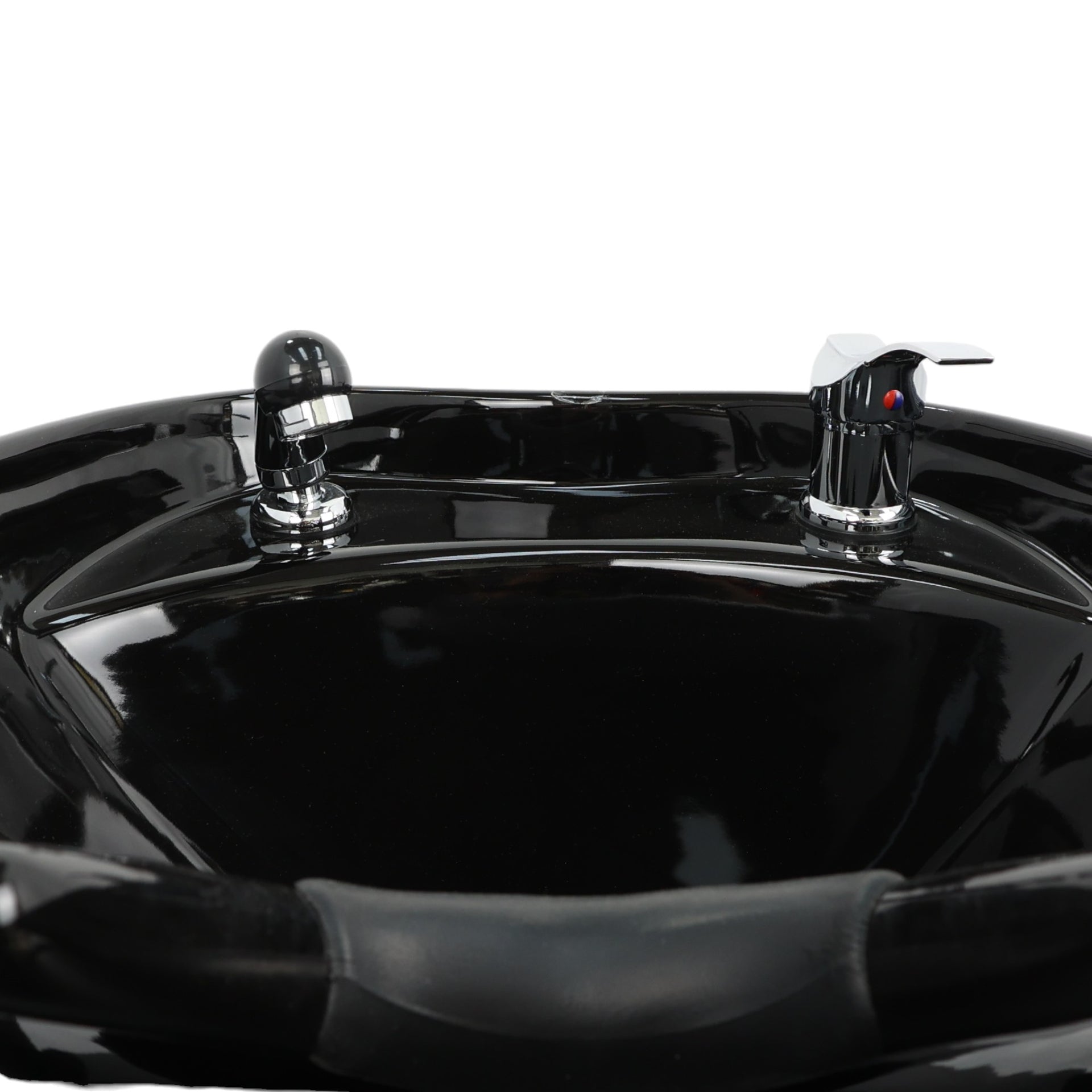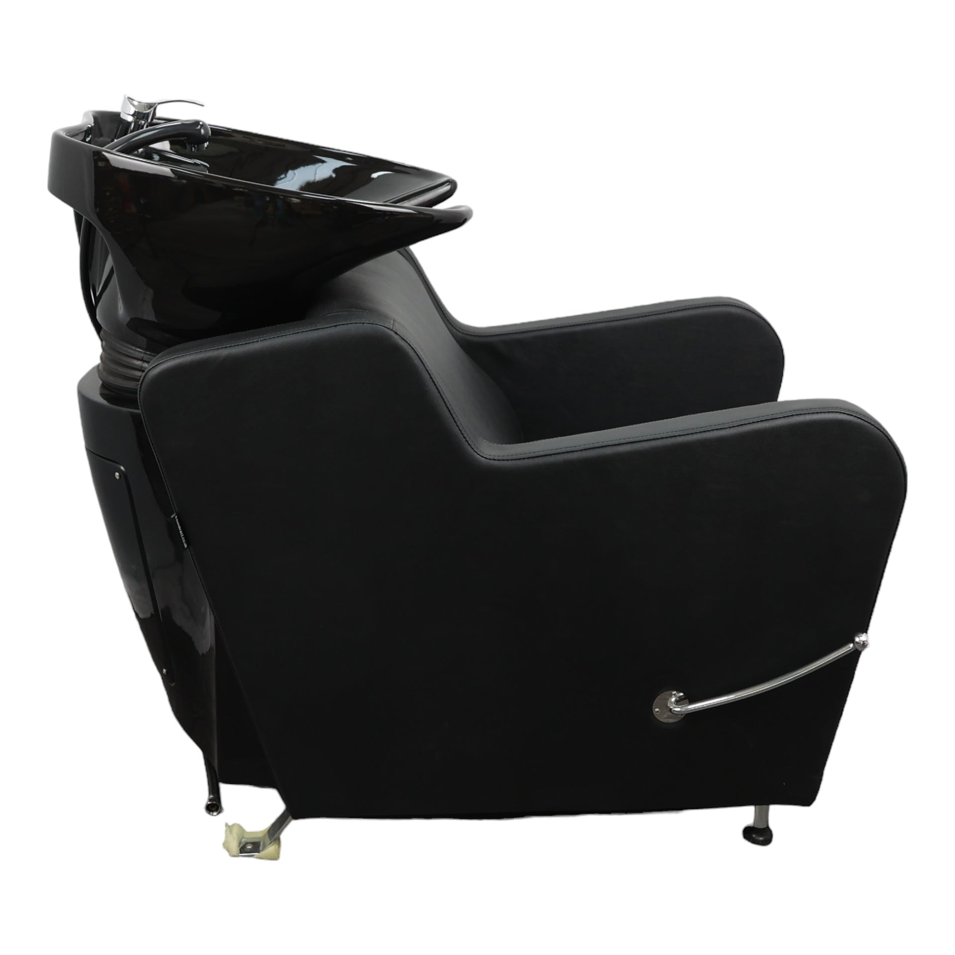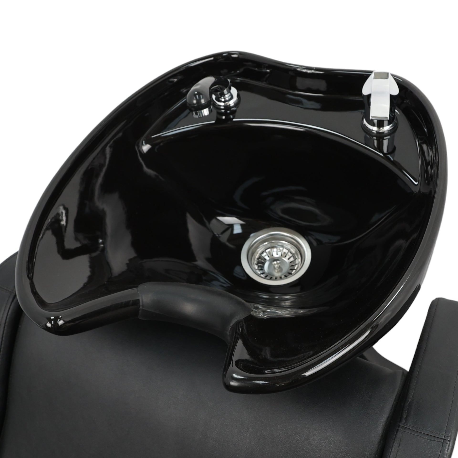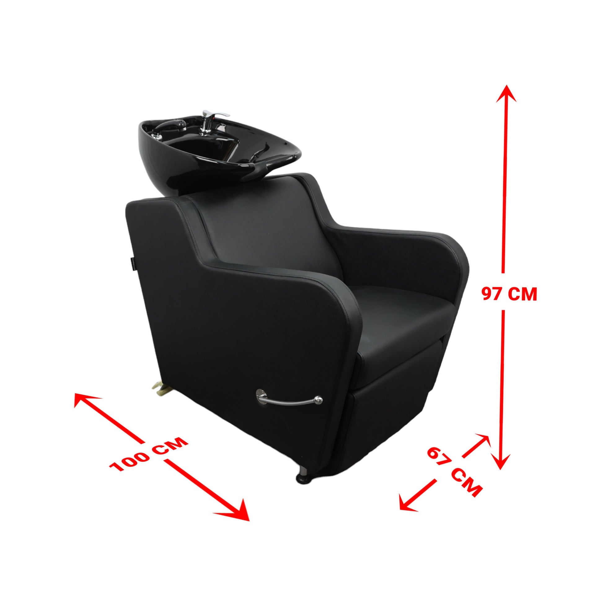 Equipped with a black ceramic basin, the Backwash Chair - Ergonomic Luxury Basin Adjustable Chair Black offers both beauty and practicality in one. The basin comes with an oscillating mechanism, allowing flexibility when adjusting to your client's position for added convenience. The sturdy construction, featuring a wooden frame with high-density foam, ensures long-lasting comfort and reliability. The folding footrest, operated by a manual lever, provides personalised comfort, while the hydraulic pump, controlled by a foot pedal, allows for easy height adjustments. This unit is supplied with all necessary fittings and piping, making installation a breeze, and its easy-to-clean surfaces ensure hassle-free maintenance.