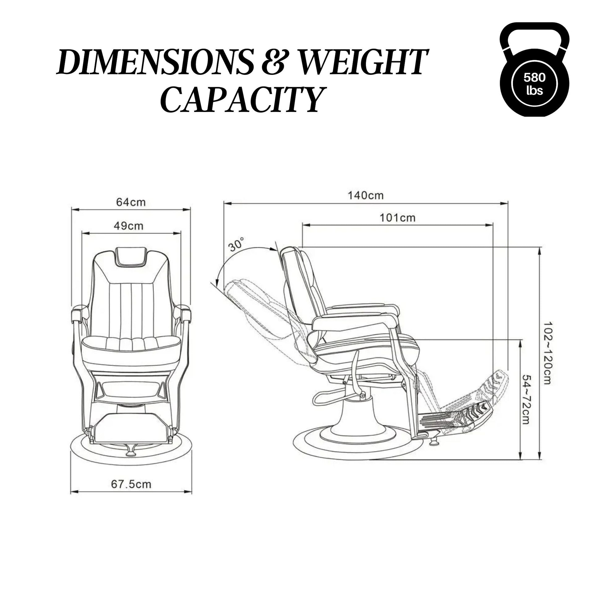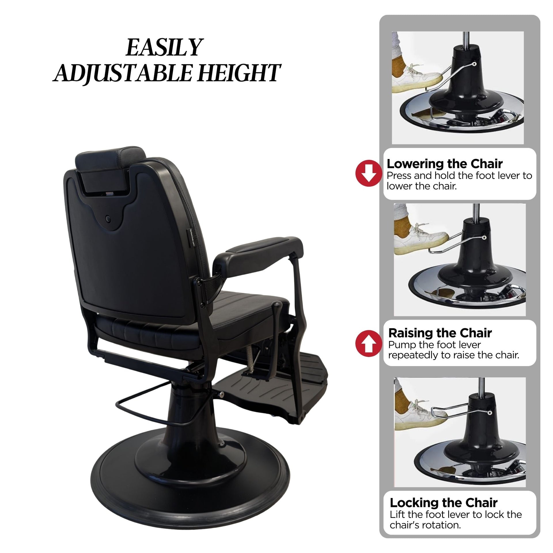 Functionality matches style with a super-heavy-duty hydraulic pump and base capable of supporting up to 580 lbs, accommodating clients of all sizes with ease. The chair features a pinpoint adjustable headrest that can be removed to create additional working space, alongside a smooth reclining mechanism controlled by a sleek lever. A padded reversible foot and leg rest ensures total relaxation, while the secure built-in locking mechanism keeps the chair stable during intricate cuts. This unit is designed to be the reliable mainstay of your business, offering long-lasting quality and a premium feel.
