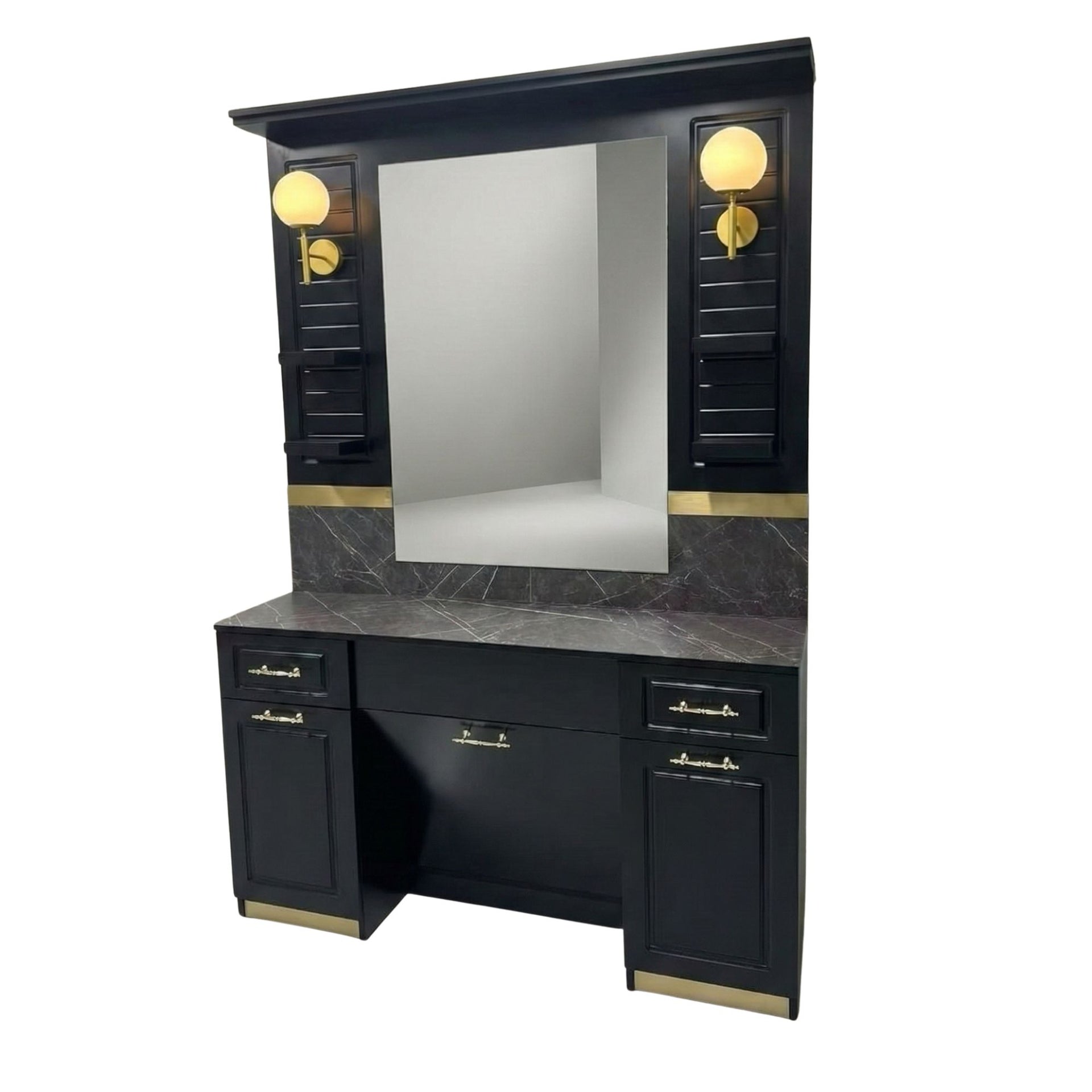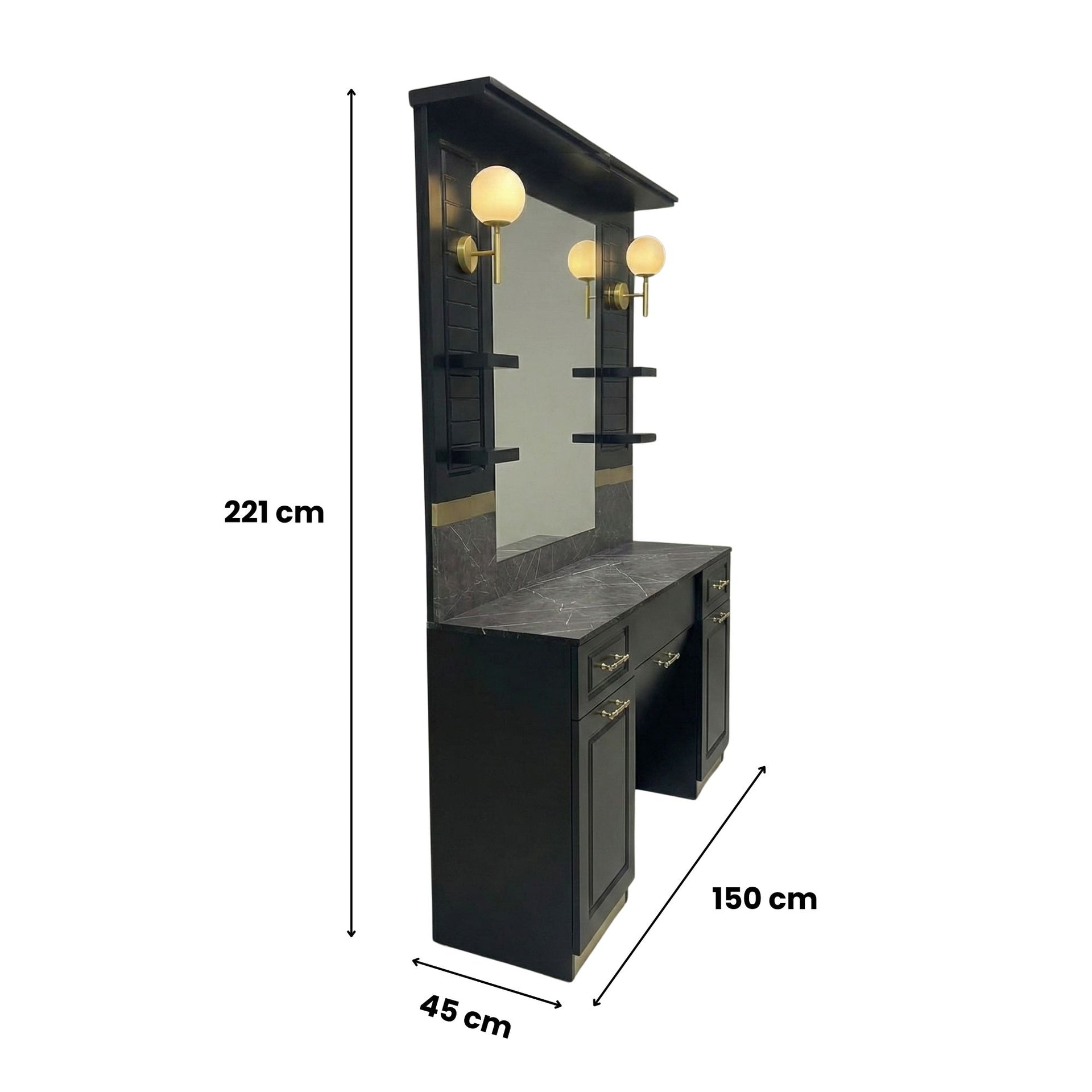 Elevate the standard of your barbershop with the Barber Station Unit - Black & Gold Finish with Marble Effect Counter, a sophisticated workstation that seamlessly blends classic design with modern luxury. This unit features a striking black finish accented by elegant gold hardware and trim, creating a timeless aesthetic that commands attention in any professional setting. The centrepiece is undoubtedly the exquisite grey marble-effect countertop, which adds a layer of refinement and durability, providing a practical yet stylish surface for your tools and products. Flanked by two integrated globe wall lights, the large mirror ensures optimal visibility while casting a warm, inviting glow over your client. Experience the perfect harmony of opulence and practicality with this distinguished furniture piece.