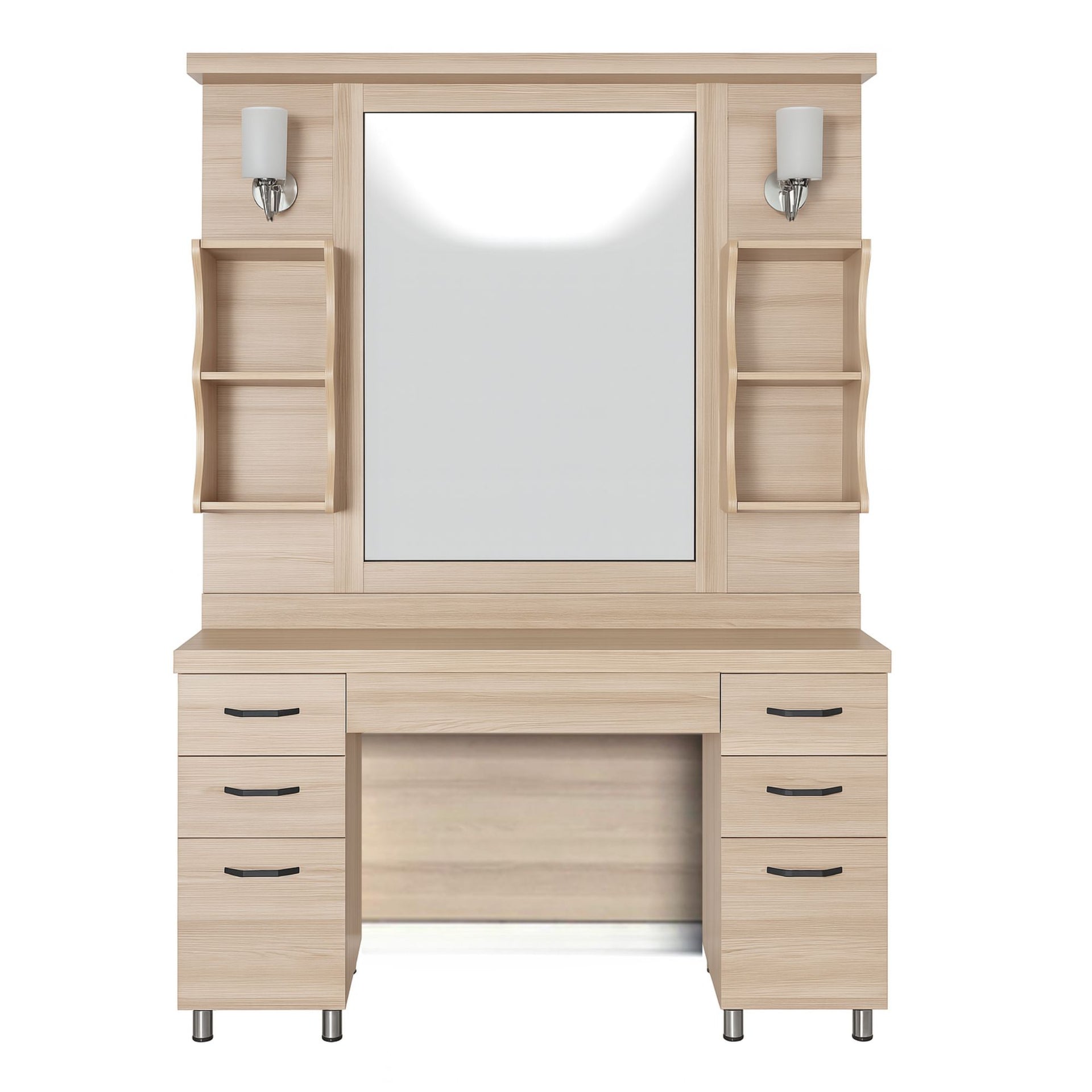 This station is designed to keep your workspace perfectly organised, offering extensive storage with six deep drawers, ideal for neatly storing everything from scissors and combs to hairdryers and clippers. The unique, sculpted display shelves on either side of the mirror offer a stylish way to display retail products or keep your most-used items accessible. Built for the demands of a professional environment, the unit stands on sleek chrome-finish feet, adding a contemporary touch and ensuring stability. It is a perfect fusion of clean, modern design and everyday practicality.