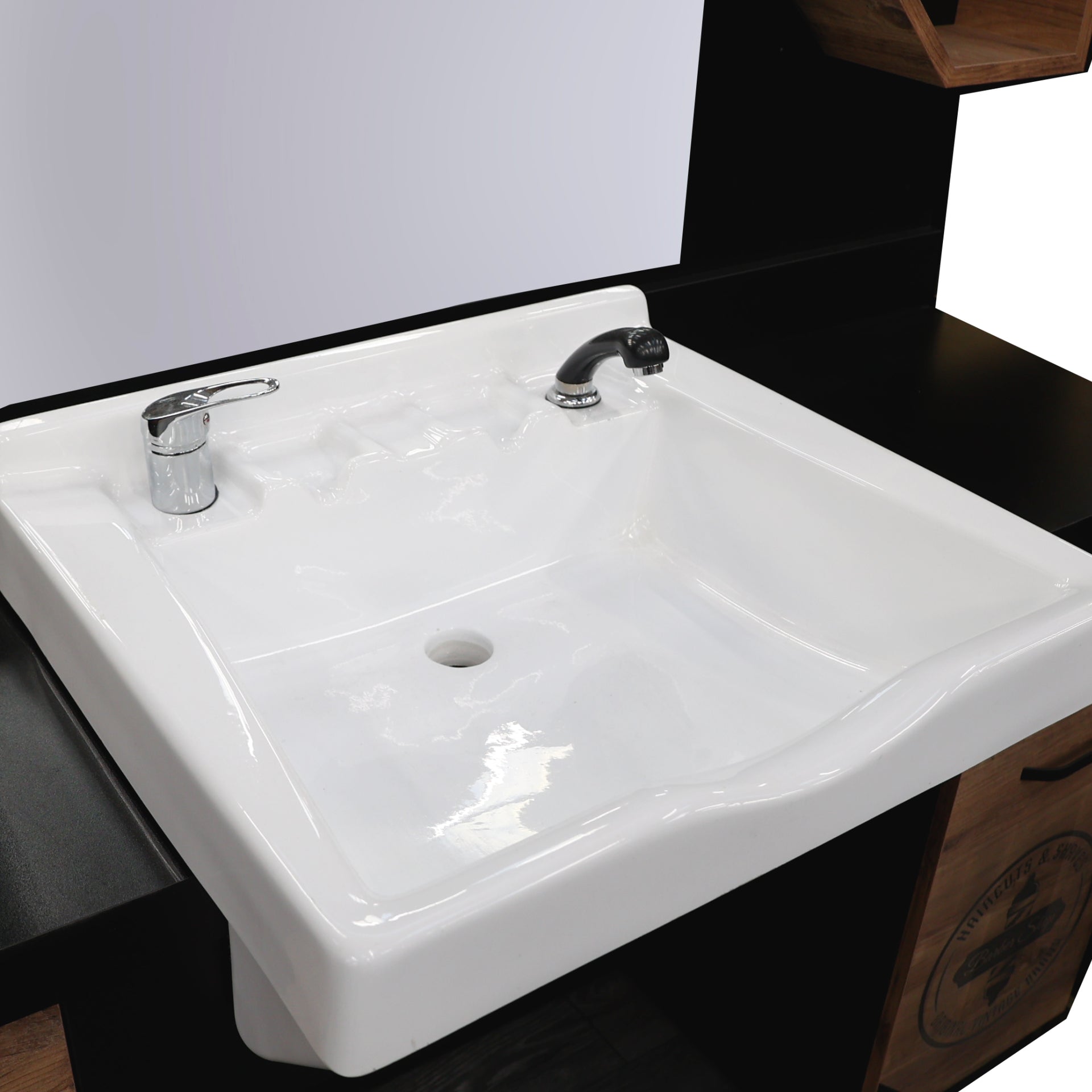 The Barber Station Unit - Light Wood & Black Station With Barbershop Logos provides an instant brand identity for any modern barbershop, offering a complete 'shop-in-a-box' look with its unique, integrated graphics. This unit features a striking two-tone finish, contrasting distressed, light wood-effect panels against a sleek matt black framework for a look that is both rustic and industrial. This all-in-one station is built for full functionality, featuring a large, durable, and easy-to-clean white ceramic basin. It comes complete with a professional-grade mixer tap and hose for a fully functional wash station.