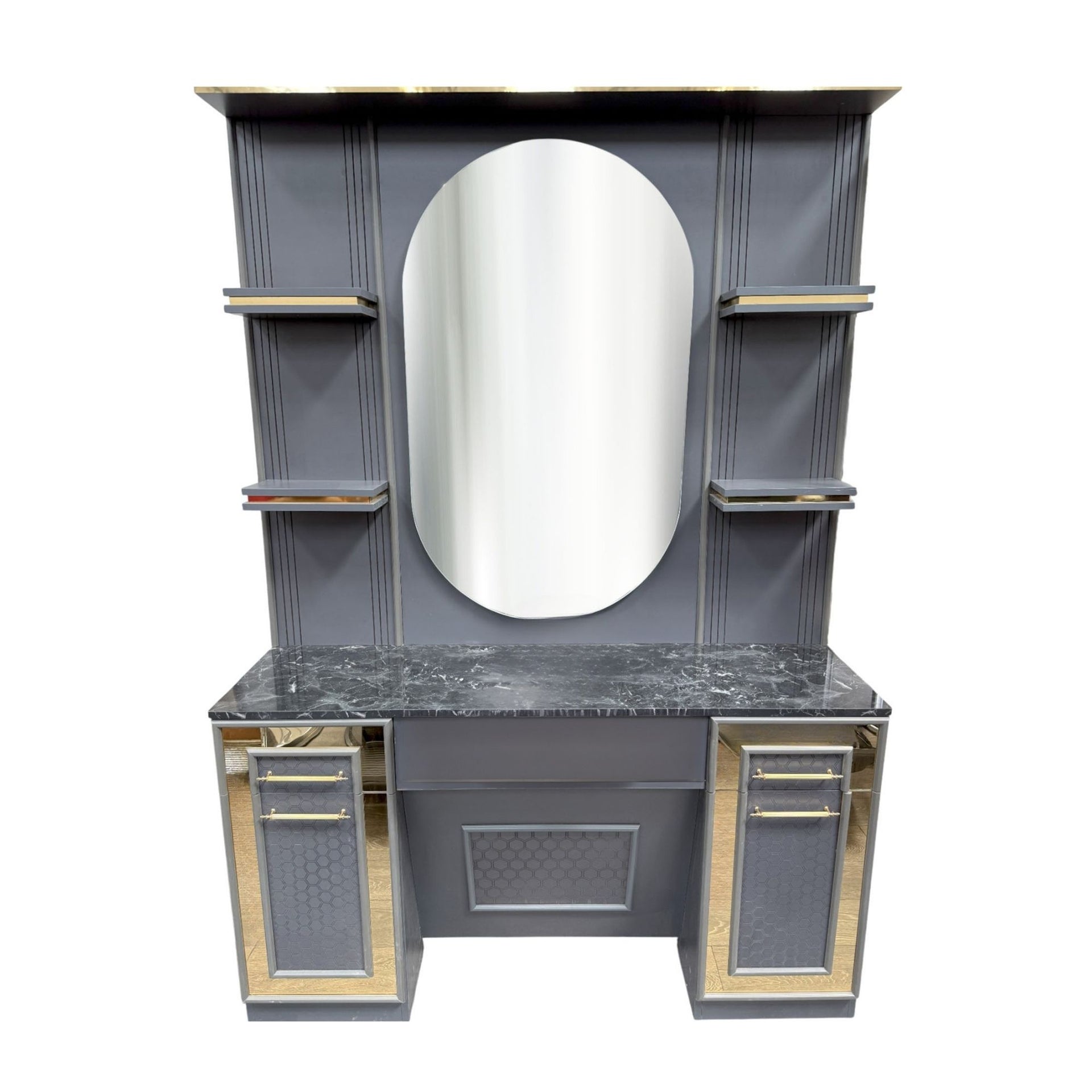 The Barber Station Unit - Modern Grey Station with Marble Top & Gold Accents is a sophisticated workstation that perfectly balances contemporary elegance with luxurious, premium materials. This unit features a refined dark grey finish, beautifully highlighted by opulent gold trim throughout for an upscale, Art Deco-inspired feel. The station's clean, streamlined silhouette is centred around a distinctive oval-shaped mirror, creating a modern yet timeless focal point for your salon. Crowning the unit is a stunning black marble countertop, providing a durable and exceptionally stylish work surface for the discerning professional.