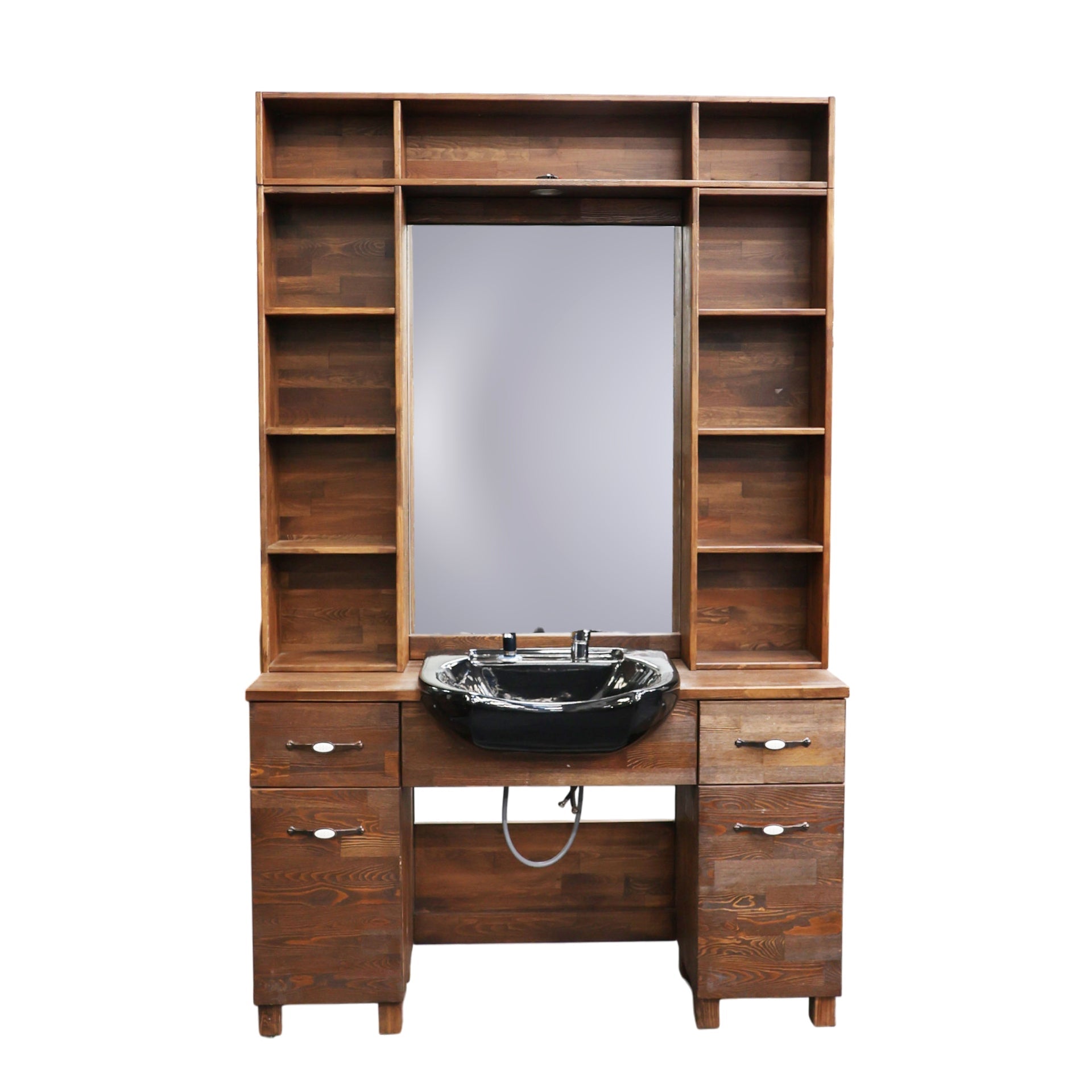 Designed for maximum organisation and display, this unit boasts an incredible amount of open shelving, with multi-level storage towers flanking the mirror, perfect for showcasing your products and keeping tools in order. This extensive shelving is supplemented by four spacious drawers in the base for discreet storage of all your essentials. Engineered for the demands of a busy shop, its solid, heavy-duty build ensures excellent stability and long-lasting durability for years of professional service. It is the ultimate functional centrepiece for a traditional, high-class barbershop.