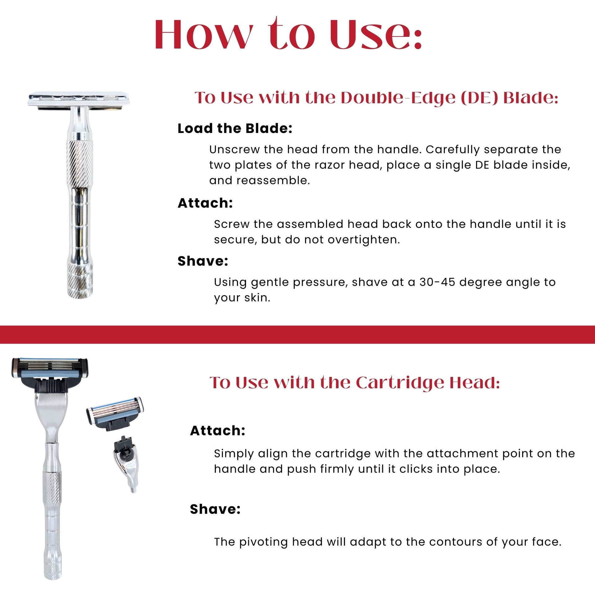 To use with a DE blade, unscrew the head, load a single blade, and reassemble securely. To use with the cartridge, simply click the cartridge head firmly into place on the handle.