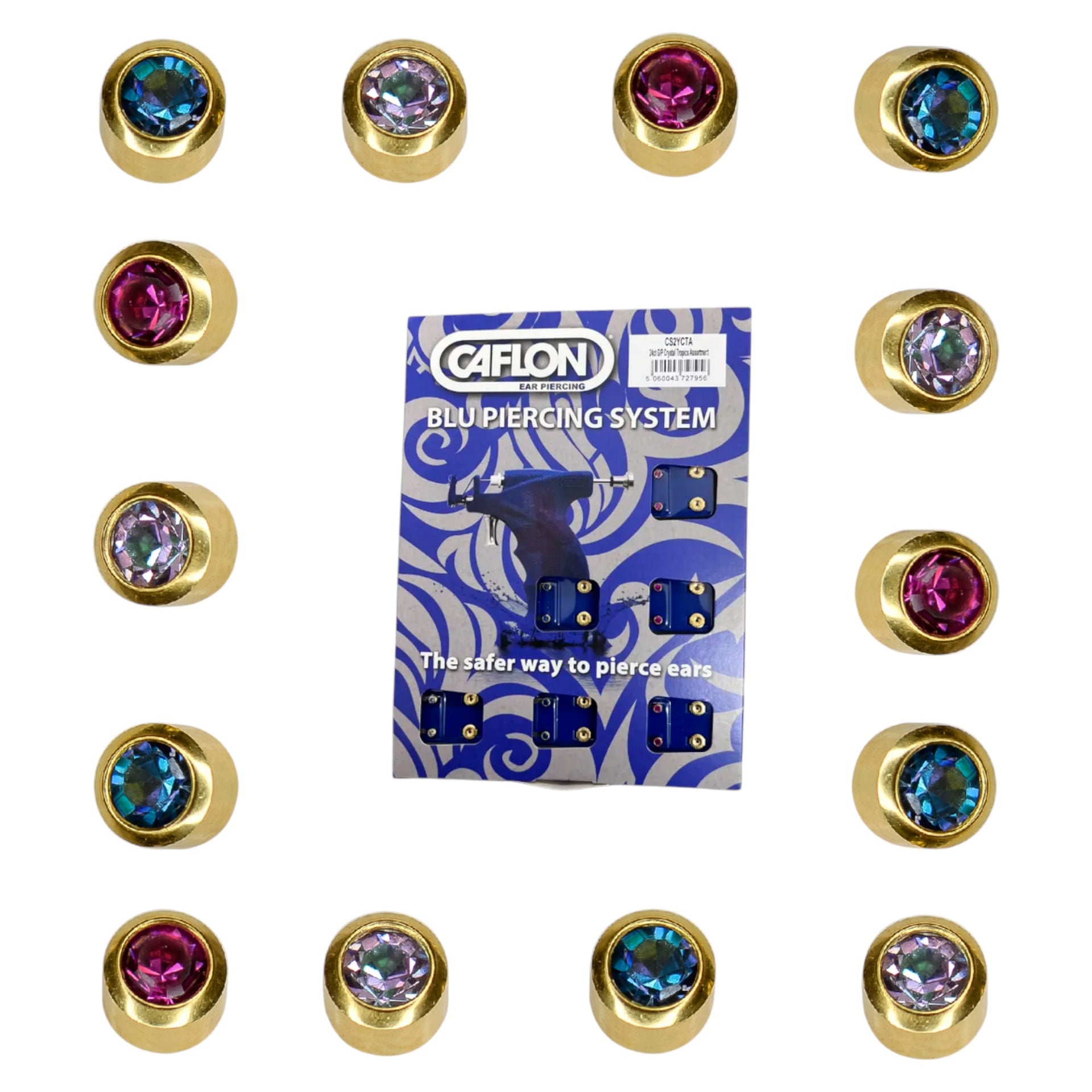 Introduce a splash of tropical brilliance to your piercing services with our exquisite Caflon Gold Plated Crystal Tropics collection, featuring three stunning crystal hues that capture the essence of exotic destinations. Each premium 4mm stud showcases a mesmerising crystal in either captivating Bermuda Blue, vibrant Fuchsia, or enchanting Vitrail Light, all beautifully enhanced by luxurious 24ct gold plating. Available as individual colour options or as a convenient assorted pack containing 4 pairs of each shade, these professional-grade earrings offer your clients a contemporary alternative to traditional birthstones. The Crystal Tropics range has been specifically designed for use with the Caflon Blu Piercing System, ensuring a safe, precise piercing experience whilst providing a fashion-forward finishing touch that clients will adore.