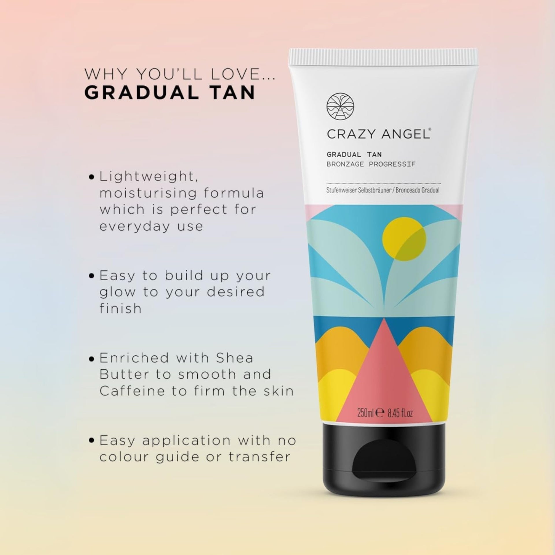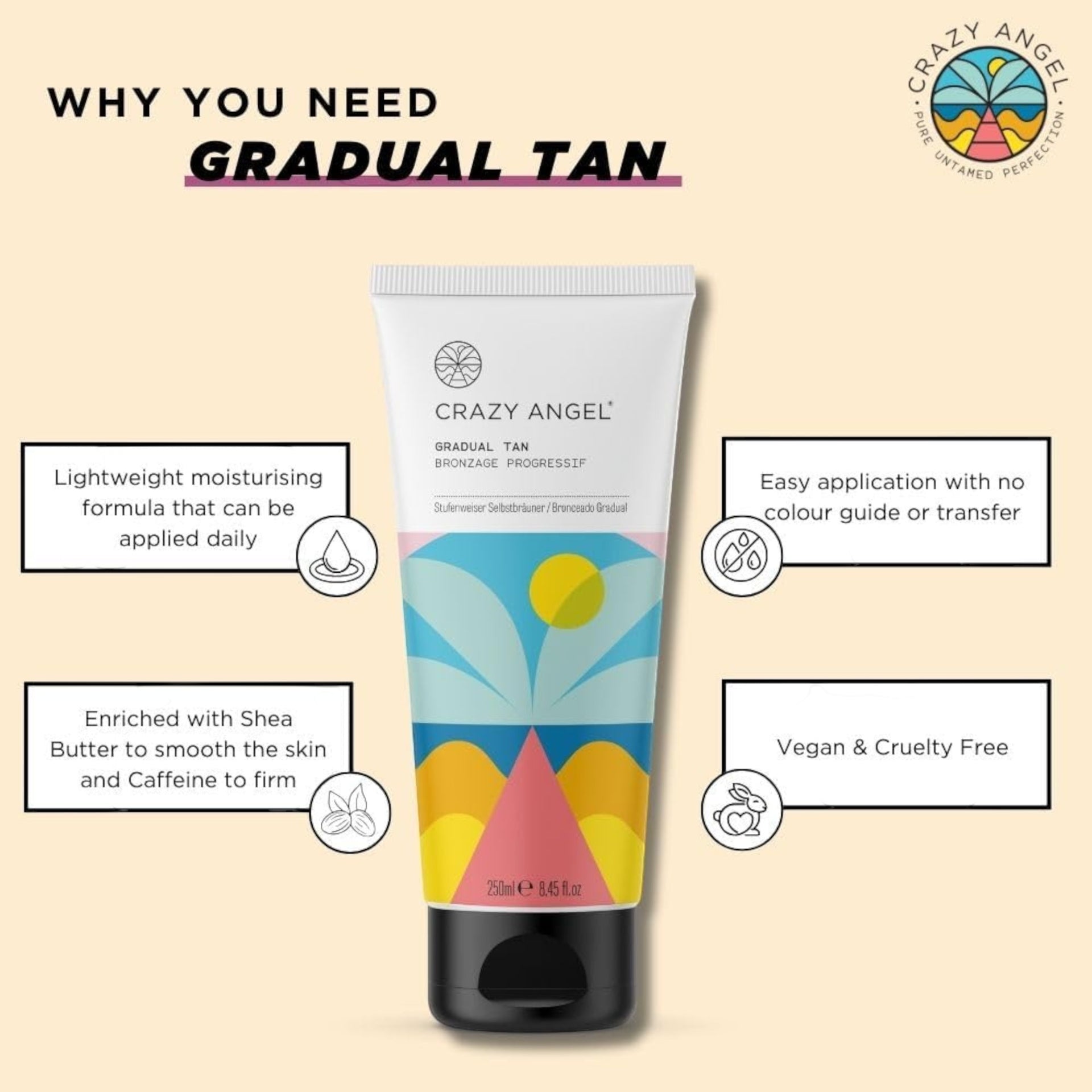 Achieve a beautifully customised, sun-kissed glow at your own pace with Crazy Angel Gradual Tan. This innovative formula combines the benefits of a premium daily moisturiser with subtle self-tanning properties, allowing you to build your perfect level of bronze gradually and naturally. Unlike traditional self-tanners that can sometimes result in an immediate, dramatic colour change, this clever daily treatment lets you take control of your tanning journey, building colour day by day until you reach your desired depth of tan. The lightweight, streak-free formula contains no visible colour guide, meaning it applies like a regular moisturiser without any risk of staining clothes or bedding, making it perfect for daily use in your skincare routine.