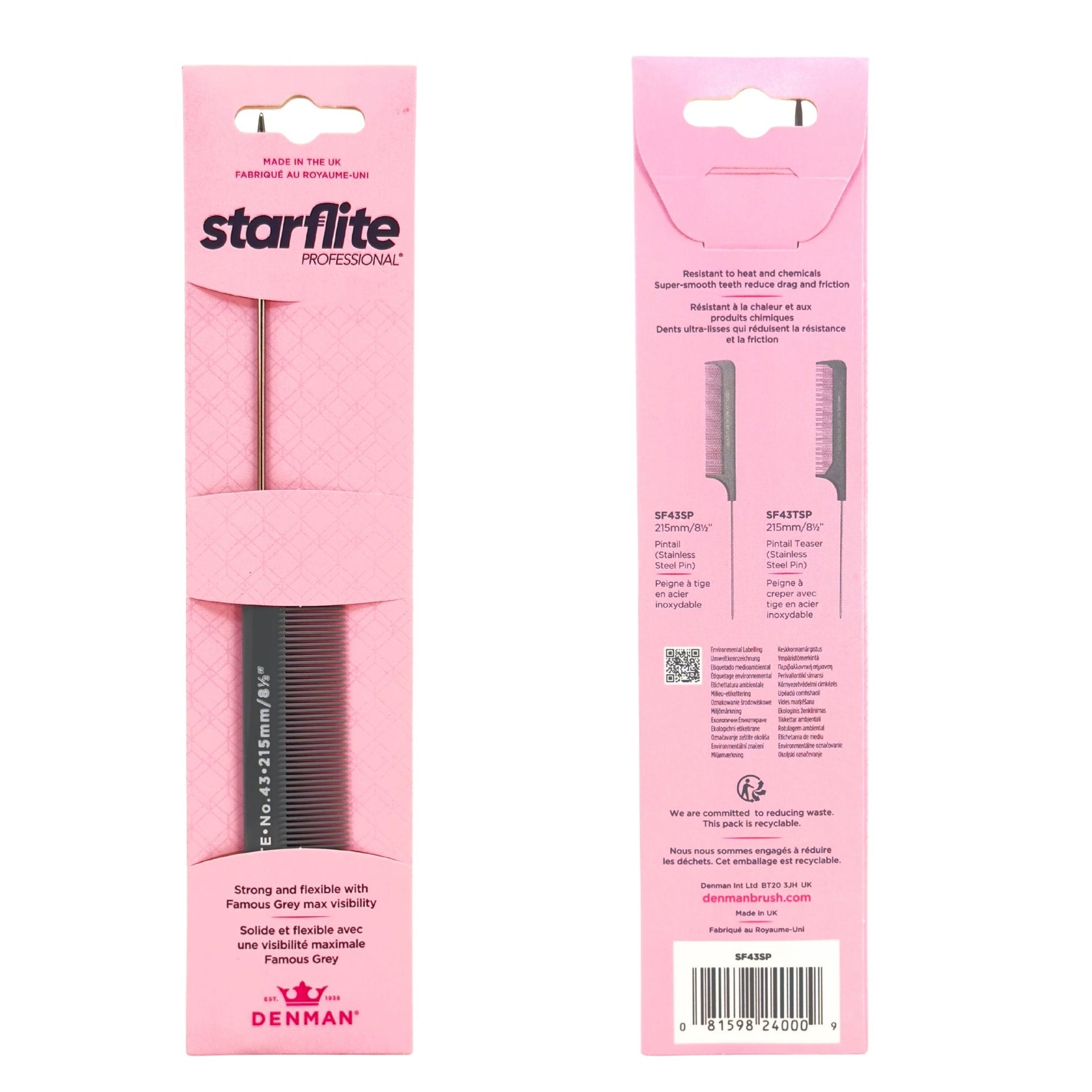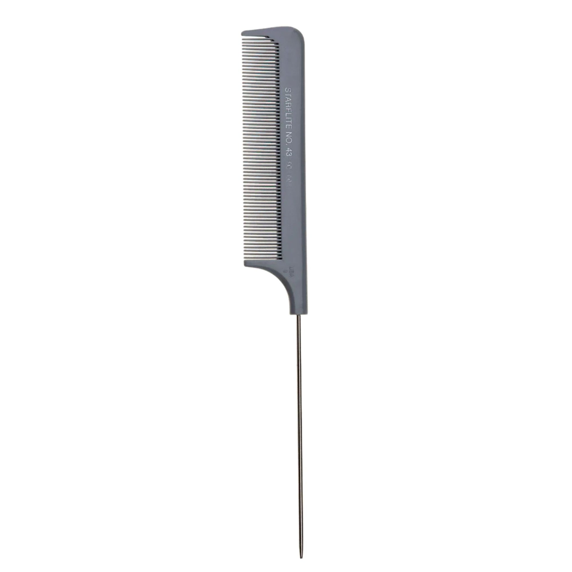 The Denman - Starflite No.43 Stylist PinTail Comb 21.5cm is a high-precision tool, essential for every professional hairstylist's kit and proudly made in the UK. Its robust body is crafted from a strong yet flexible material that is resistant to both high heat and common salon chemicals, ensuring longevity in a demanding environment. The comb's virtually unbreakable, super-smooth teeth are designed to glide through hair effortlessly, reducing friction and preventing snagging. Furthermore, the famous grey colour of the comb provides excellent visibility against all hair colours, ensuring accuracy during detailed work.