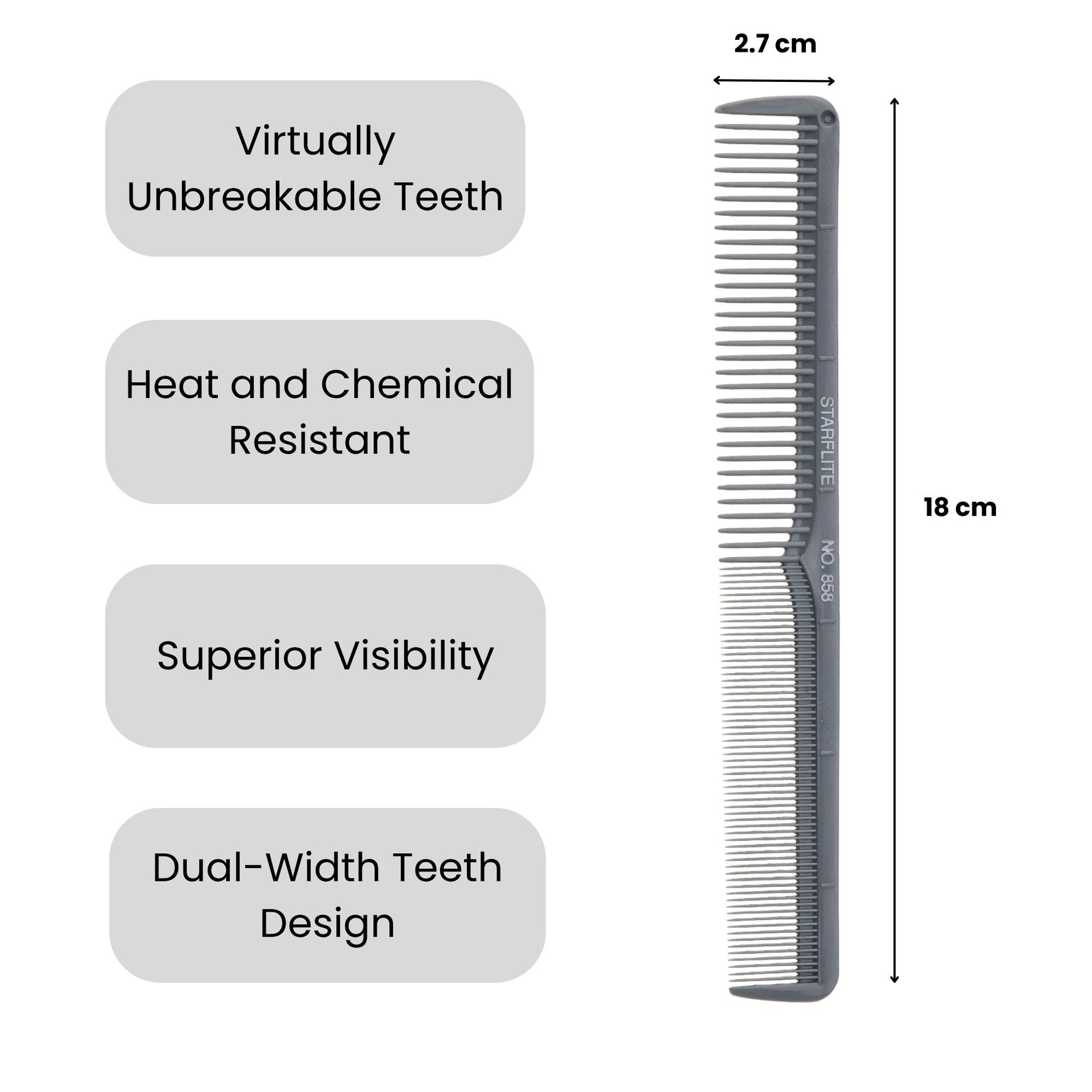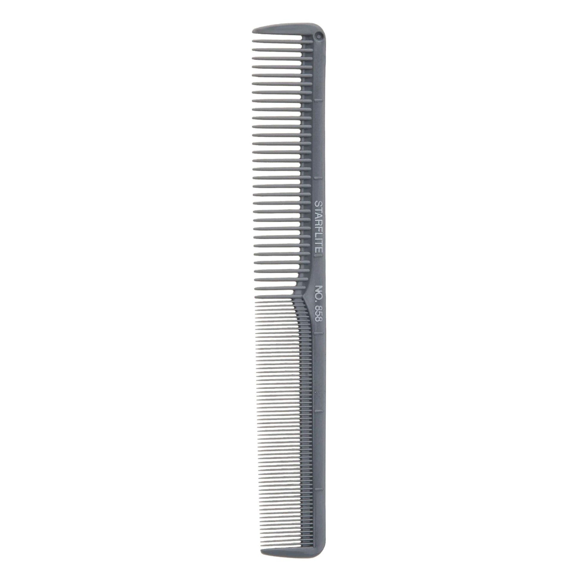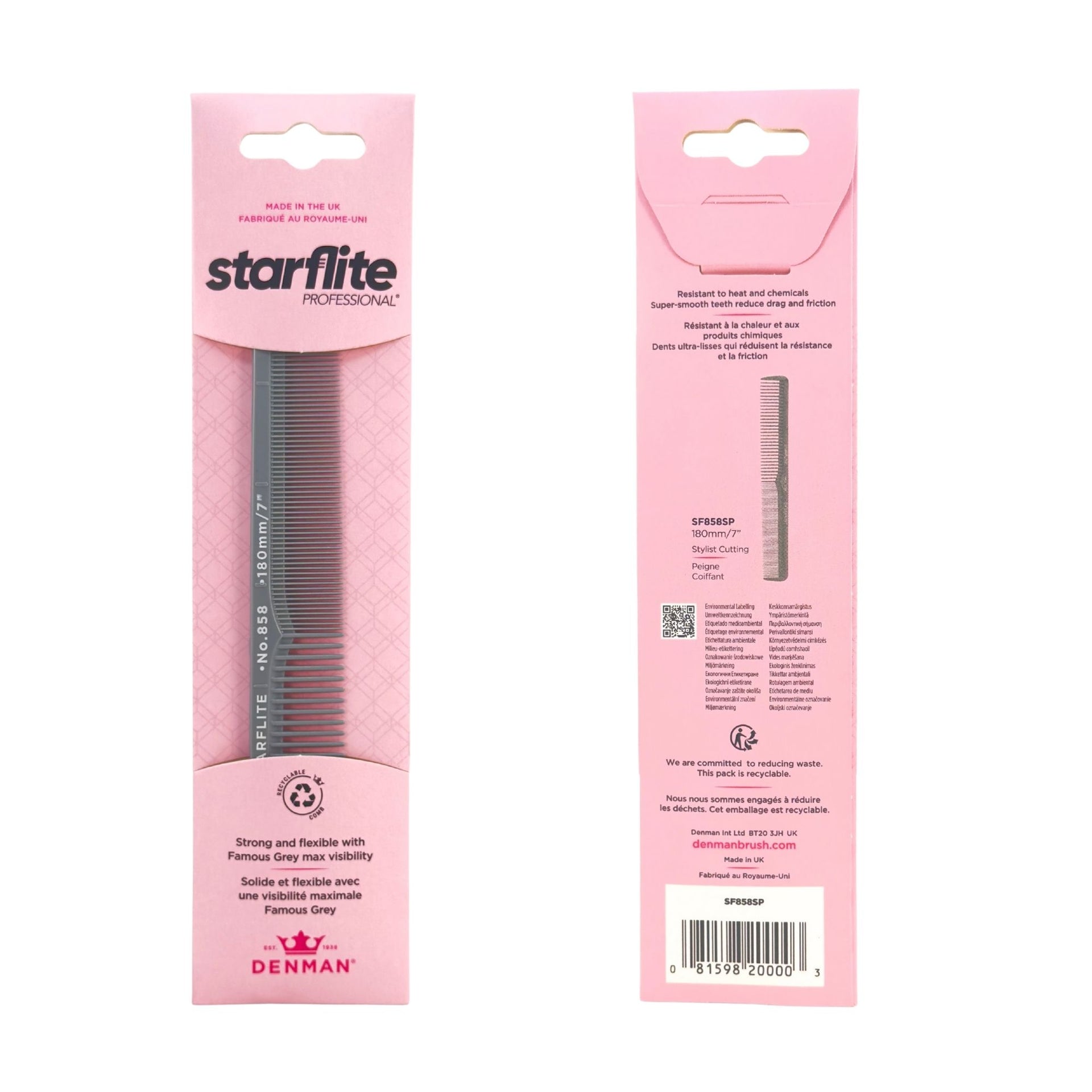 The Denman - Starflite No.858 Stylist Cutting Comb 18cm is an iconic and indispensable tool for professional stylists, barbers, and students alike, proudly manufactured in the UK. Crafted from a strong yet flexible material, this comb is designed to withstand the daily rigours of a busy salon, being both heat and chemical resistant. Its virtually unbreakable, super-smooth teeth have been treated to not scratch the scalp, reducing drag and friction as they glide effortlessly through the hair. The famous grey colour was specifically chosen to provide superior visibility against all hair colours, from dark to light.