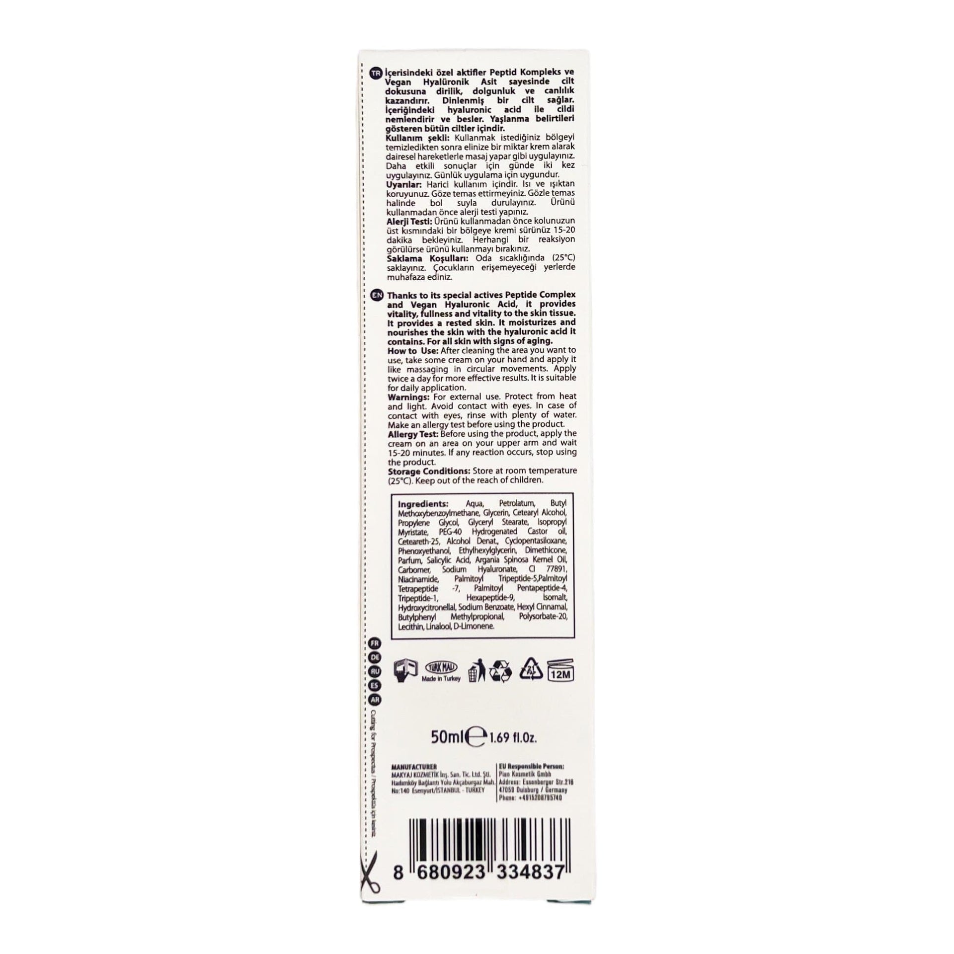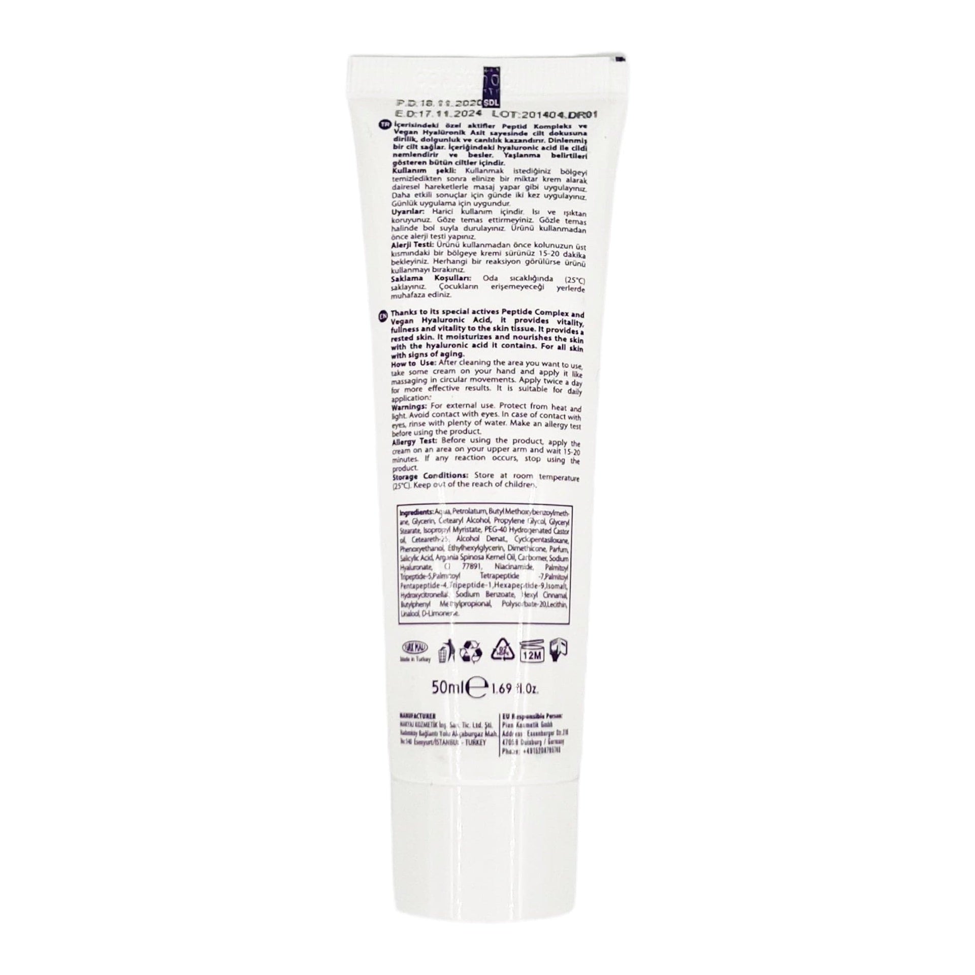 Aqua, Caprylic/Capric Triglyceride, Glycerin, Retinol, Tocopherol (Vitamin E), Ascorbic Acid (Vitamin C), Hyaluronic Acid, Ceramides, Shea Butter, Cetearyl Alcohol, Phenoxyethanol, Ethylhexyl Glycerin.