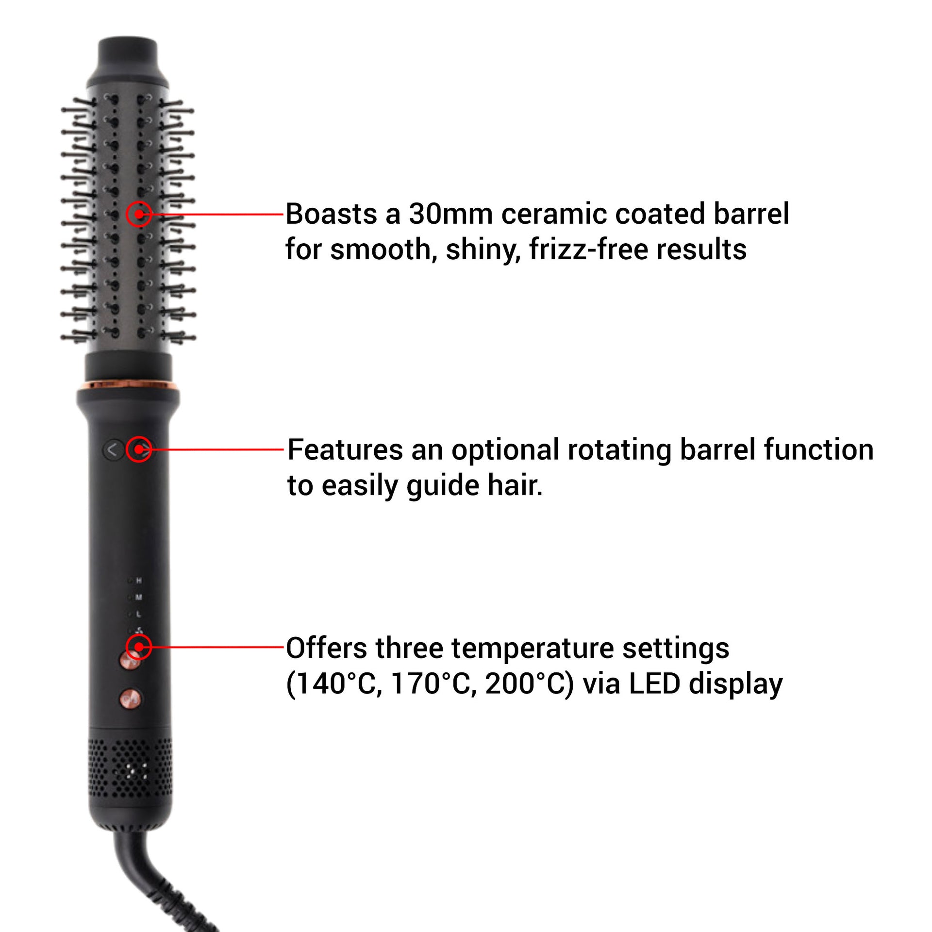 - Boasts a 30mm ceramic coated barrel for smooth, shiny, frizz-free results.