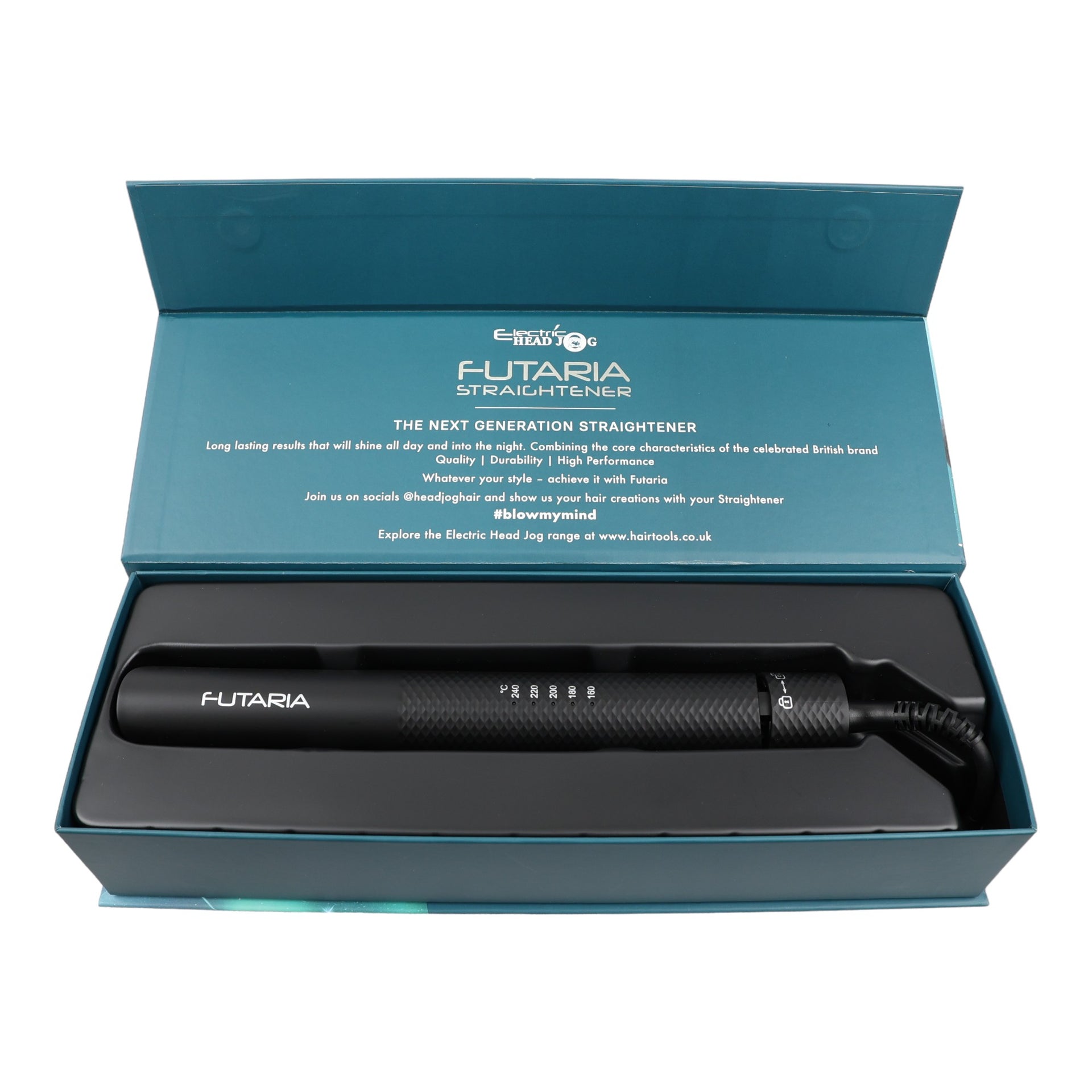 The Electric Head Jog Futaria Straightener is a premium hair styling tool that seamlessly blends advanced technology with professional-grade performance. Designed to meet the demands of both salon professionals and discerning home users, this straightener features black titanium-coated plates that glide effortlessly through the hair, delivering soft, smooth, and irresistibly shiny results. With adjustable temperature settings ranging from 160°C to 240°C in precise 20°C increments, the Futaria allows you to tailor the heat to your specific hair type, ensuring optimal styling results while minimising the risk of heat damage. The rounded edges of the plates not only allow for sleek, straight styles but also make it easy to create curls, offering a versatile all-in-one solution for your styling needs.