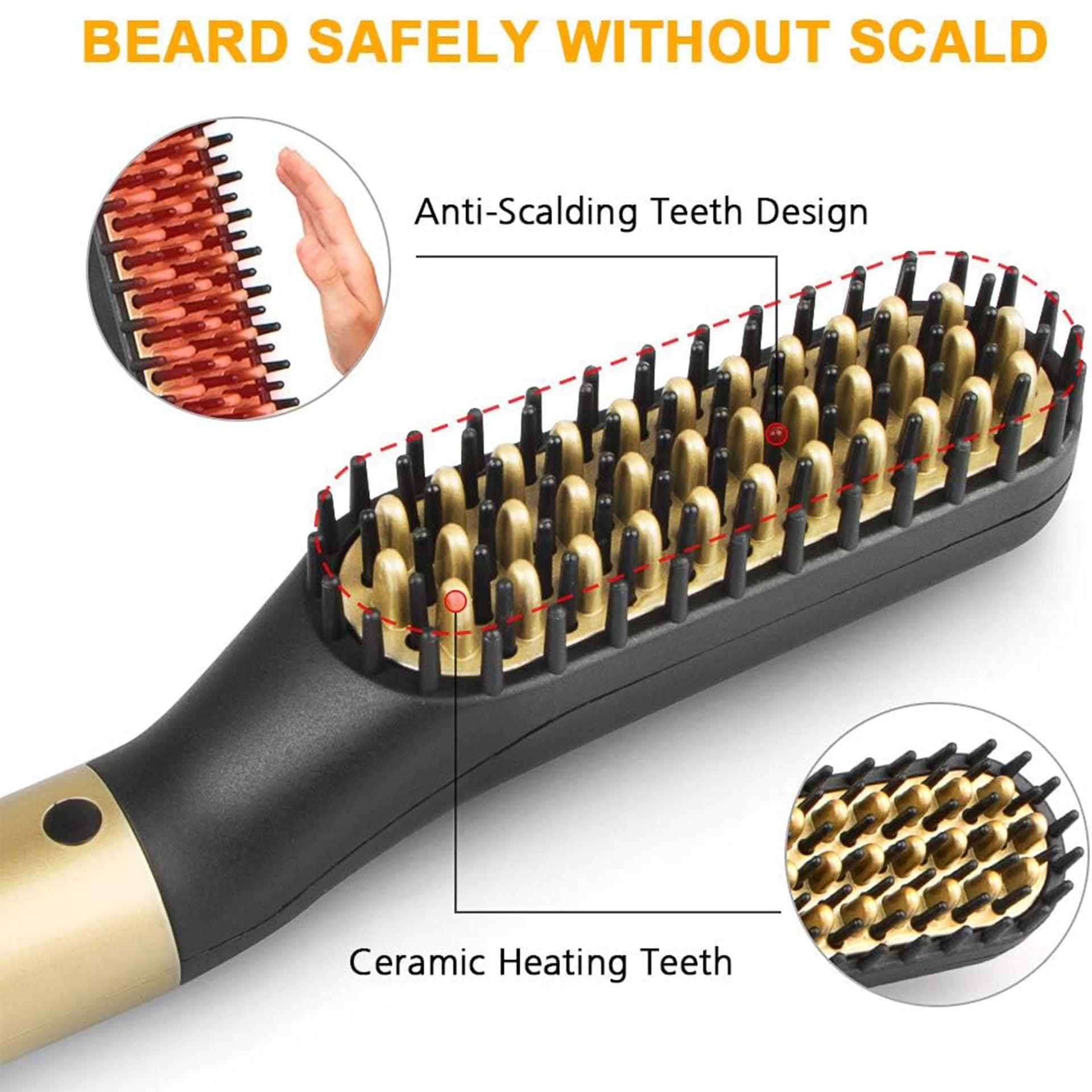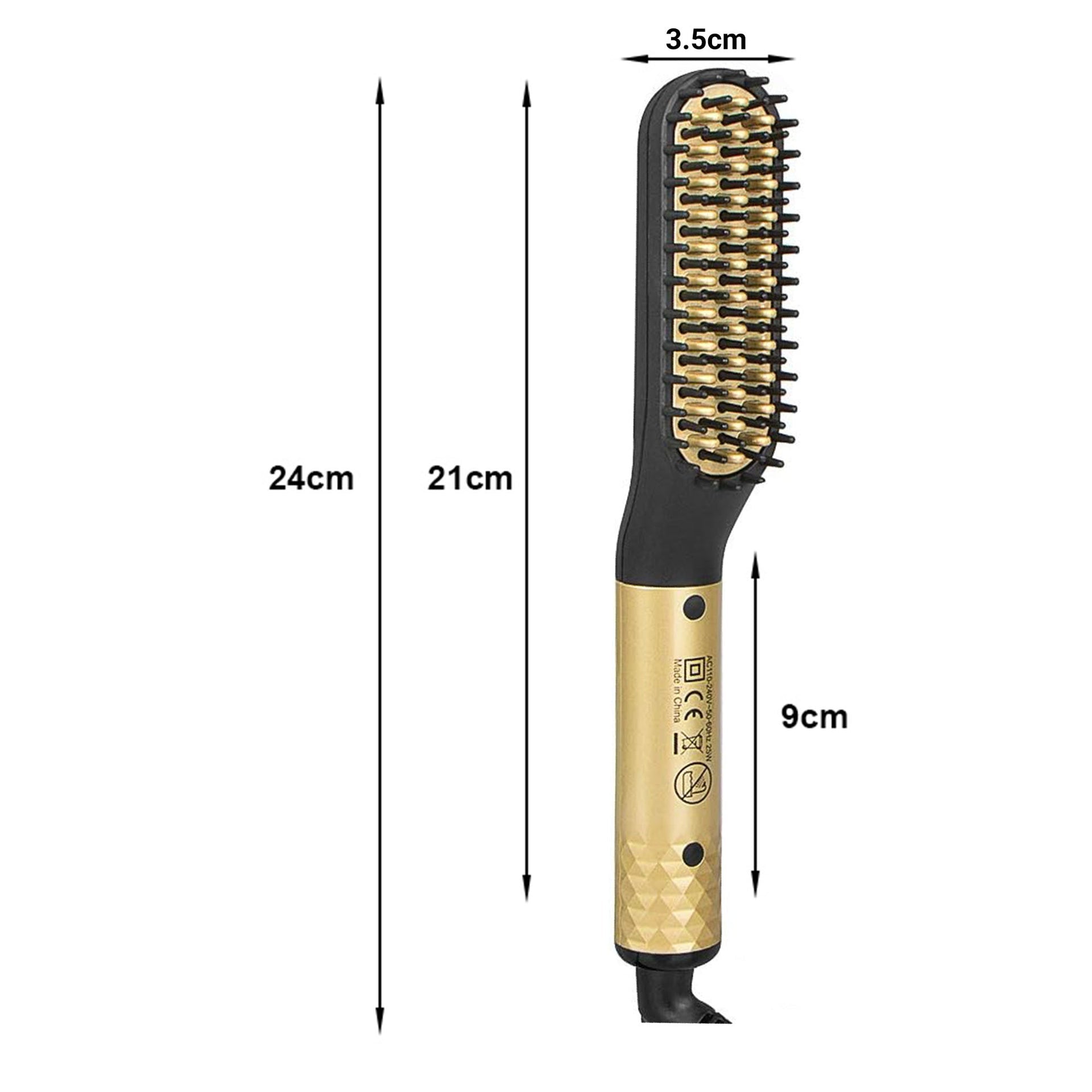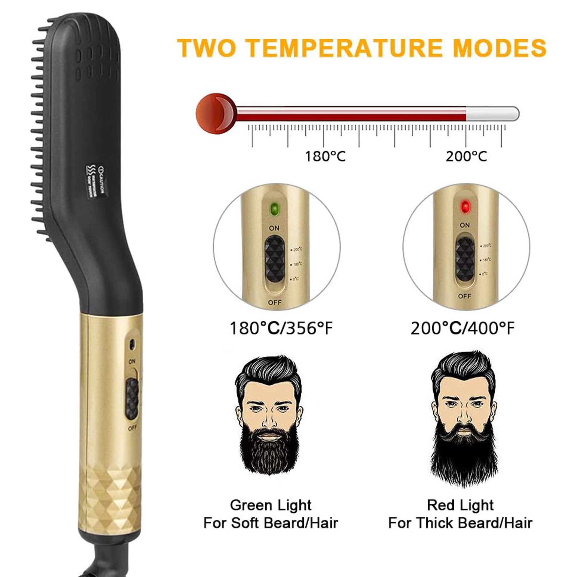 Select desired temperature, allow 30 seconds to heat up, then gently comb through dry hair or beard in a downward motion. Use shorter strokes for beard styling and longer strokes for head hair.
