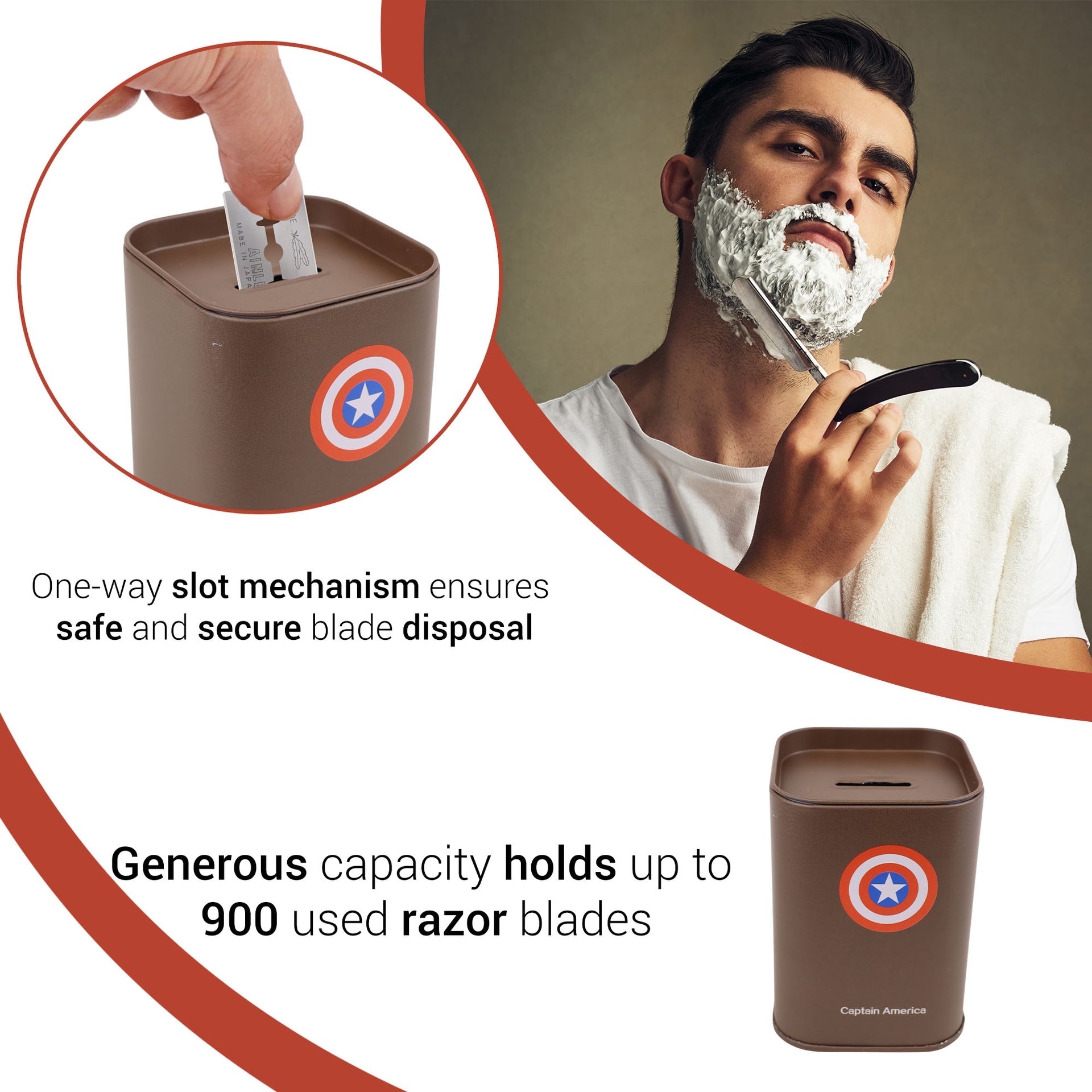 Elevate your grooming space with the Professional Blade Disposal System, featuring iconic superhero designs that combine safety with style. These specially designed containers offer a secure solution for disposing of used razor blades through a clever top-slot mechanism that prevents retrieval once deposited. The Safety Blade Bank boasts an impressive capacity capable of storing up to 900 razor blades, equivalent to approximately two decades of regular shaving waste for the average user.