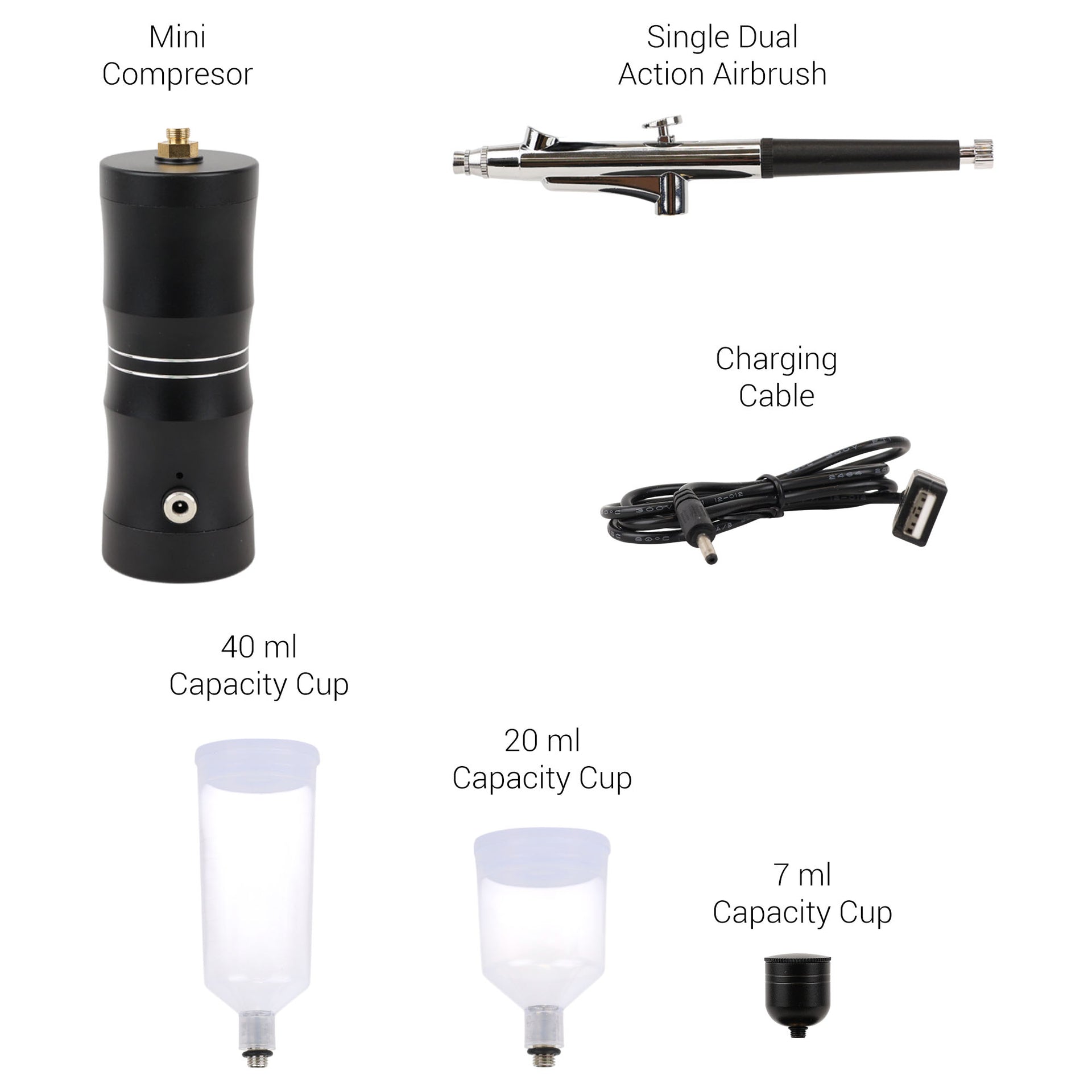 - Package Contents: Airbrush, integrated air pump with battery, 20 ml cup, 40 ml cup, 7 ml cup, USB charging cable, conversion head