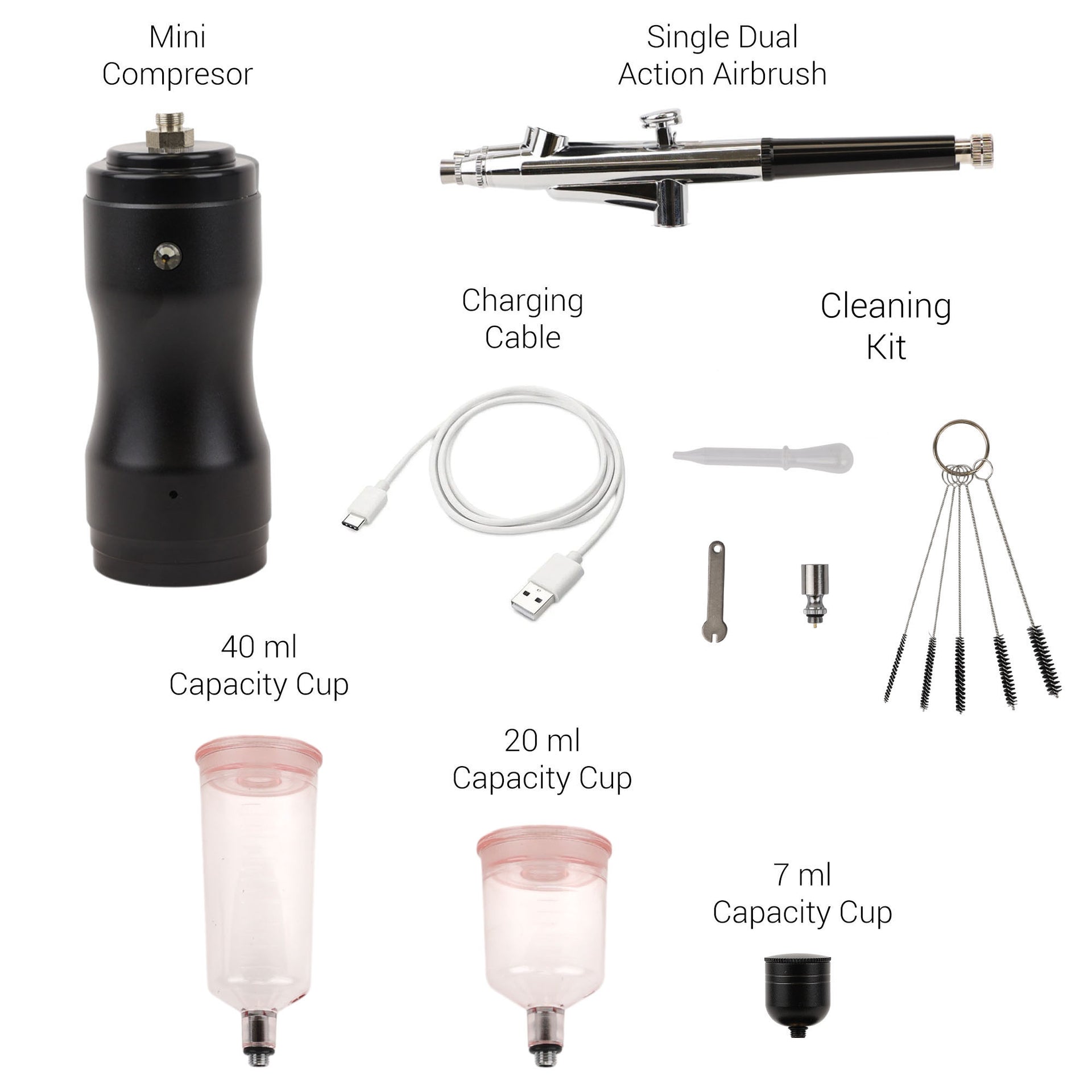- Package Contents: Airbrush, integrated air compressor, 7 ml metal cup, 20 ml plastic cup, 40 ml plastic cup, USB charging cable, 5 cleaning brushes, dropper, mini spanner, instruction manual