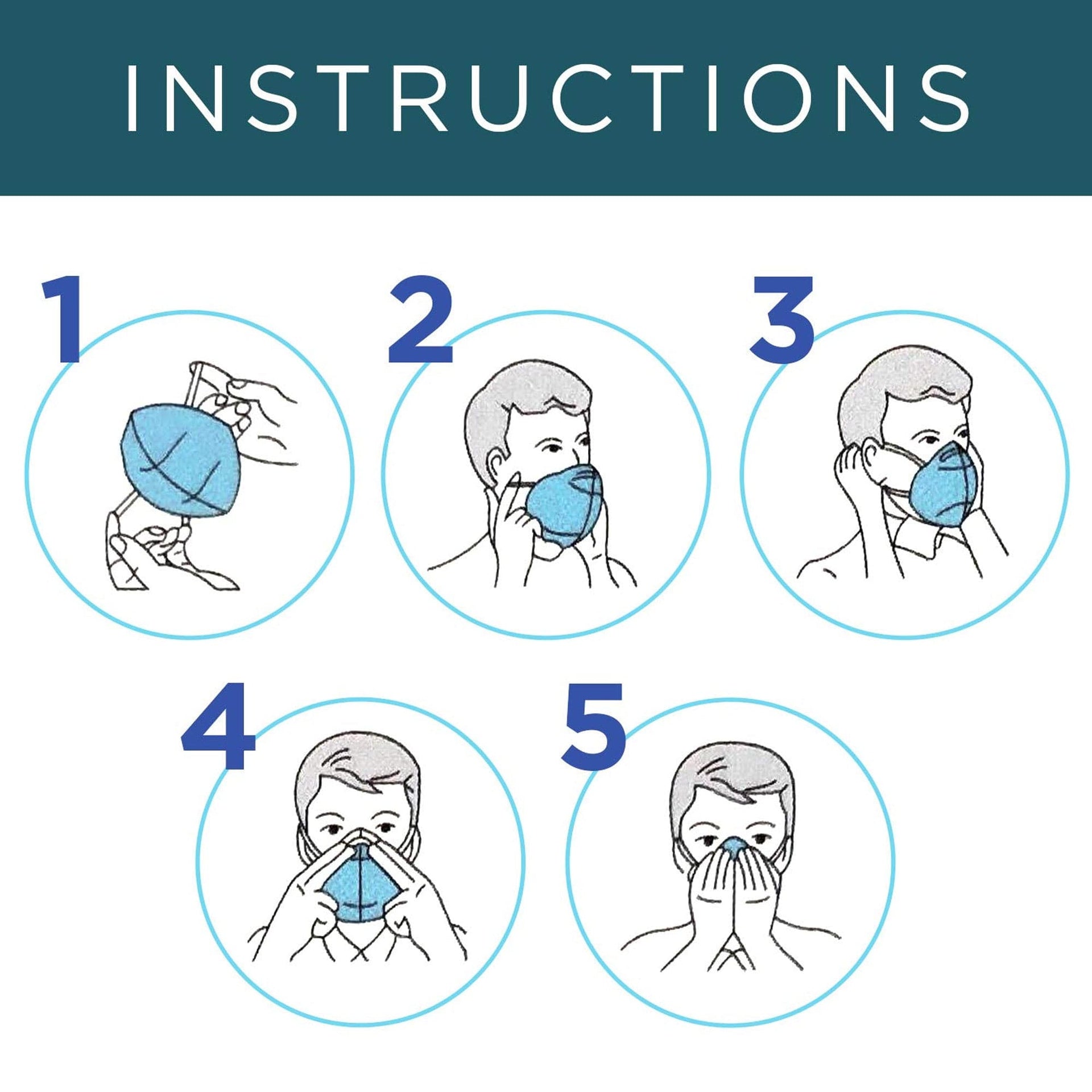 Hold the mask by the ear loops and place one loop around each ear. Pinch the adjustable nose clip to fit snugly around your nose and pull the bottom of the mask down to cover your mouth and chin.
