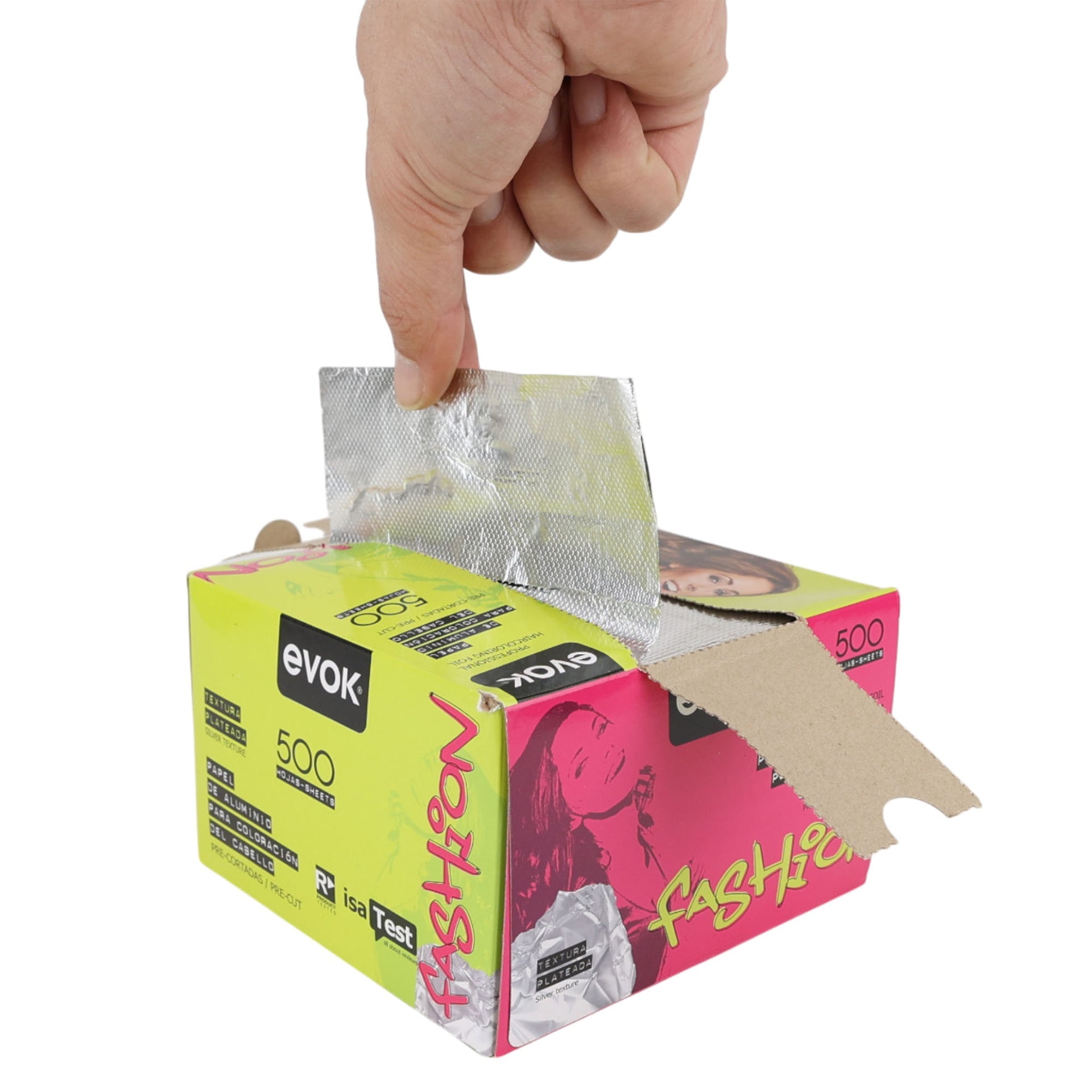 The Evok Silver Texture Hair Foils come in a convenient pop-up box containing 500 ready-to-use sheets, streamlining your colour service workflow. The embossed pattern creates microscopic air pockets that enhance product grip and prevent colour migration, ensuring clean, precise results every time. These versatile sheets can be folded or laid flat to accommodate various techniques, from classic highlights to contemporary balayage applications. The superior construction eliminates the need for additional tissue backing, saving time and reducing waste in busy salon environments.