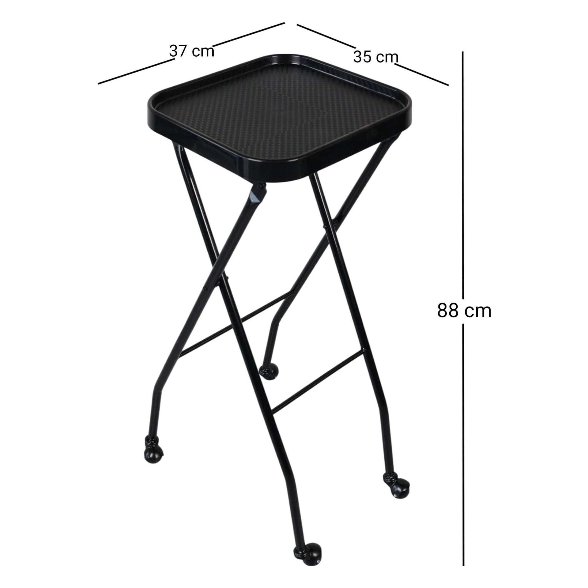 Enhance your styling efficiency with the Eson Folding Salon Trolley, a professional-grade mobile workstation designed for the modern salon environment. The spacious 35x37cm tray provides ample space for organising all essential styling tools, colour supplies, and treatment products. This versatile trolley features a practical standing height of 88cm, ensuring comfortable access to your tools whilst maintaining proper posture throughout your styling sessions. The robust construction supports daily salon use, whilst the sleek black finish adds a professional touch to any styling station.