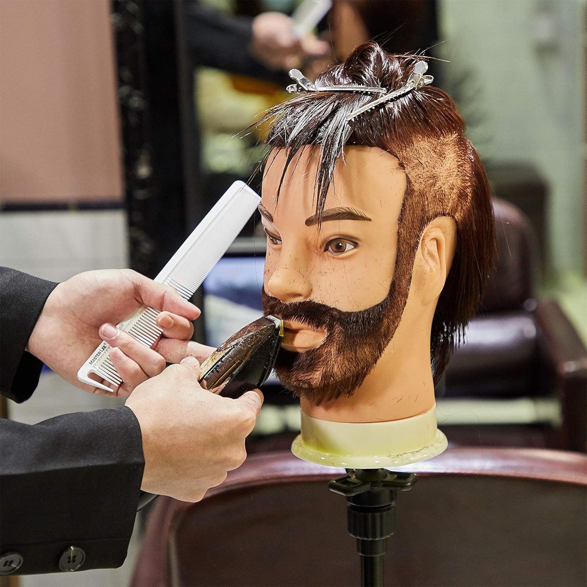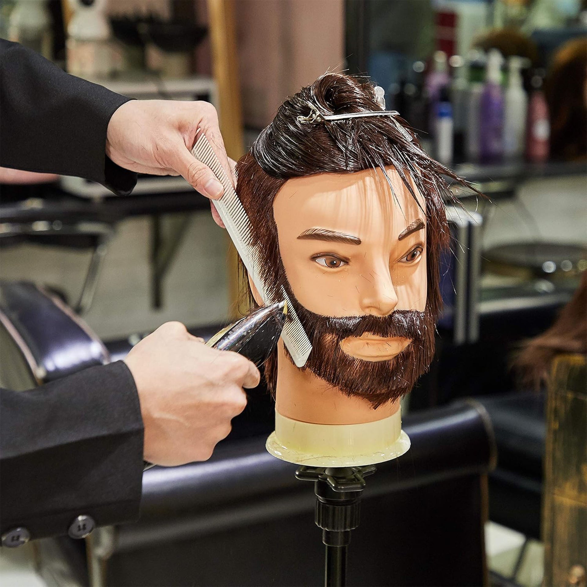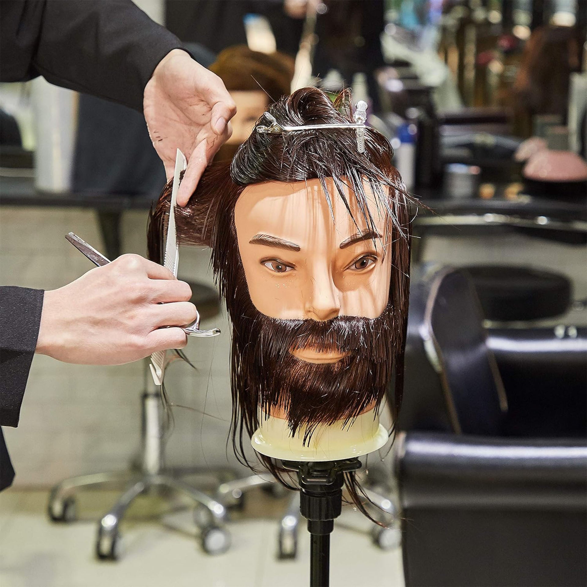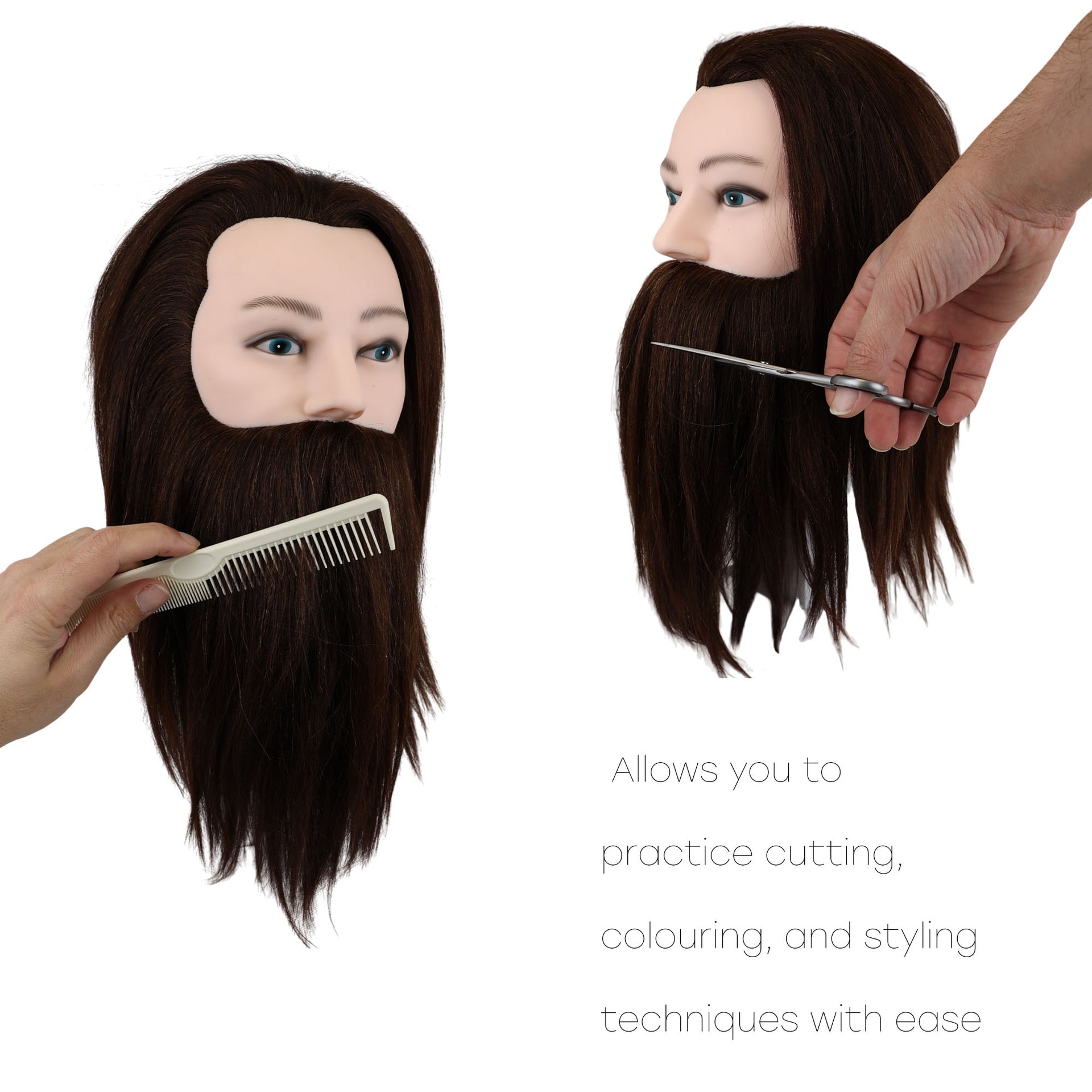 Secure mannequin head firmly to stand (not included) before beginning any styling work. Treat hair and beard as you would a real client's hair.