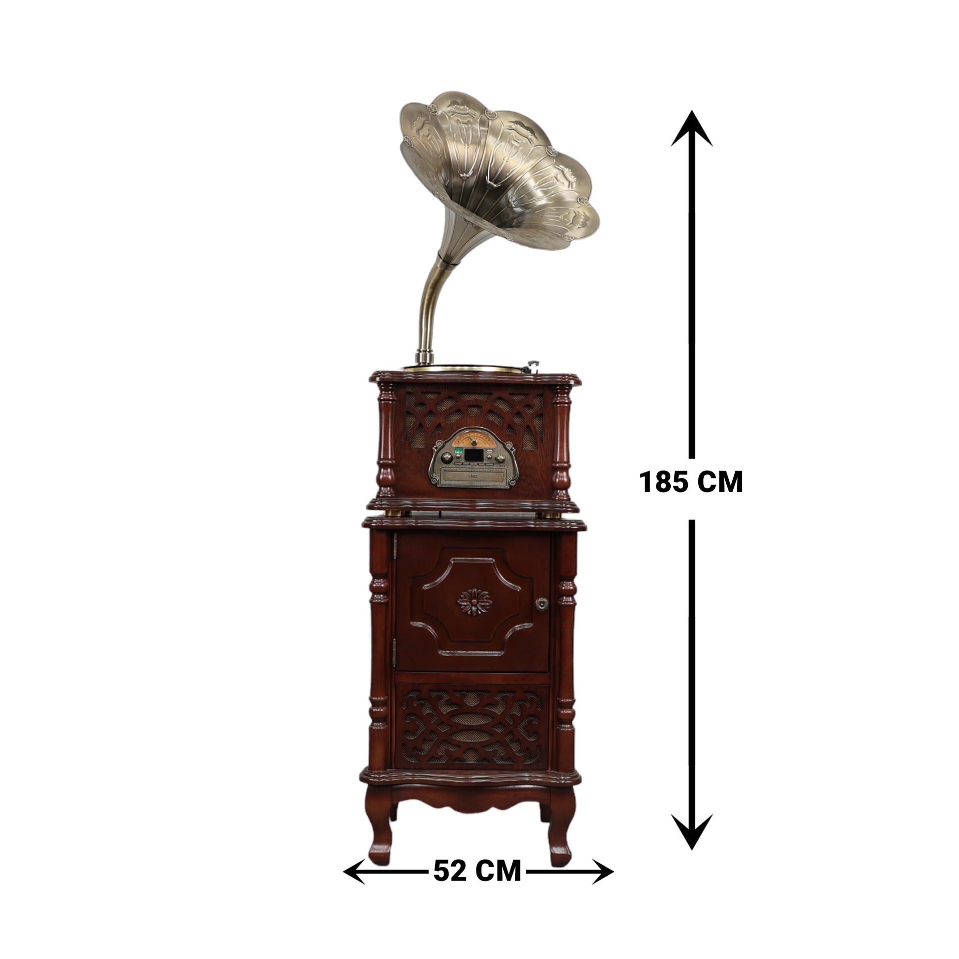The Eson - Gramophone Speaker Wireless Remote Control Wooden Cabinet 185cm is a stunning blend of vintage aesthetics and modern technology, making it a perfect addition to any home decor. Crafted from high-grade solid wood, this dual-speed phonograph supports 33/45 RPM and is compatible with 18/25/30 cm record formats. The body and bass cabinet are built to deliver exceptional sound quality, while the classical pure copper loudspeaker, hand-spliced from pure steel, adds an elegant touch. The copper horn features a mould-shaped dust cover inside, ensuring durability and a pristine look. The lathe forming screw structure used in the connections adds to its robustness, making it a reliable and stylish piece.