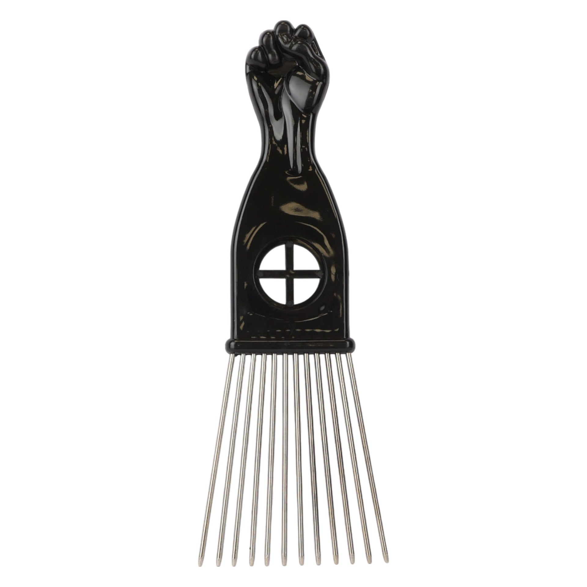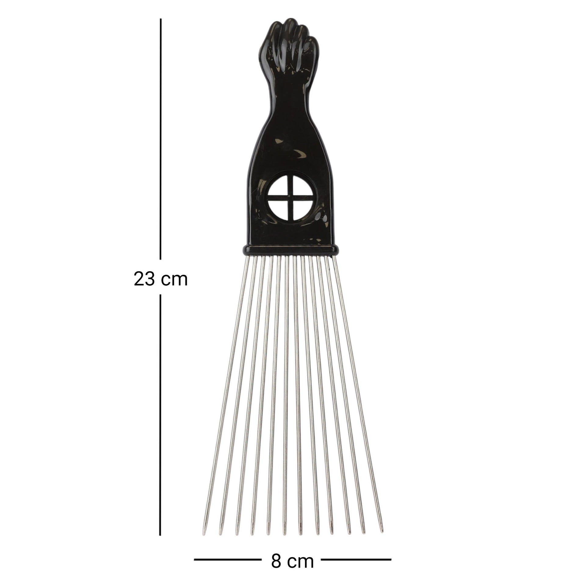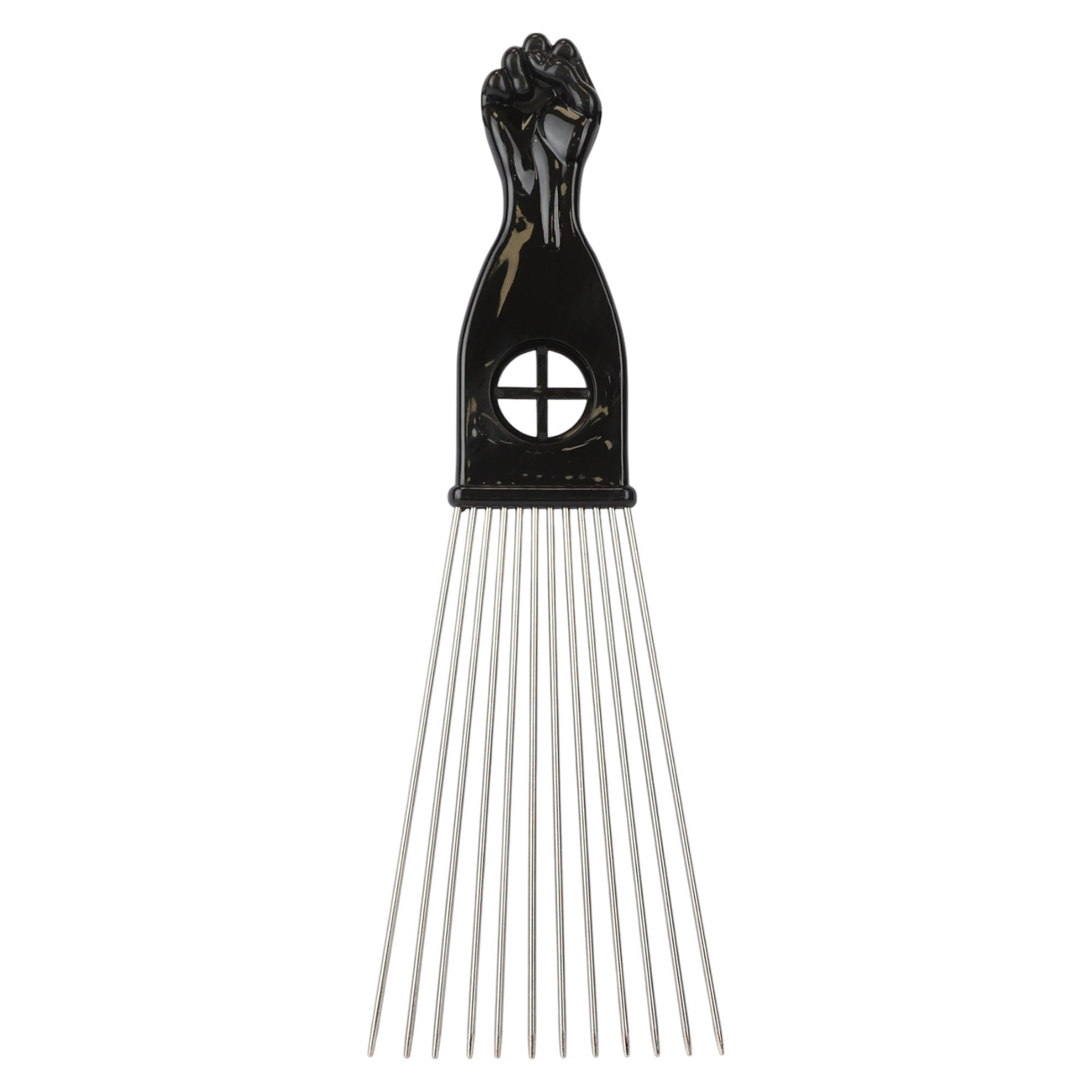 Transform your styling capabilities with the Eson Metal Hair Pick collection, featuring precision-engineered stainless steel teeth and an iconic black power fist handle design. Each pick in the range showcases premium craftsmanship with durable metal teeth that maintain perfect alignment for consistent styling results. The distinctive handle incorporates a ventilation port for enhanced airflow, while the ergonomic grip ensures comfortable control during extended styling sessions.