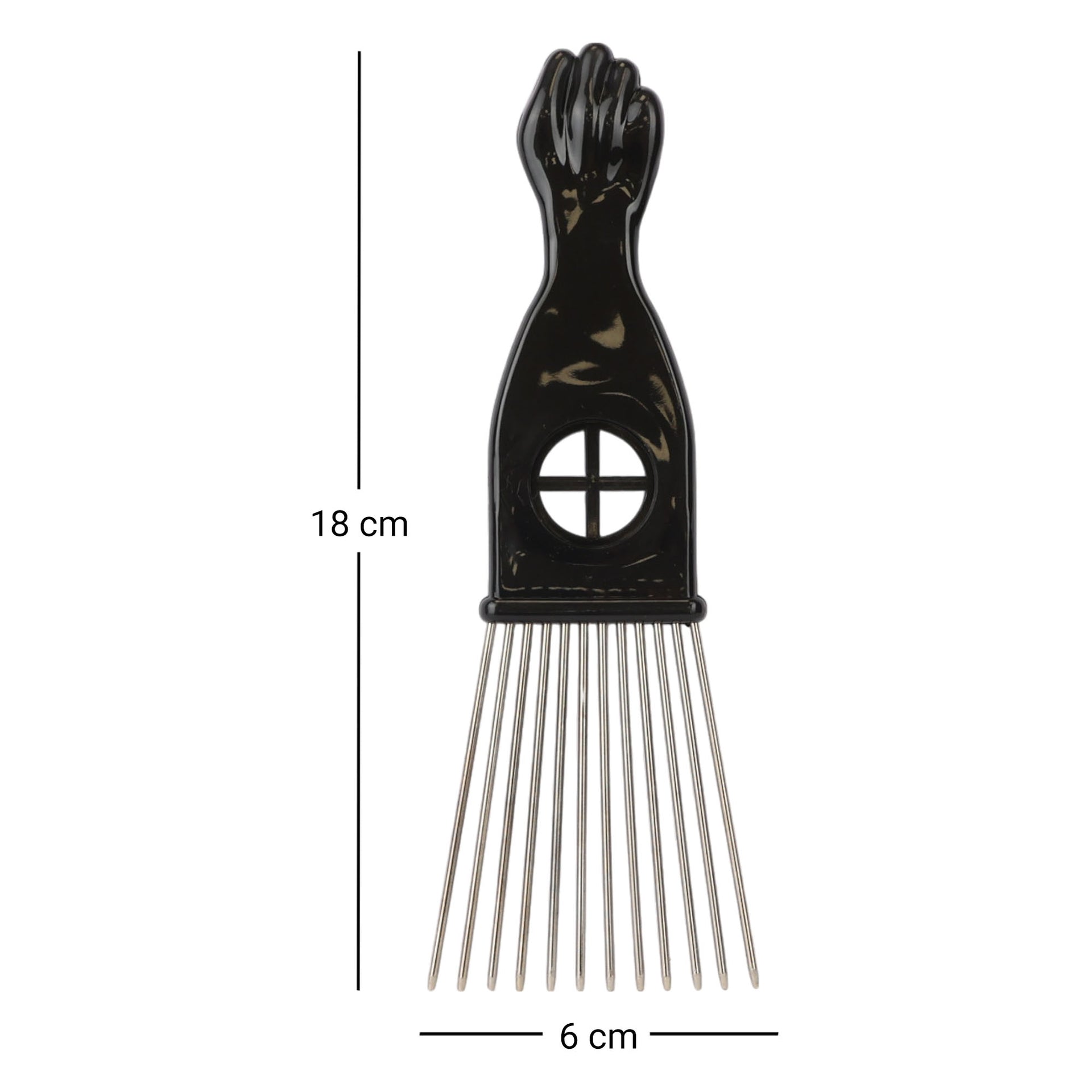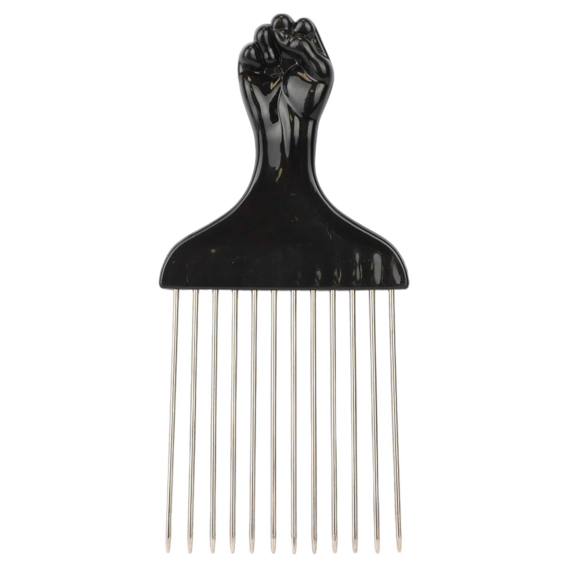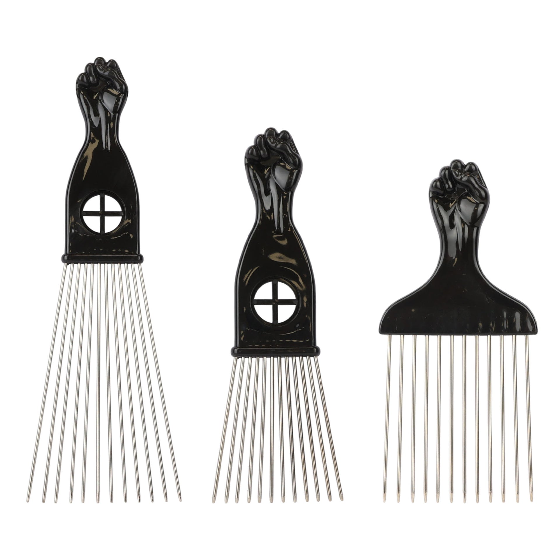 Transform your styling capabilities with the Eson Metal Hair Pick collection, featuring precision-engineered stainless steel teeth and an iconic black power fist handle design. Each pick in the range showcases premium craftsmanship with durable metal teeth that maintain perfect alignment for consistent styling results. The distinctive handle incorporates a ventilation port for enhanced airflow, while the ergonomic grip ensures comfortable control during extended styling sessions.