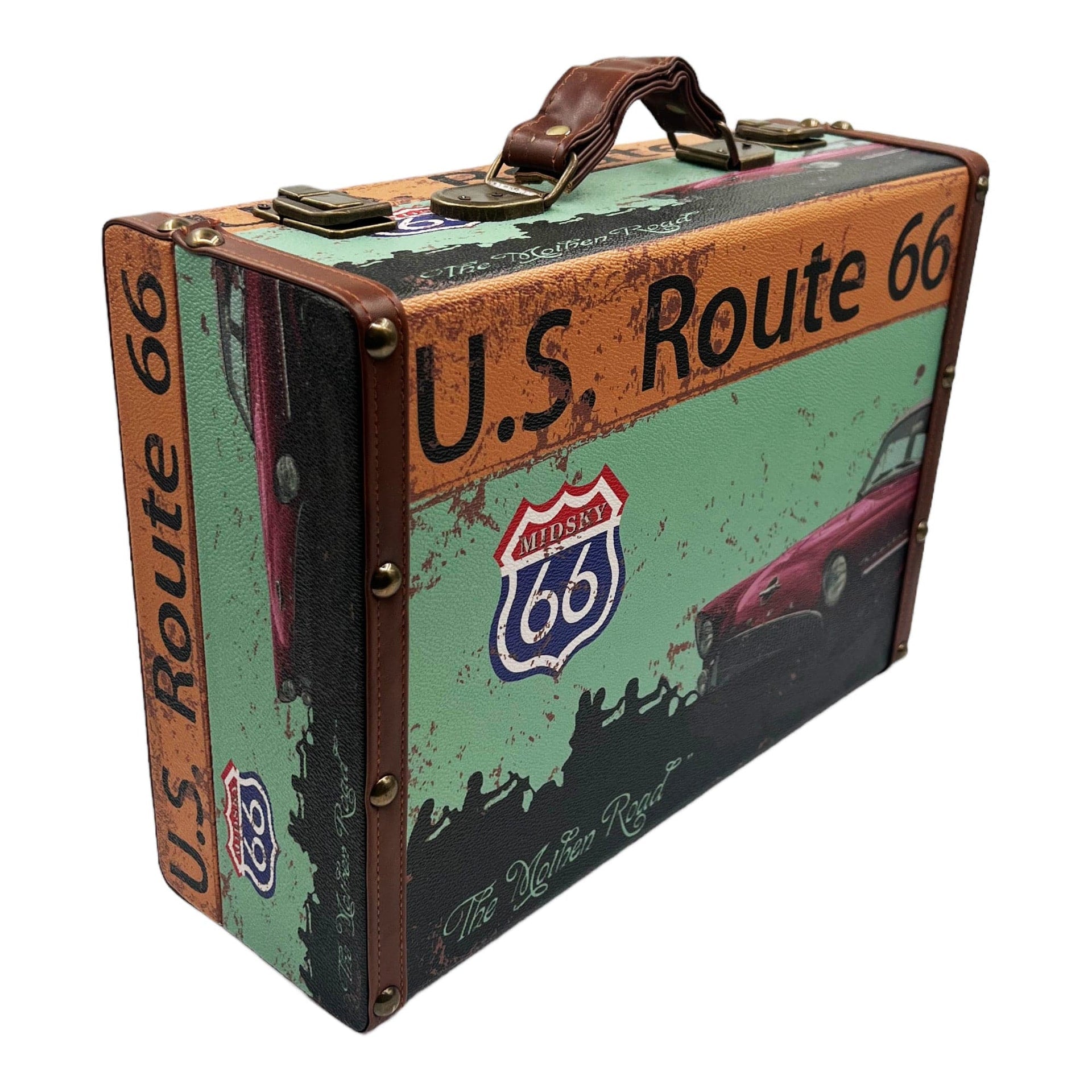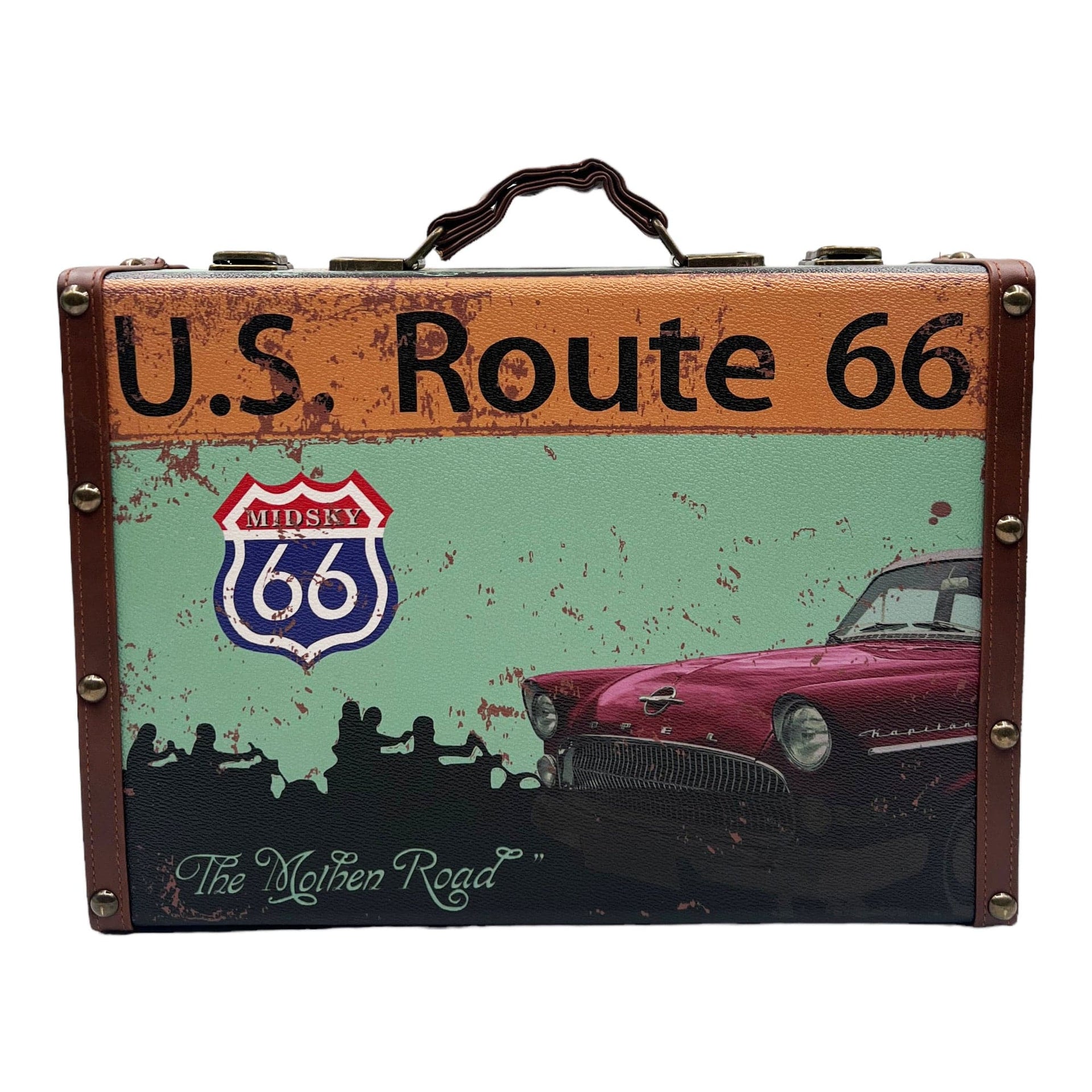 - Colour: Distressed green/brown with "U.S. Route 66" and vintage car print, brown leather accents.