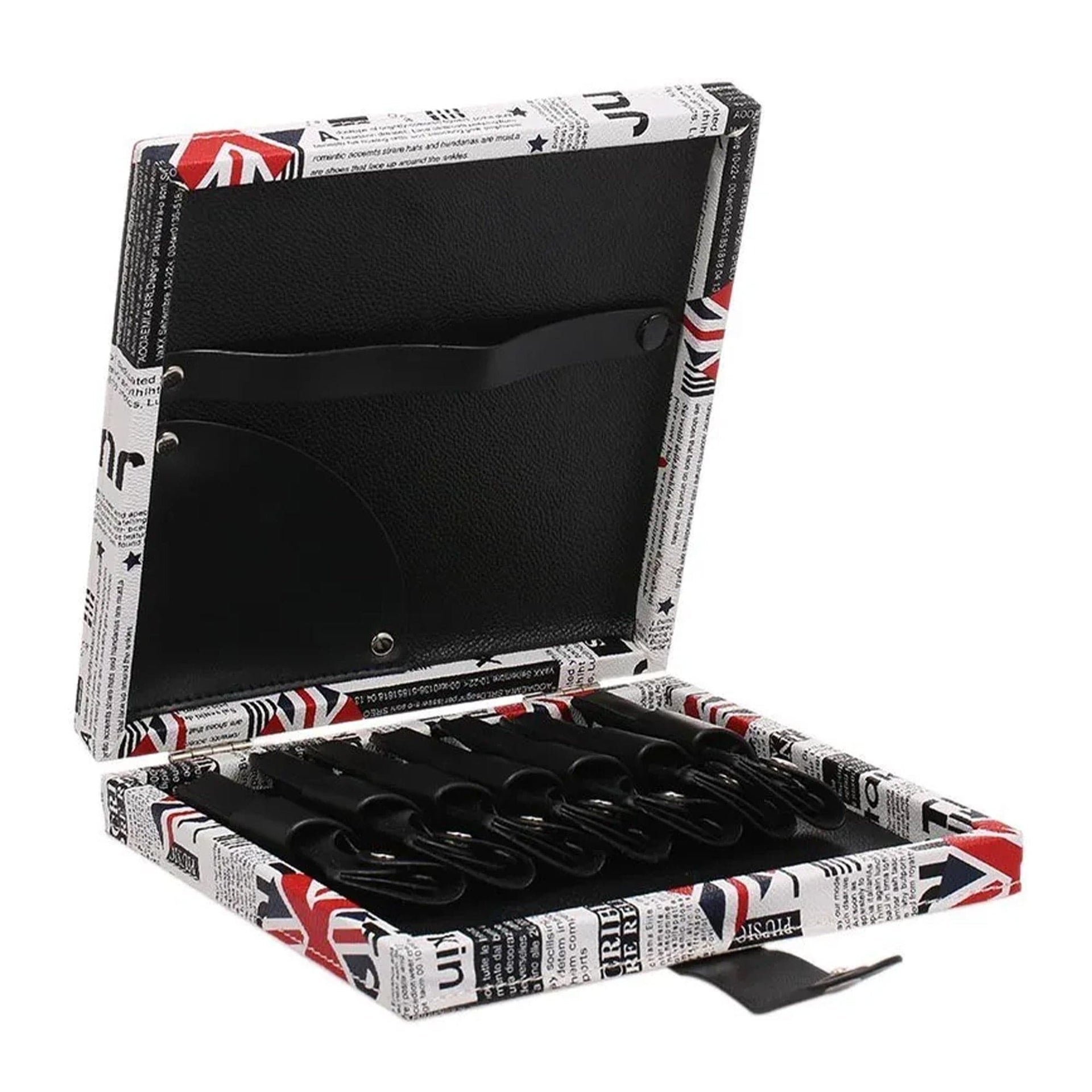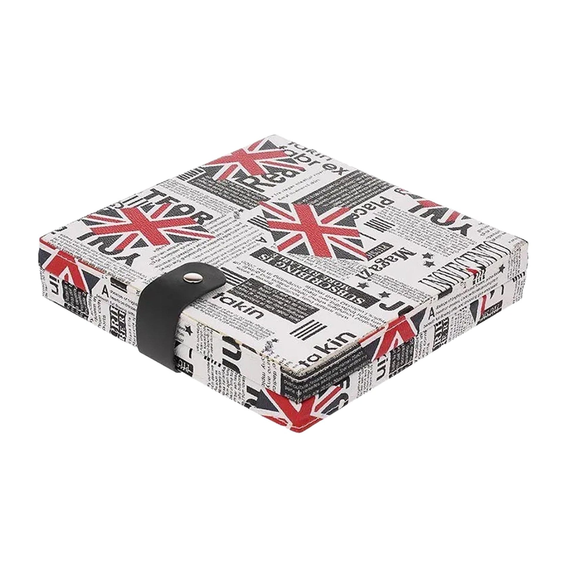 - Colour: Newspaper print pattern with black and red accents, black internal elements.