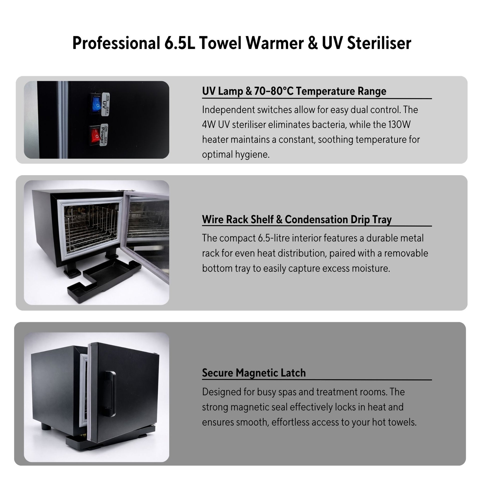 Eson - Hot Towel Warmer Cabinet with UV Steriliser - 6.5L - Matte Black is a compact and practical solution for keeping towels warm, fresh and ready for professional treatments. Designed for beauty rooms, spas, salons and wellness spaces, it combines reliable towel heating with UV sterilising support to help maintain a cleaner working environment. Its 6.5-litre capacity makes it ideal for smaller treatment areas where space matters but performance still needs to be dependable. The cabinet maintains a steady working temperature of approximately 70–80°C, helping you prepare warm towels for facials, massage treatments, barber services and other client care routines. The matte black metal body gives the unit a clean, modern look that suits professional interiors. With its compact footprint and straightforward design, it fits neatly on worktops without taking up unnecessary room. It is a smart and professional choice for businesses that want comfort, hygiene and convenience in one compact unit.