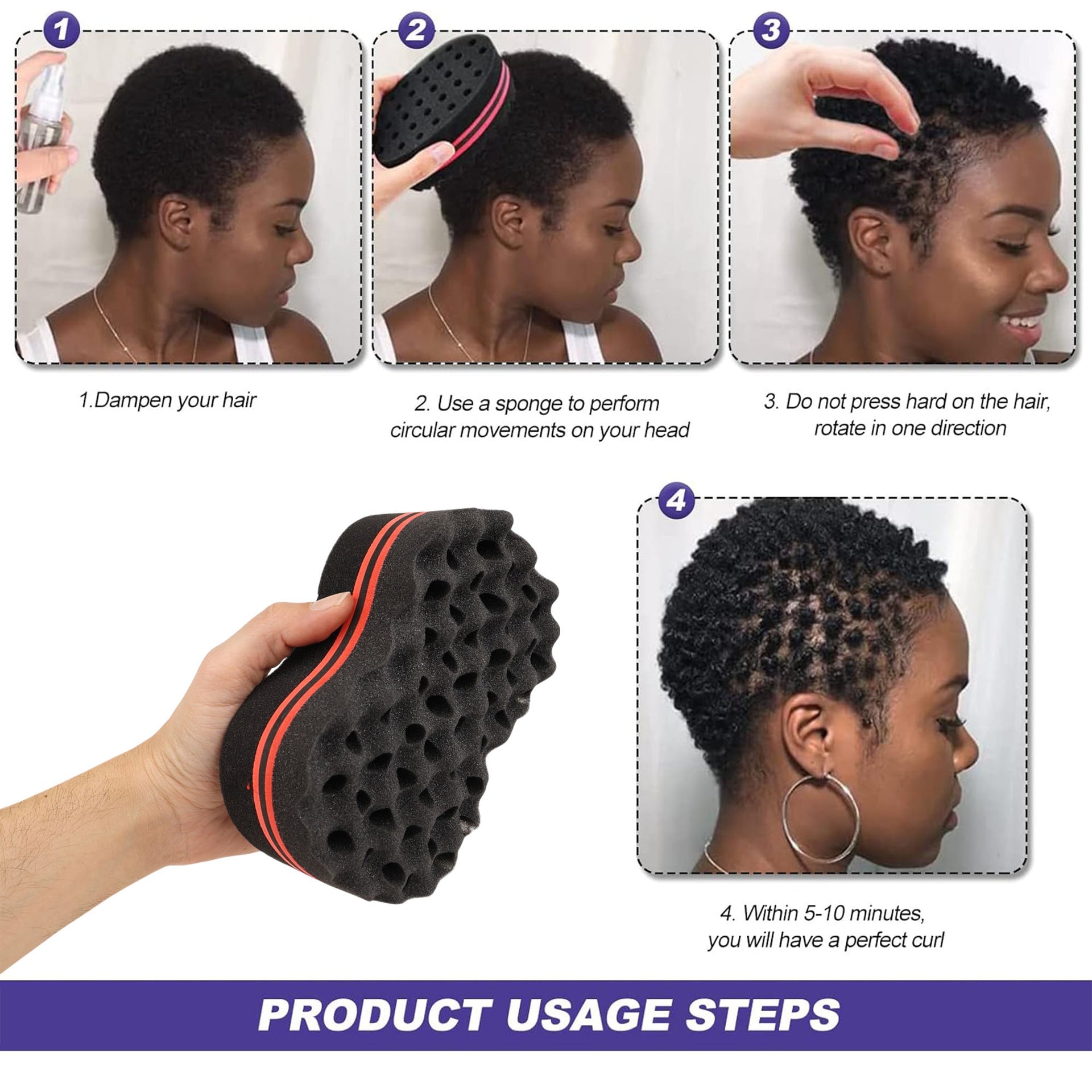 Apply preferred styling product to slightly damp hair. Using gentle circular motions, work the sponge through hair in the desired direction. Alternate sides for different pattern sizes.