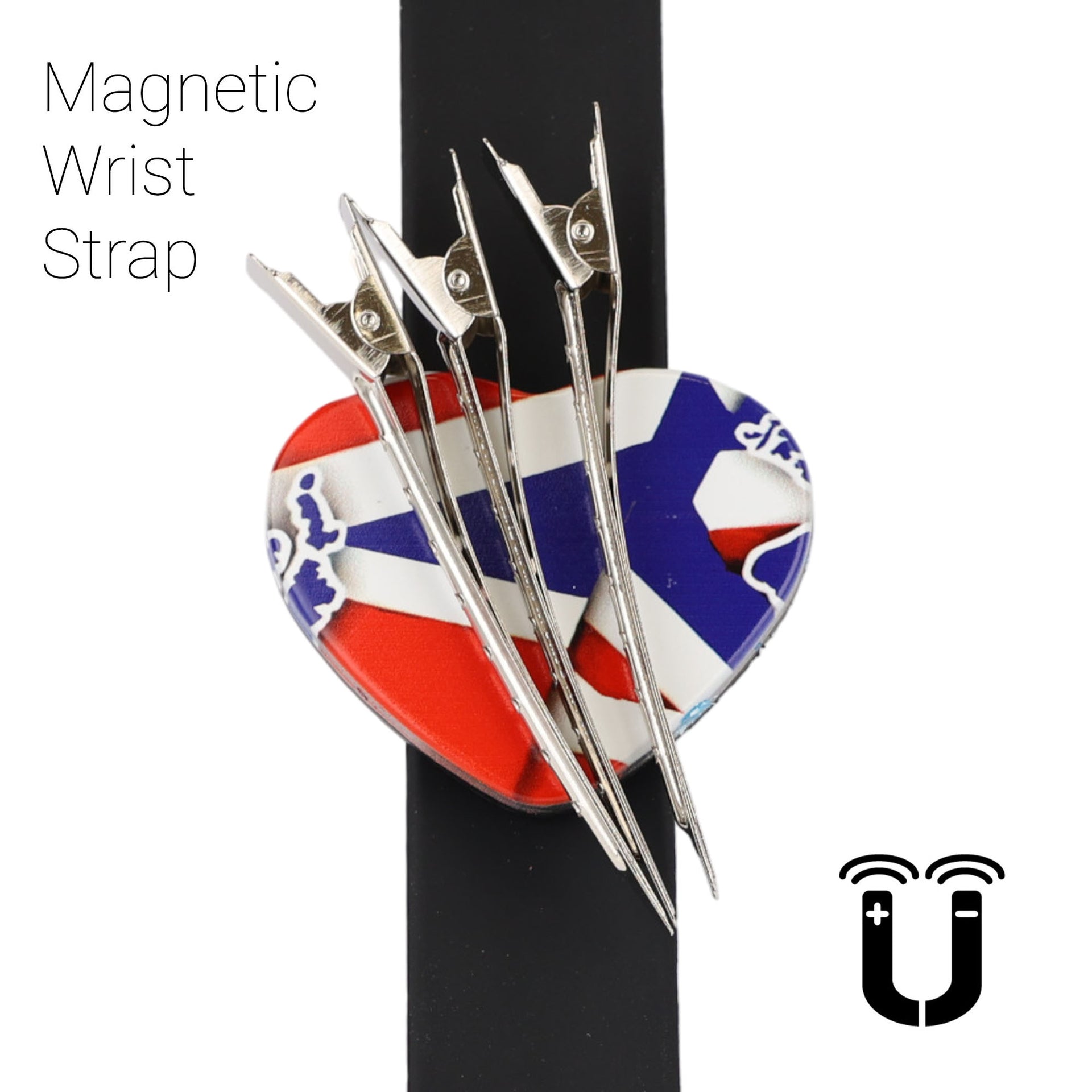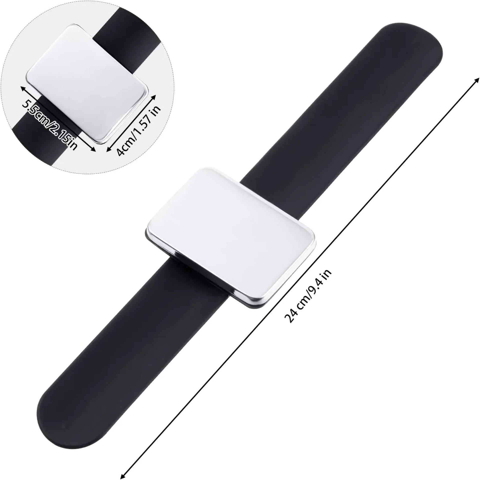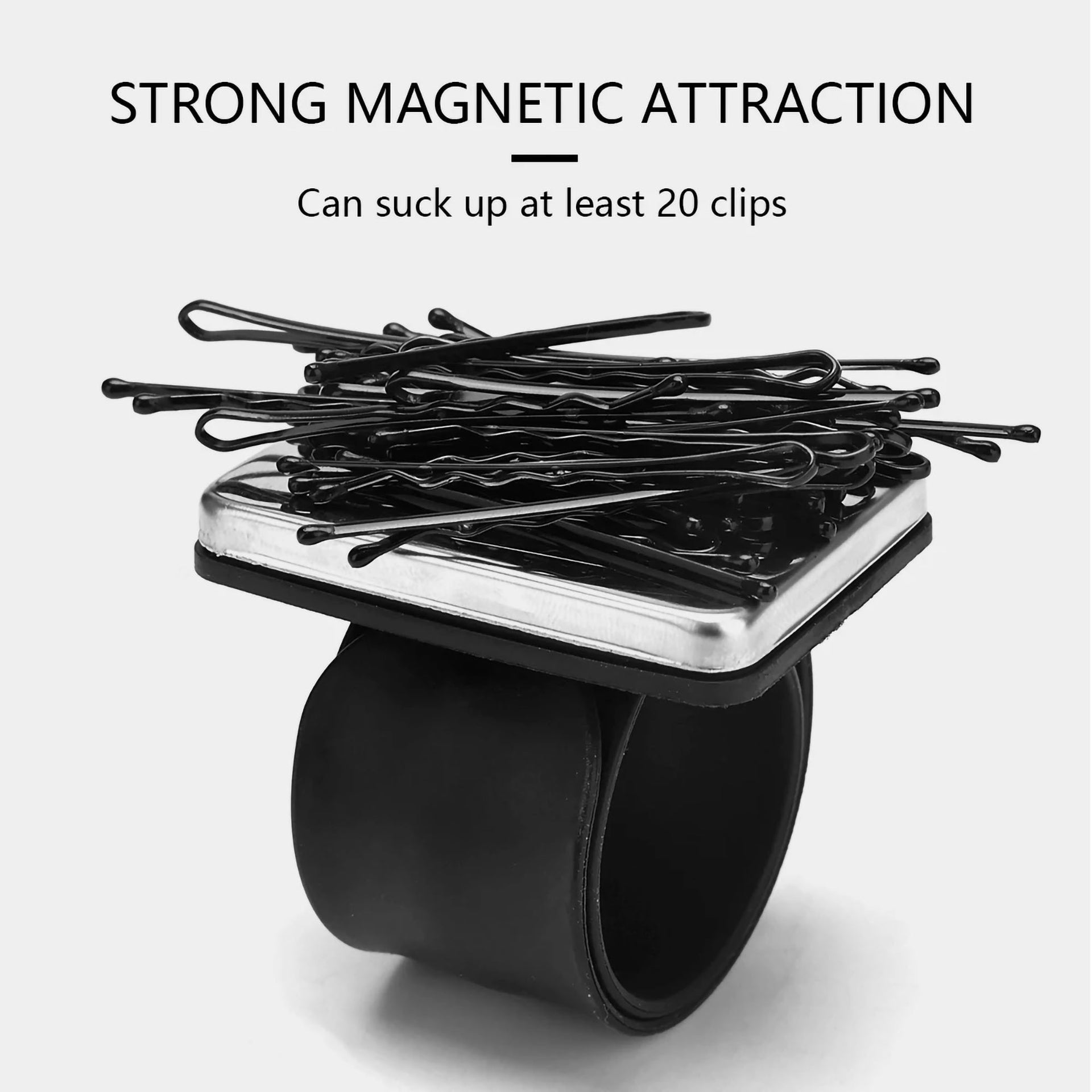 Secure the band comfortably around wrist, ensuring the magnetic surface faces outward for easy access to clips and pins during styling sessions.