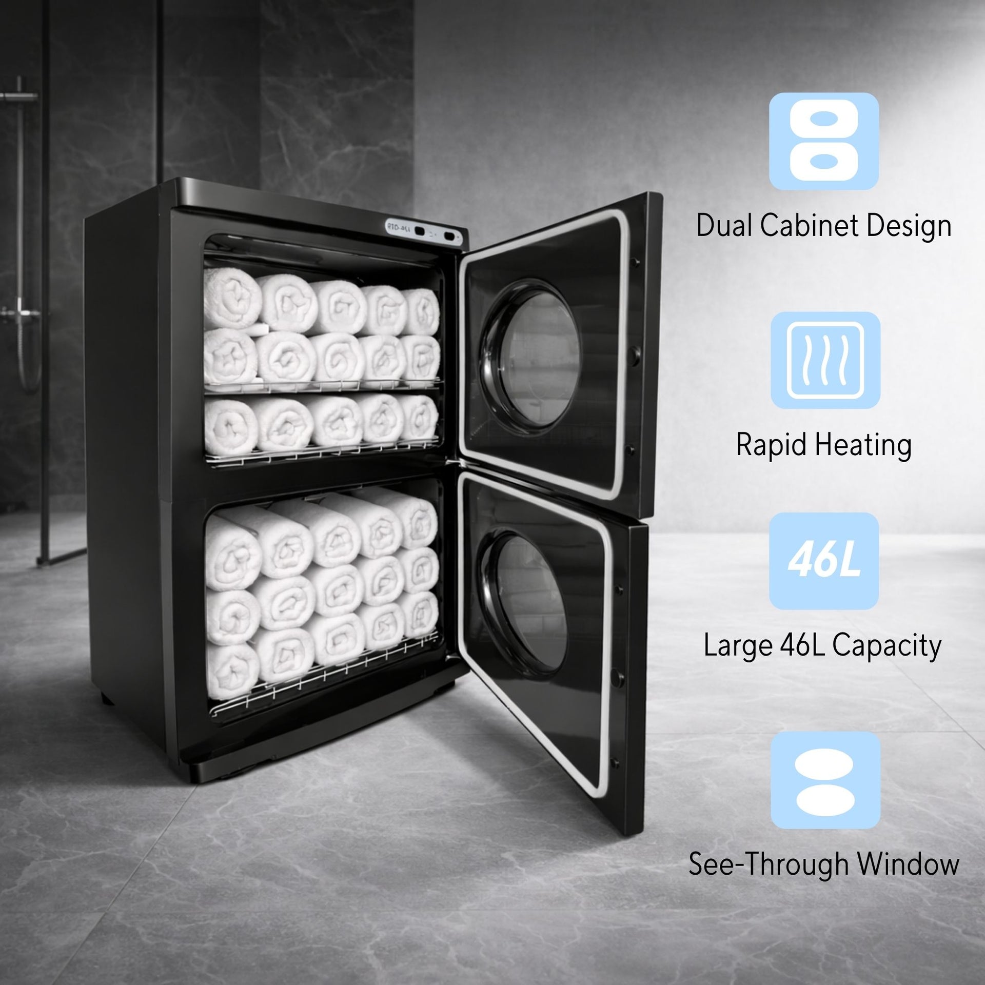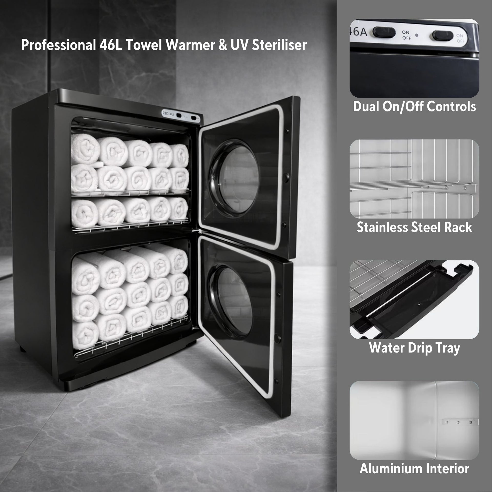 Eson - Professional 46L Hot Towel Warmer Cabinet with UV Steriliser is a high-capacity solution for keeping towels warm, fresh and ready for professional treatments. Designed for salons, barbershops, spas and facial rooms, it combines reliable heating with UV sterilising support for everyday use. The dual-cabinet design helps organise towels more efficiently, while the front windows let you check contents without repeatedly opening the doors. With a generous 46 litre capacity, it is well suited to businesses that need a steady supply of warm towels throughout the day. The stainless steel racks help keep towels neatly arranged, and the removable water drip tray supports cleaner operation. Its black finish gives the unit a smart, modern appearance suited to professional spaces. For businesses seeking a dependable and professional towel warmer, this model offers both practicality and presentation.