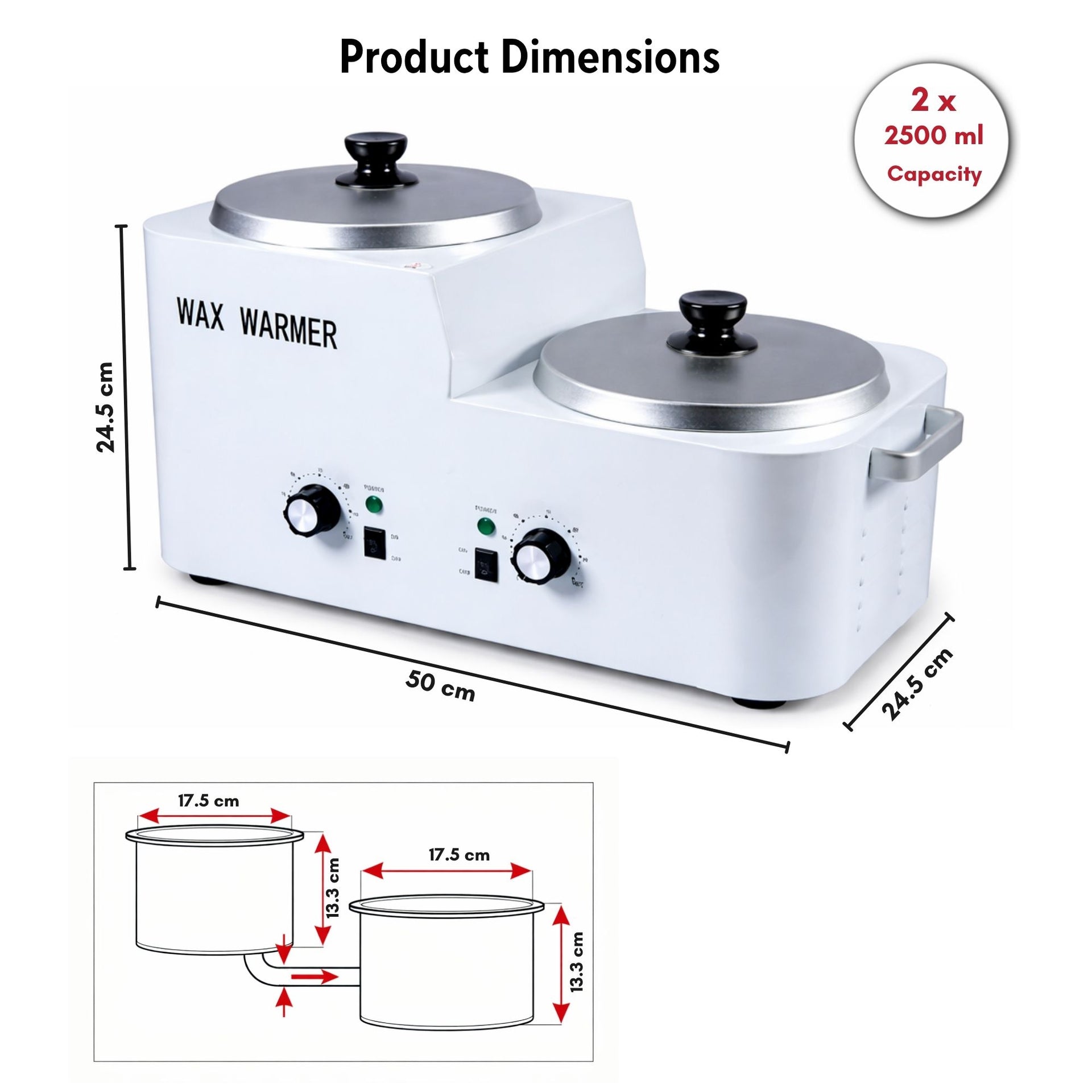 Eson - Professional Dual Pot Wax Warmer and Paraffin Heater Machine 500W is designed for efficient wax melting and dependable heat retention in busy salons, spas and beauty treatment rooms. Its dual-pot design allows you to prepare one type of wax while keeping another ready at a working temperature, helping to improve workflow during treatments. With a generous 2 x 2500 ml capacity, this machine is well suited to professional waxing, paraffin treatments and regular daily use. The separate control knobs allow each pot to be managed individually for better flexibility and convenience. The aluminium pots and lids support even heat distribution, while the sturdy housing offers a professional and practical finish. This unit is suitable for wax tins, paraffin wax, wax blocks, wax beads and similar formulations. It is a reliable choice for businesses seeking a professional, high-capacity wax heating solution.