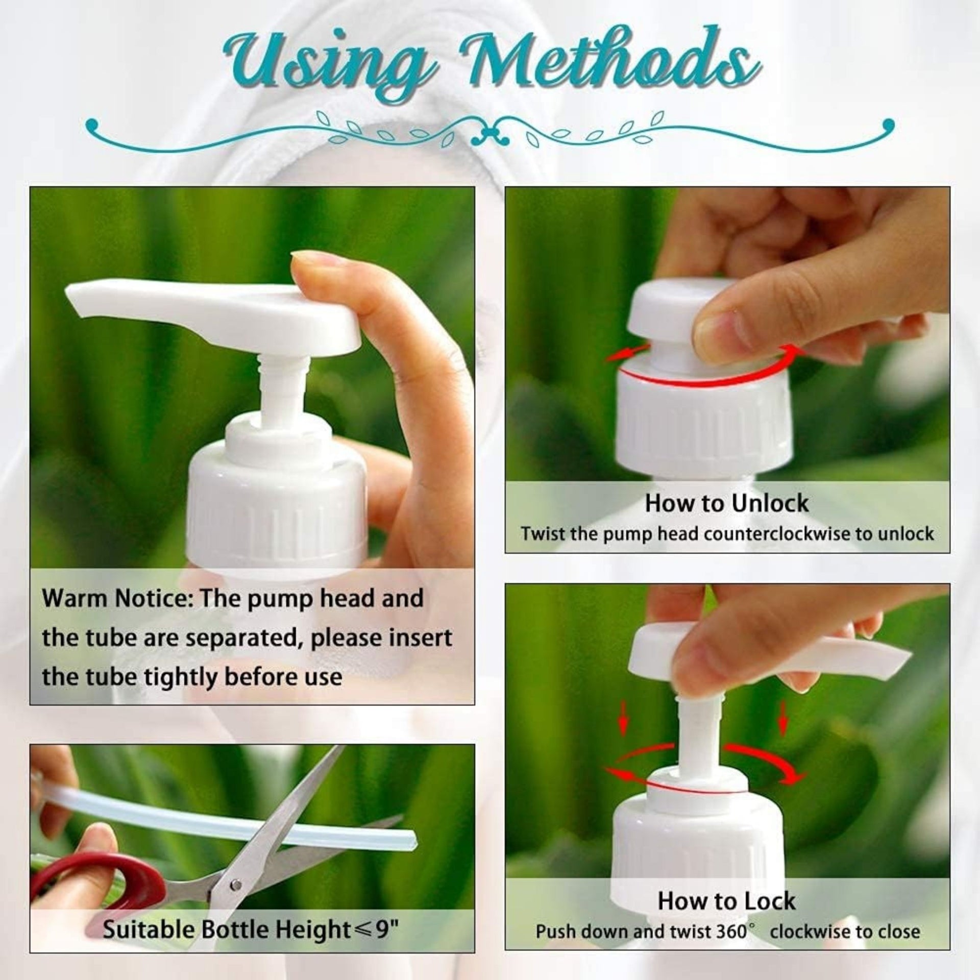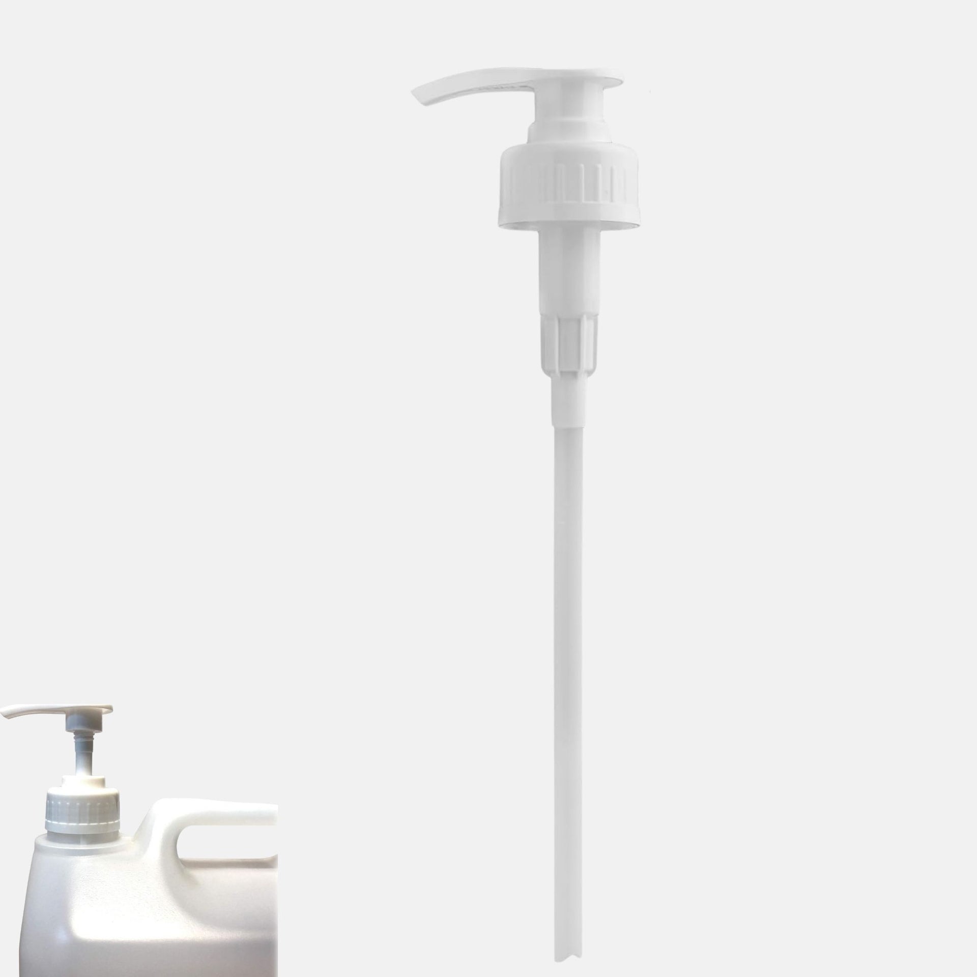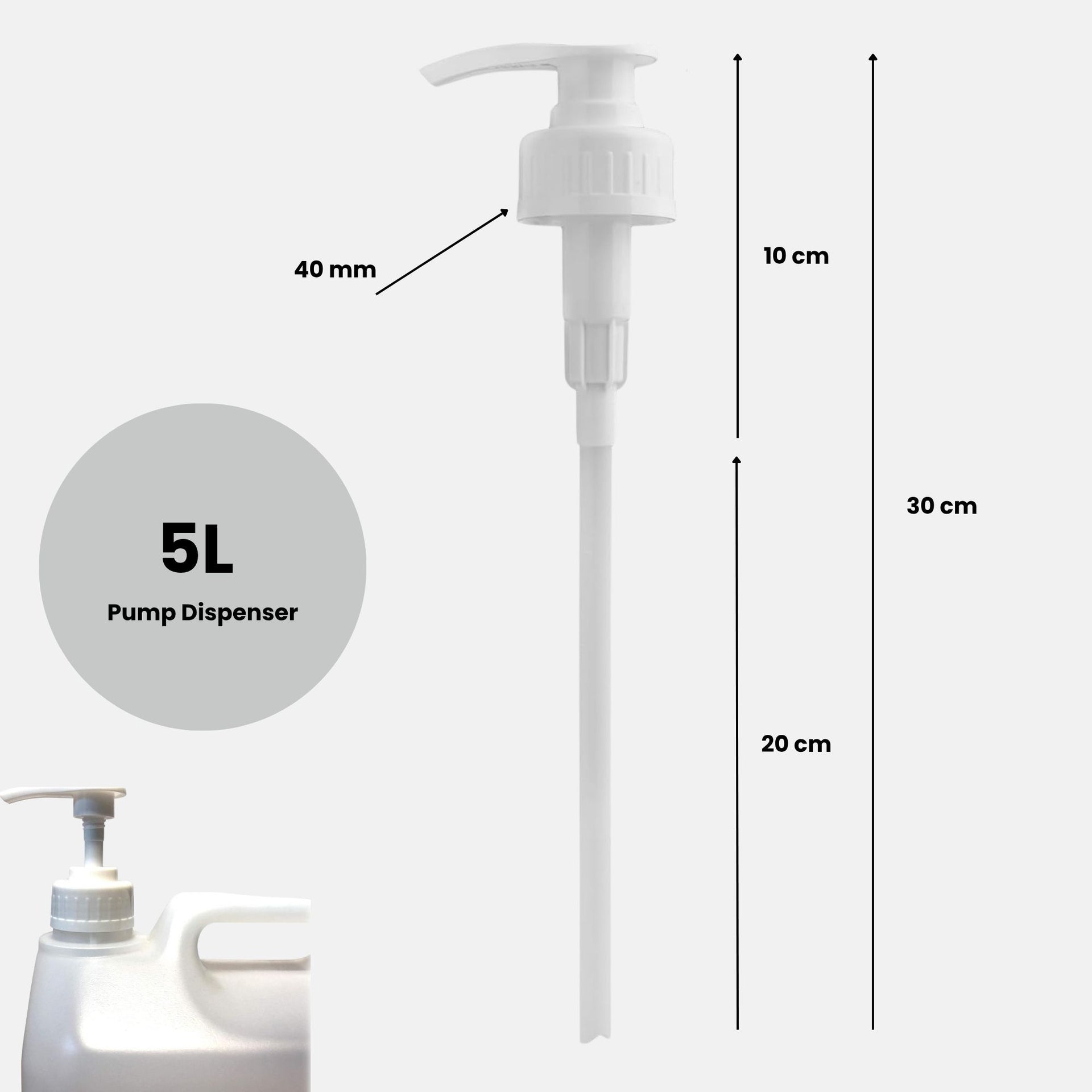 Simply remove the original cap from your 5-litre container, insert the extended tube into the bottle, and securely screw the pump onto the 38mm neck until tight. To operate, unlock the pump by twisting the top section clockwise whilst holding the base, then press down firmly for controlled dispensing; lock when not in use by twisting in the opposite direction.