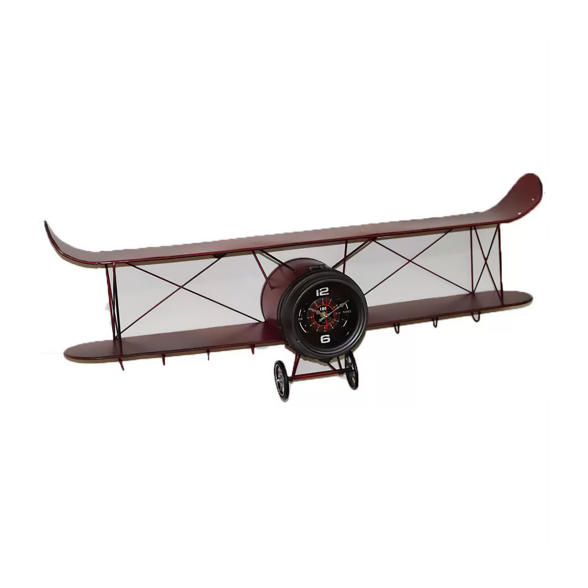This unique wall clock is designed to impress with its authentic vintage finish and detailed craftsmanship. The airplane wings double as shelves, providing functional space for displaying ornaments or trophies. The useful hanging hooks on the underside and the hidden cylindrical compartment behind the clock add to its practicality and convenience. Whether placed in a living room, bedroom, or office, this wall clock is sure to command attention and spark conversations.The Eson - Retro Metal Wall Clock with Airplane is more than just a timepiece; it's a piece of art that brings a rustic, nostalgic look to any room.