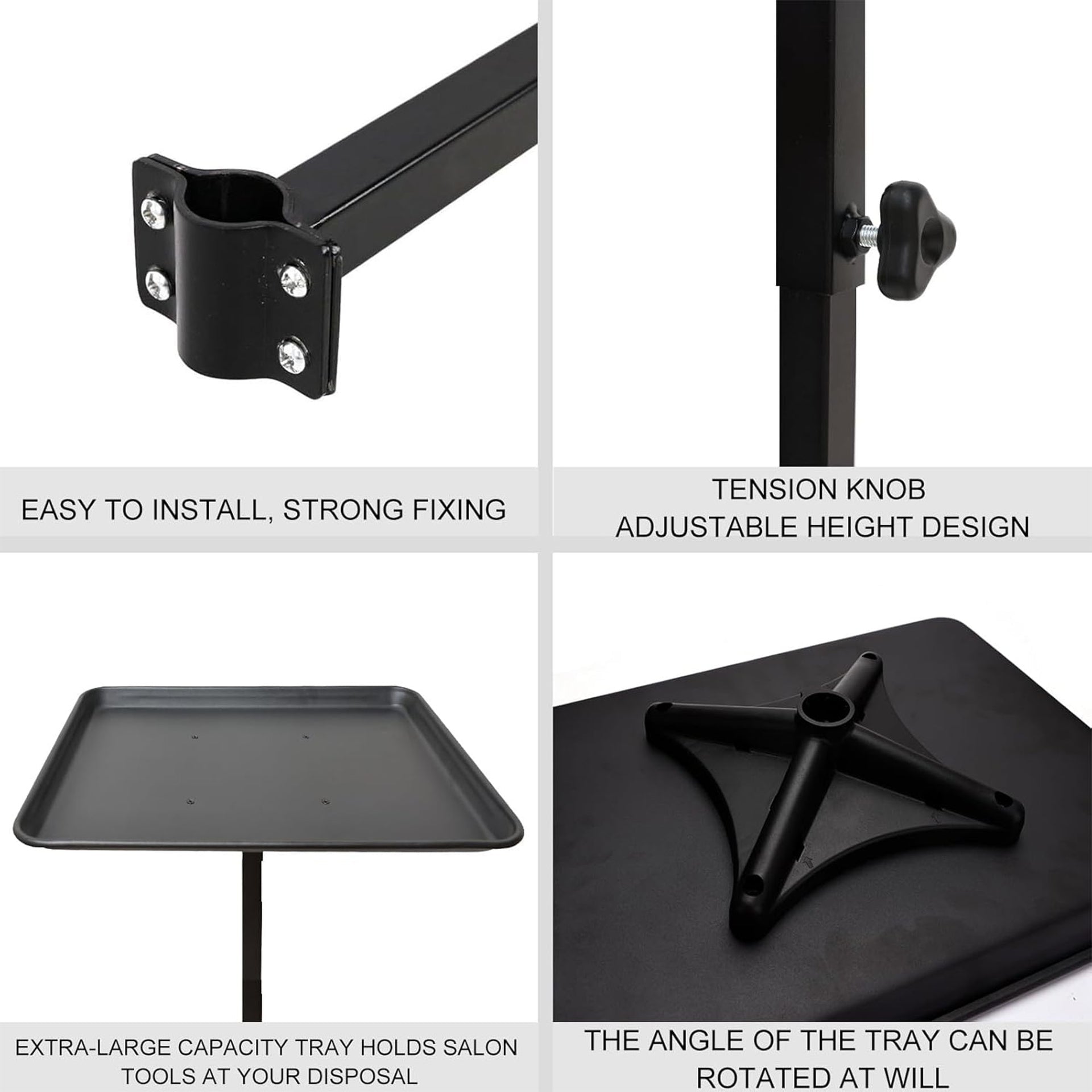 Attach securely to chair base, adjust height and angle as needed, lock all mechanisms before use, and position tools and products within easy reach.