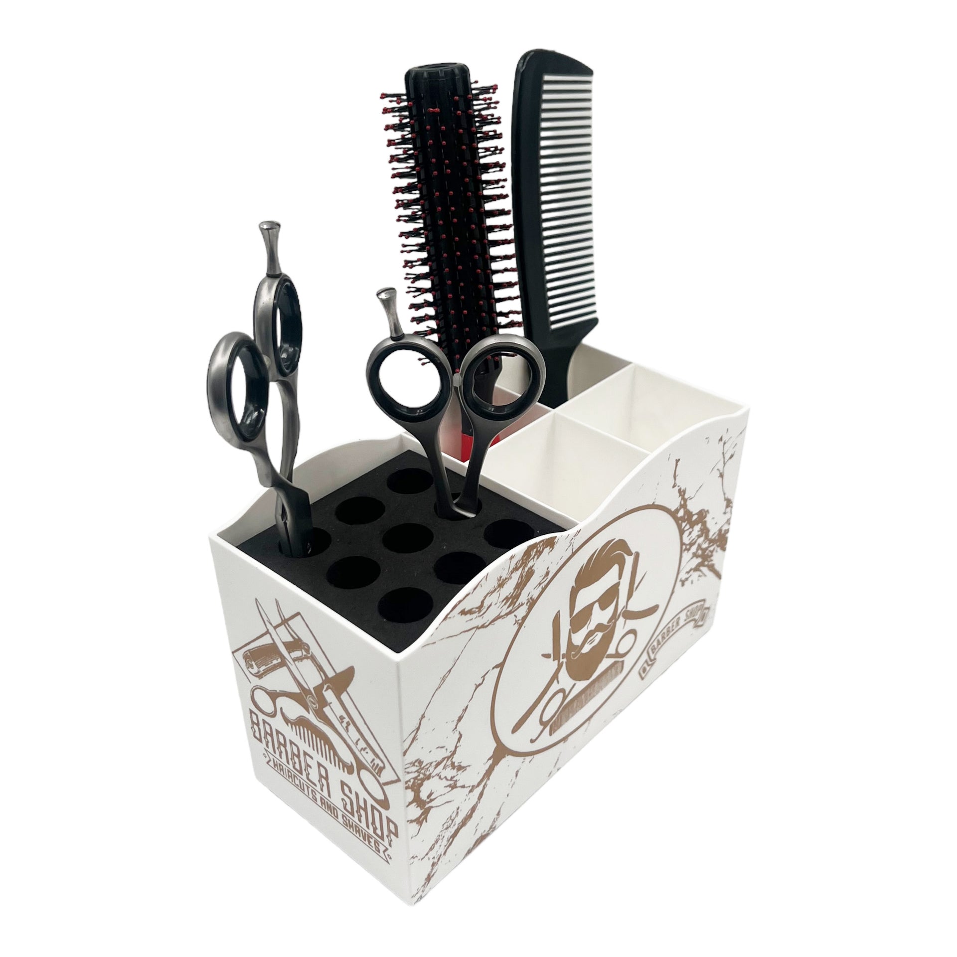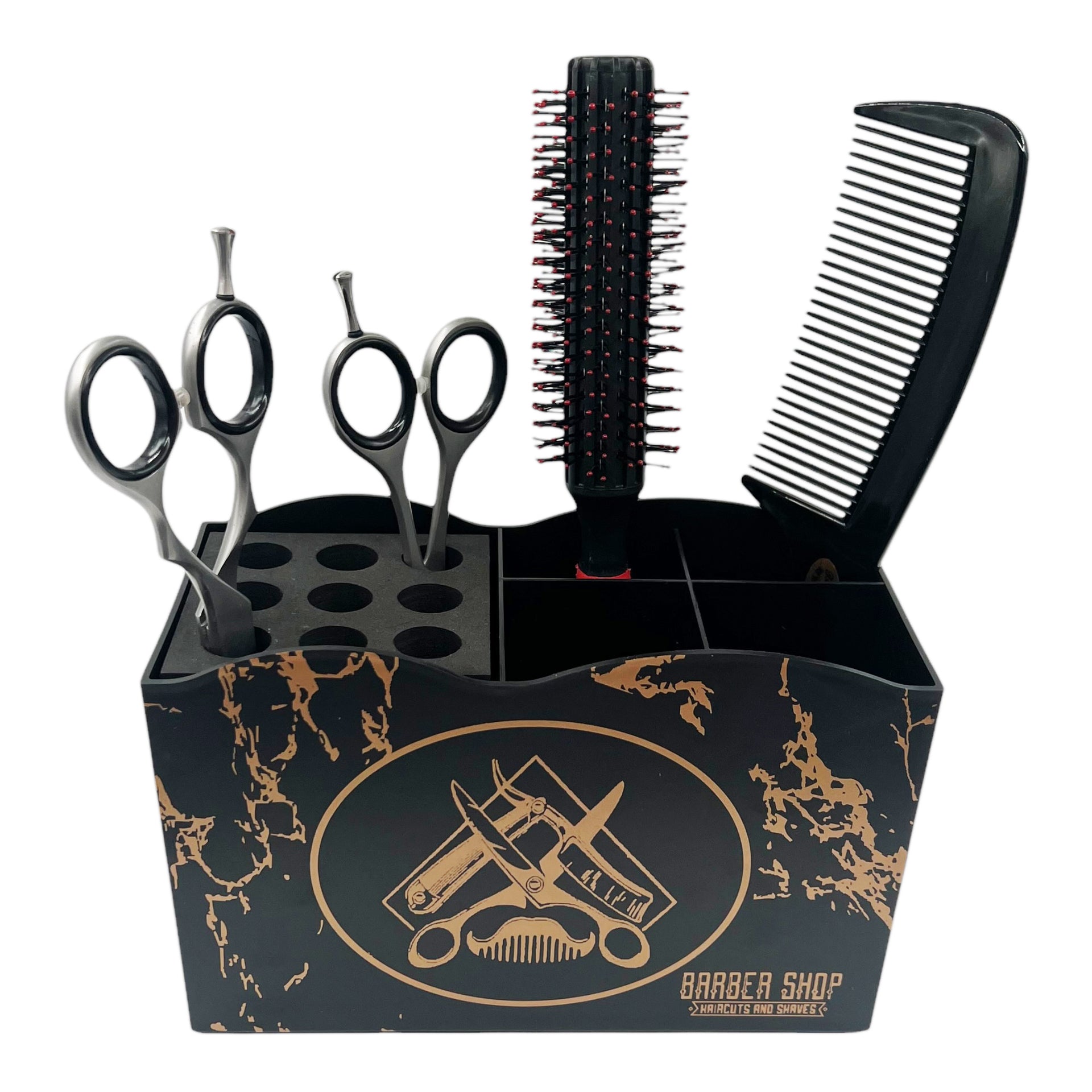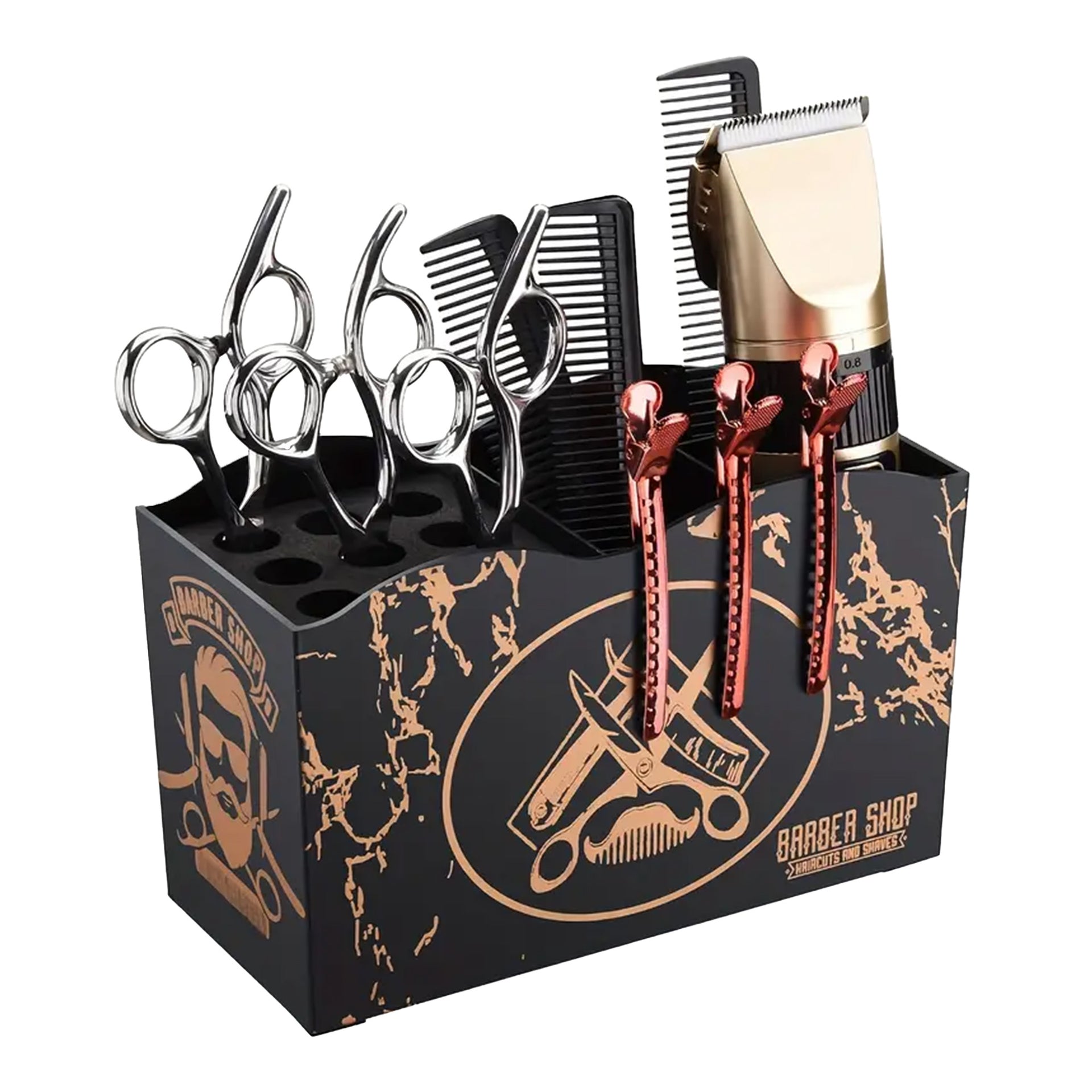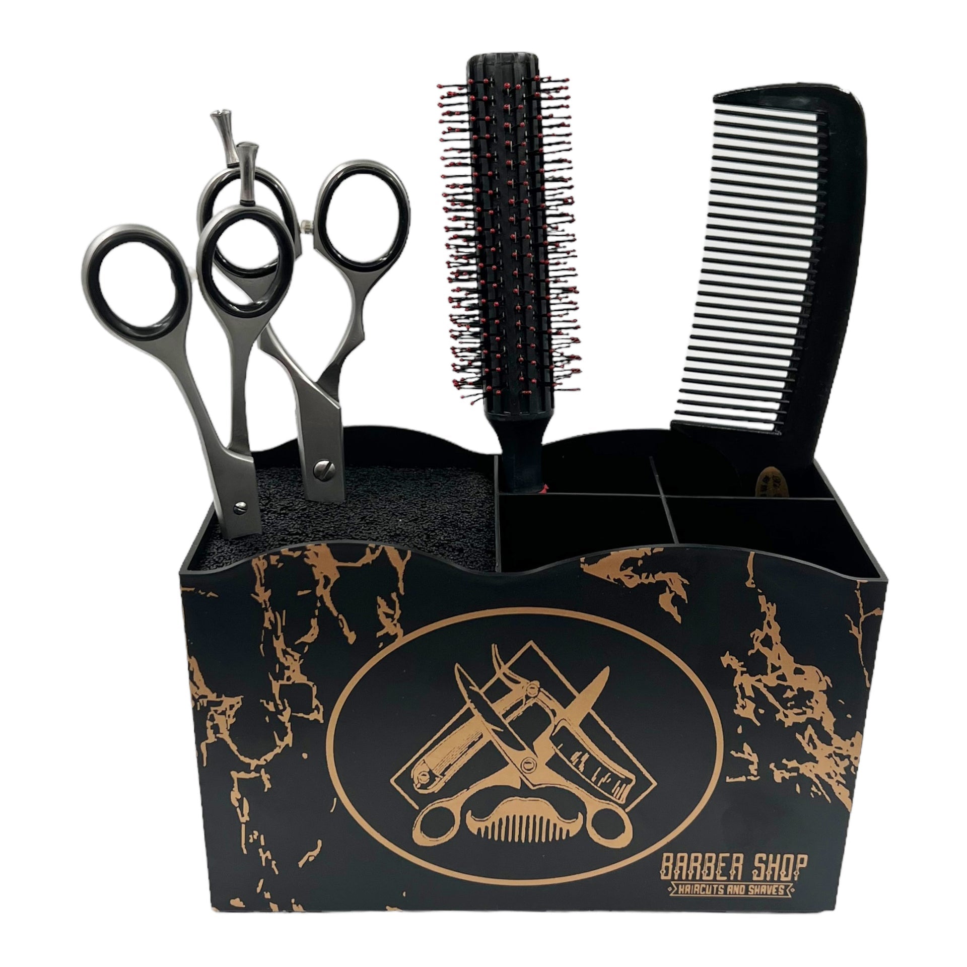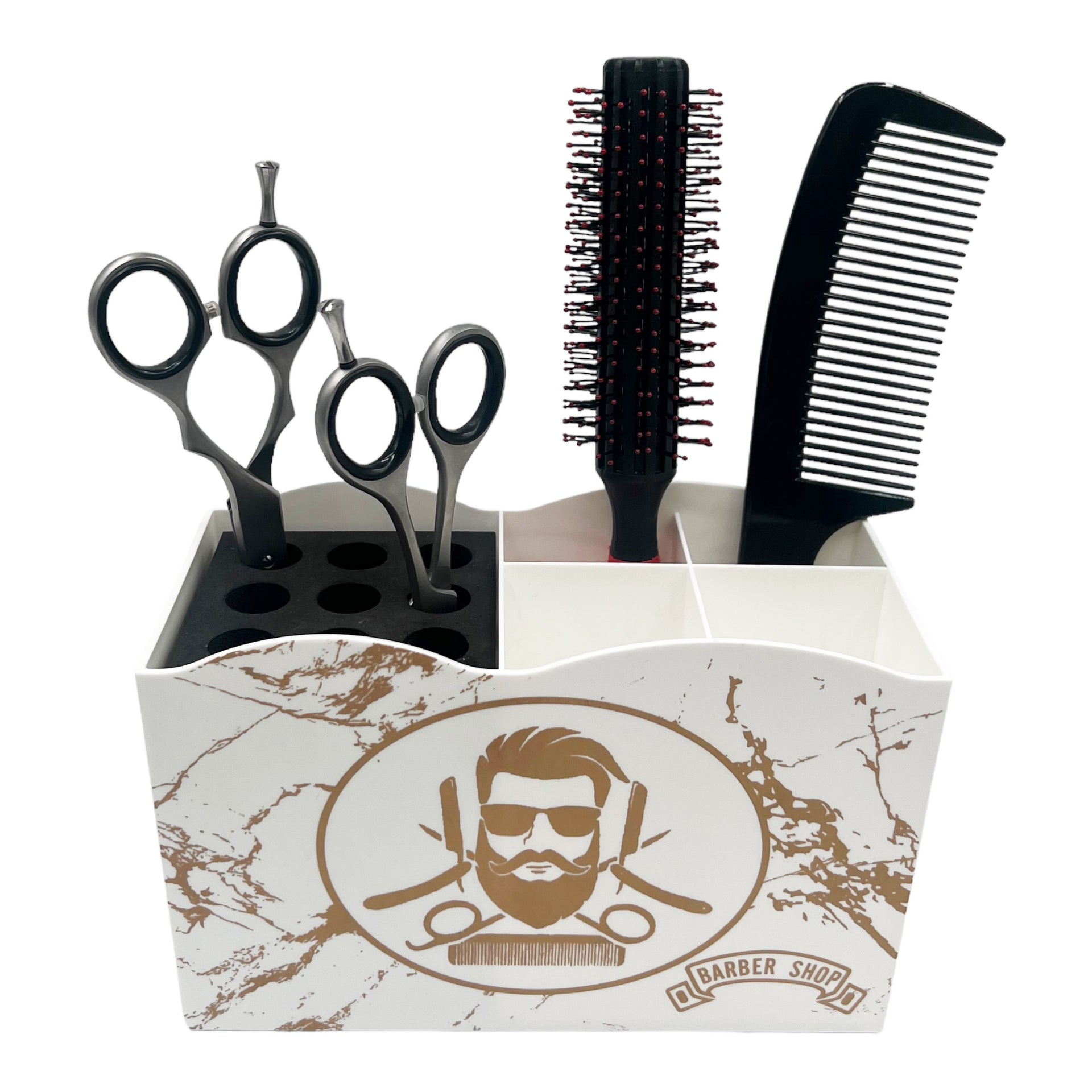 Enhance your salon or barbershop with the Eson - Scissor & Brush Holder Non-Slip collection, a range of stylish and functional solutions for storing your essential styling tools. These organisers provide a sturdy and chic solution for keeping your scissors, clippers, combs, and brushes neatly stored and always within easy reach. Crafted from high-quality, durable materials, each holder features a beautiful marble-effect gold pattern that complements any professional décor. The thoughtful design ensures your valuable tools stay safely in place, even in busy environments.